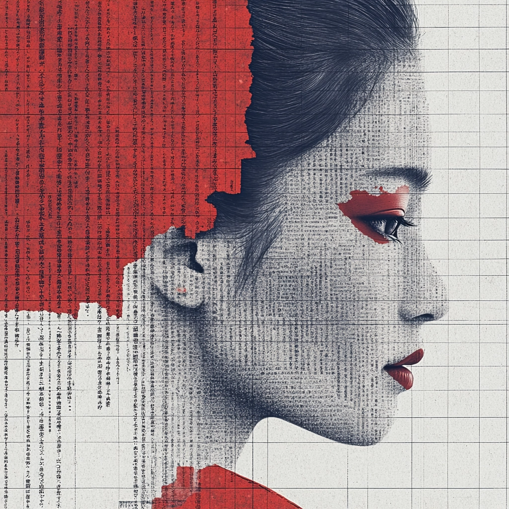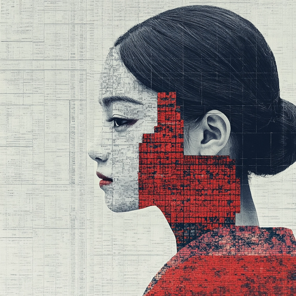 The work features stark lighting that brings out bold color contrasts and sharp edges. There is a textural interplay between the flat backgrounds and the intricate line details, resulting in a layered spatial effect. Soft gray tones merge with vibrant reds, creating a strong color dynamic and enhancing the depth and intensity of the textures.