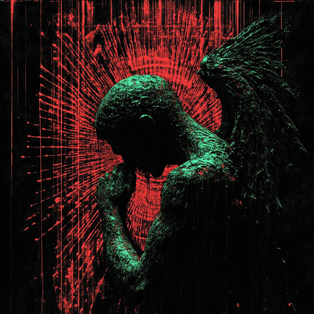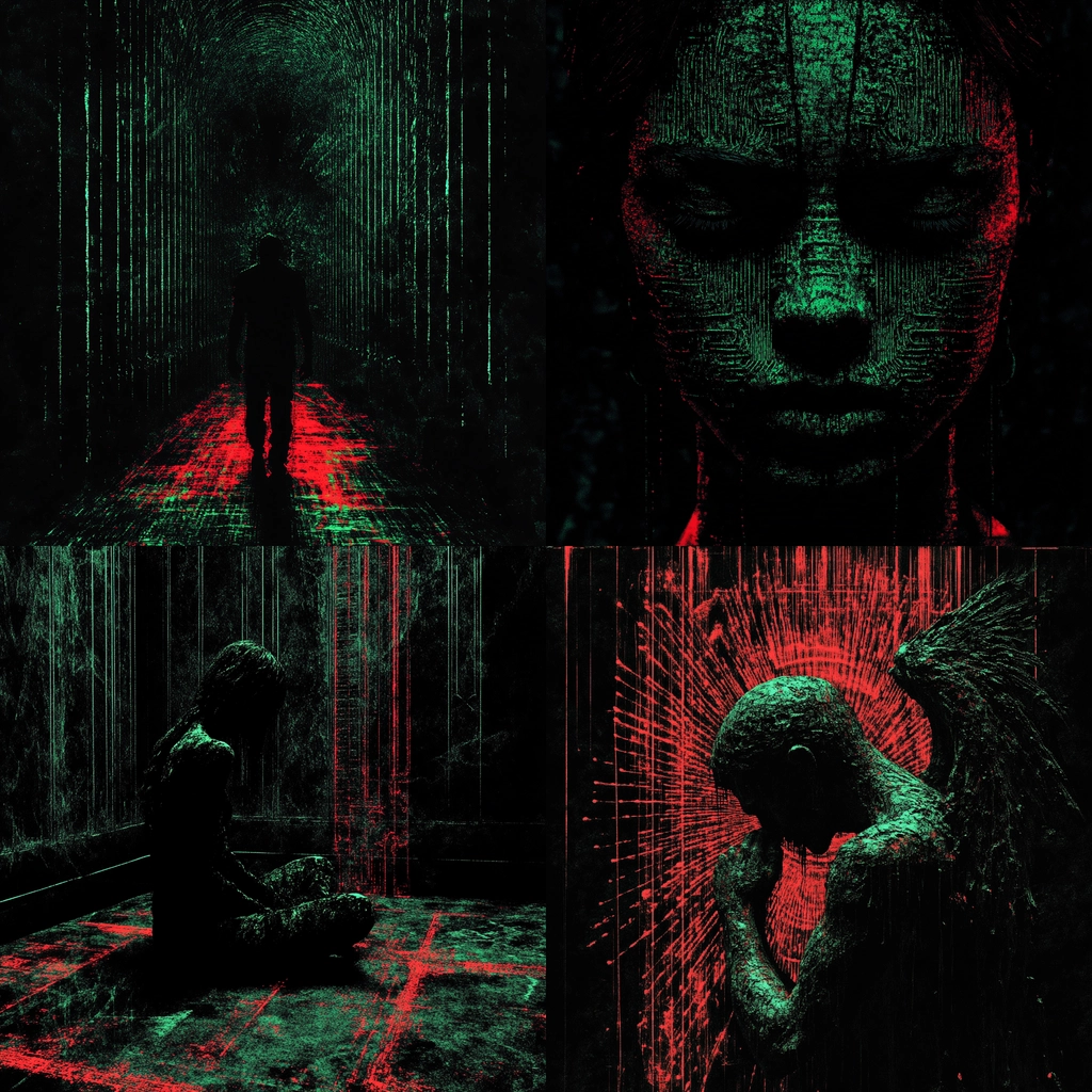 The composition uses contrasting red and green colors with dark backgrounds, creating a vibrant, yet solemn atmosphere.