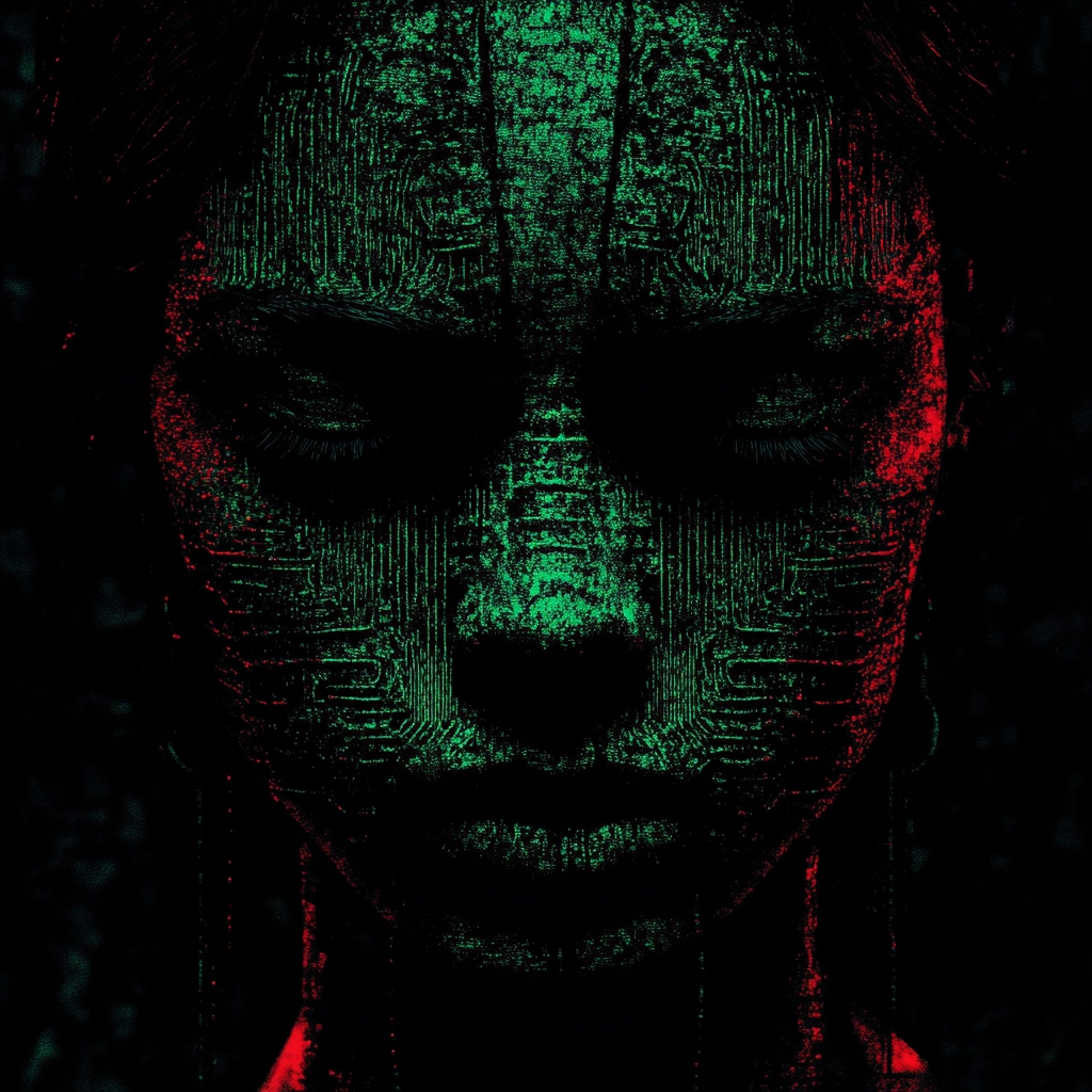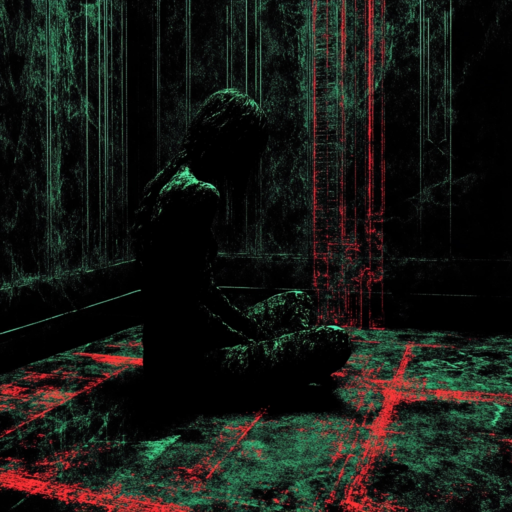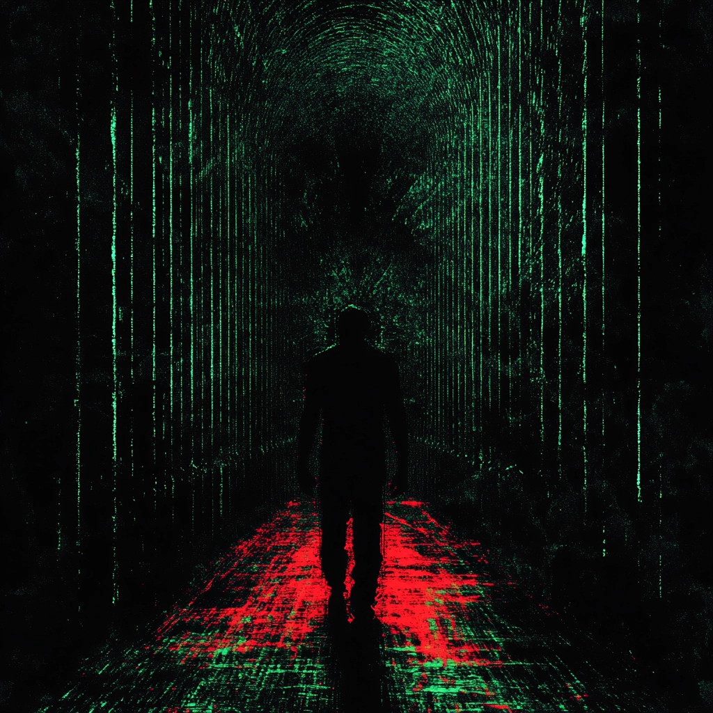 The artwork employs vivid neon-like lighting that emphasizes contrasts between red and green colors, presenting a striking visual dynamic with dense textural layers. The spatial arrangement creates depth and focus, intensifying the visual experience.