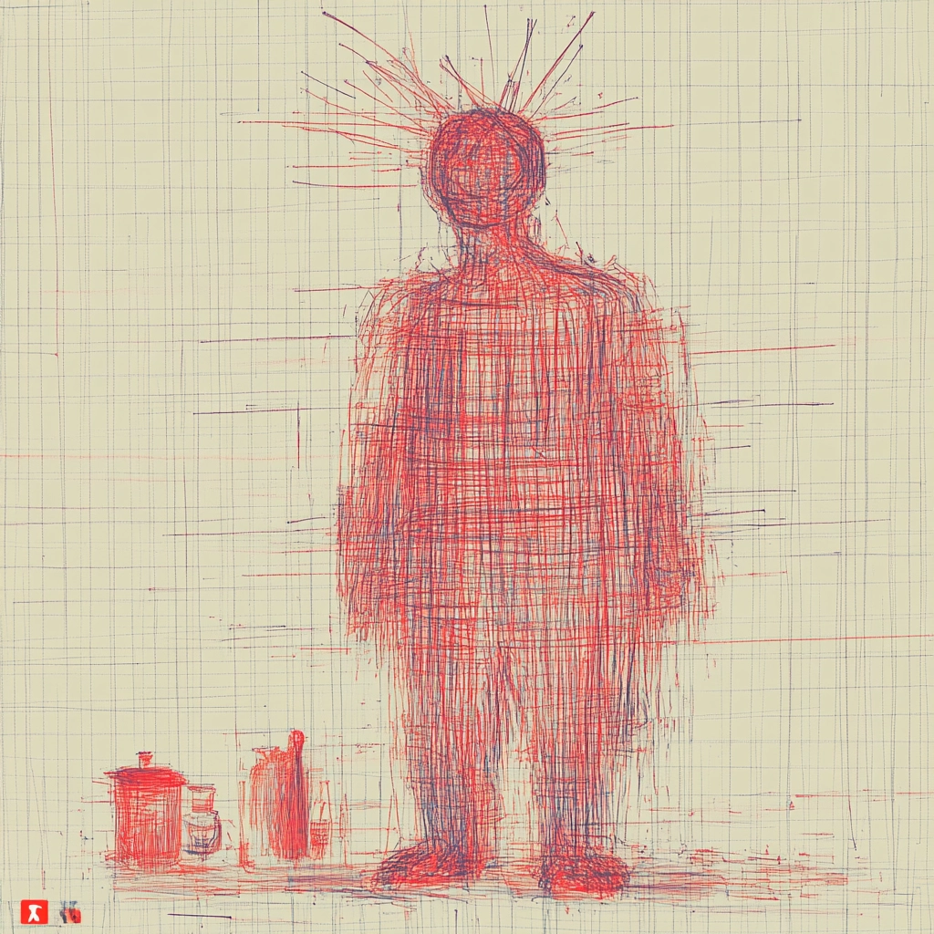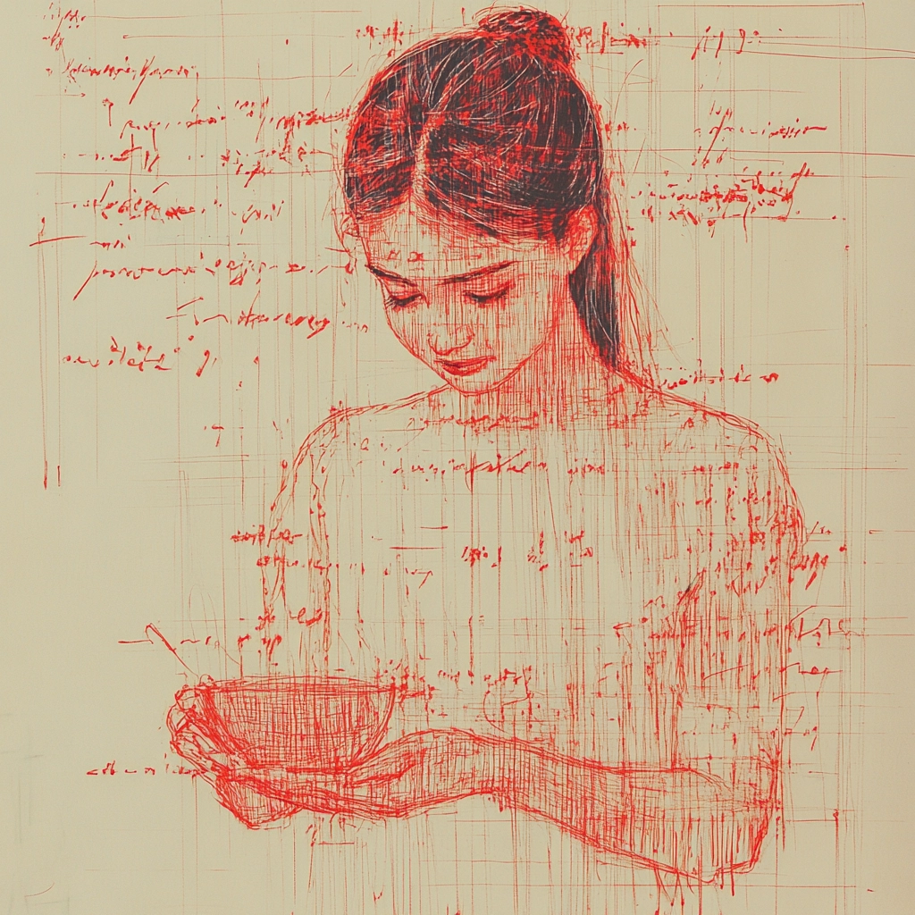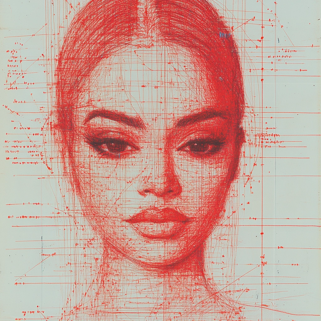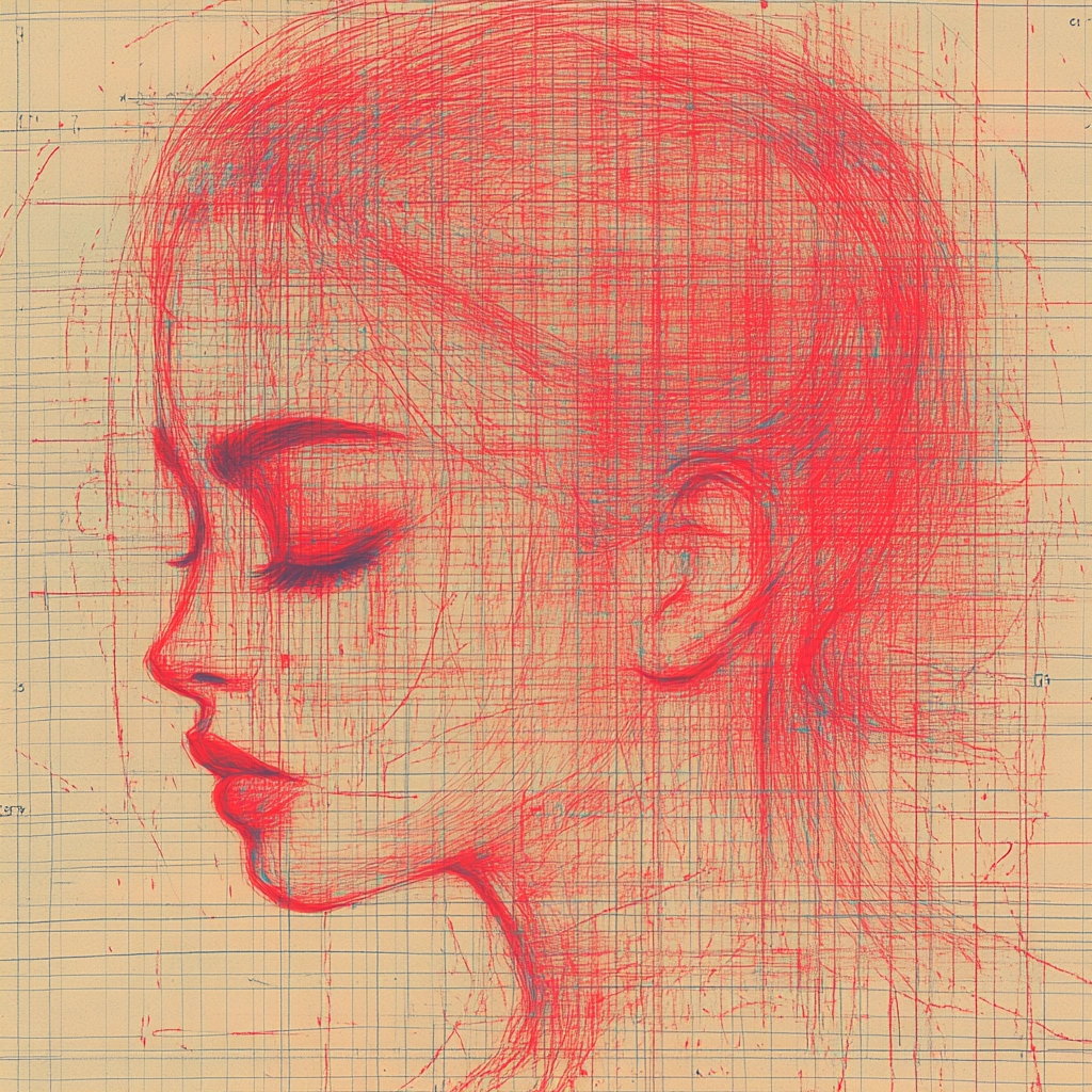 Expressive red lines over a grid background evoke a technical yet artistic illustration.