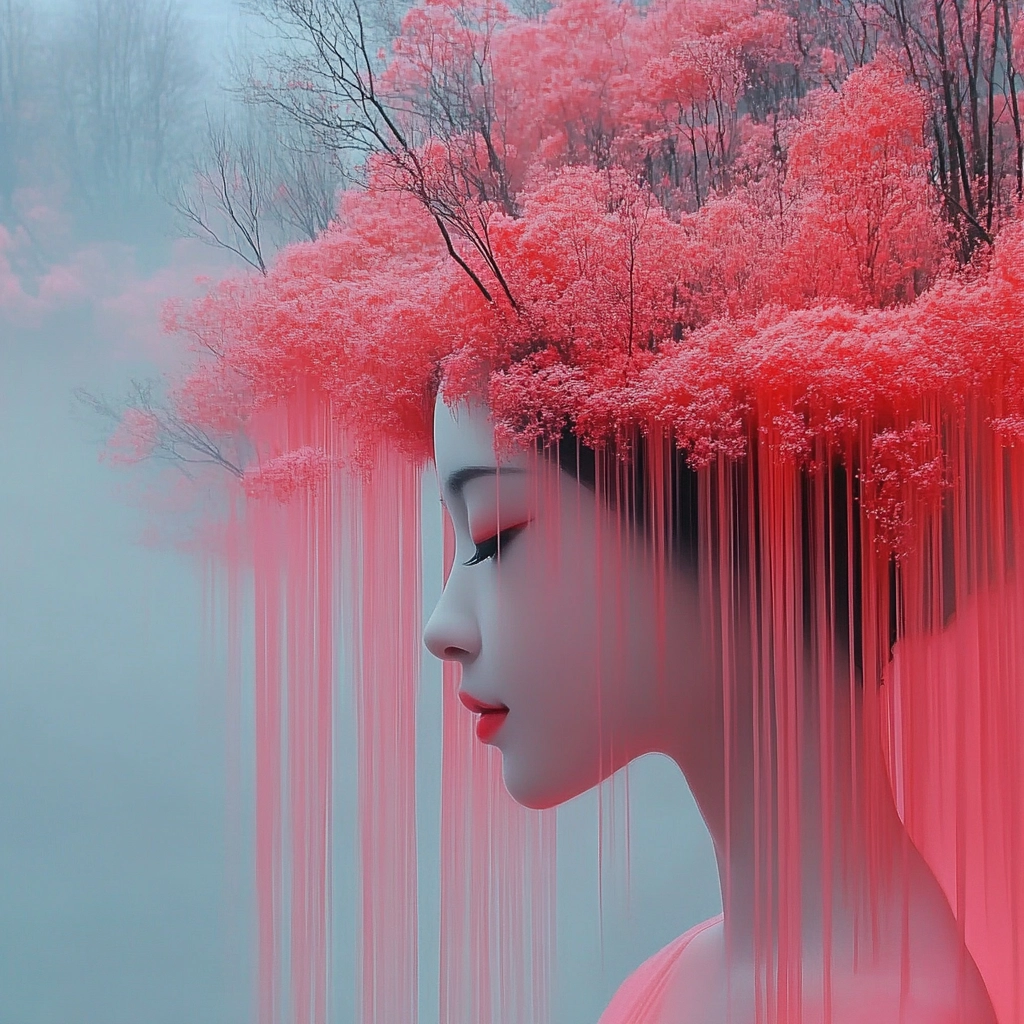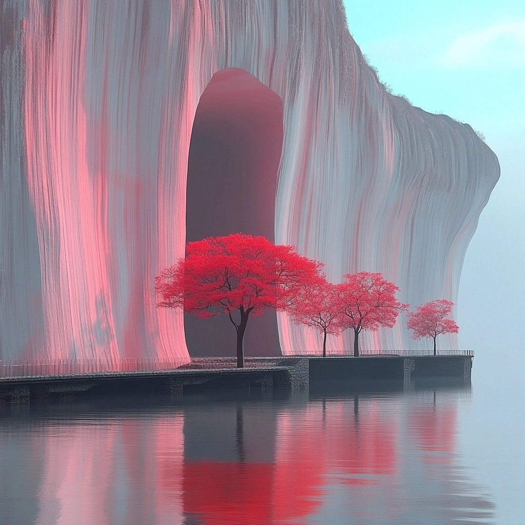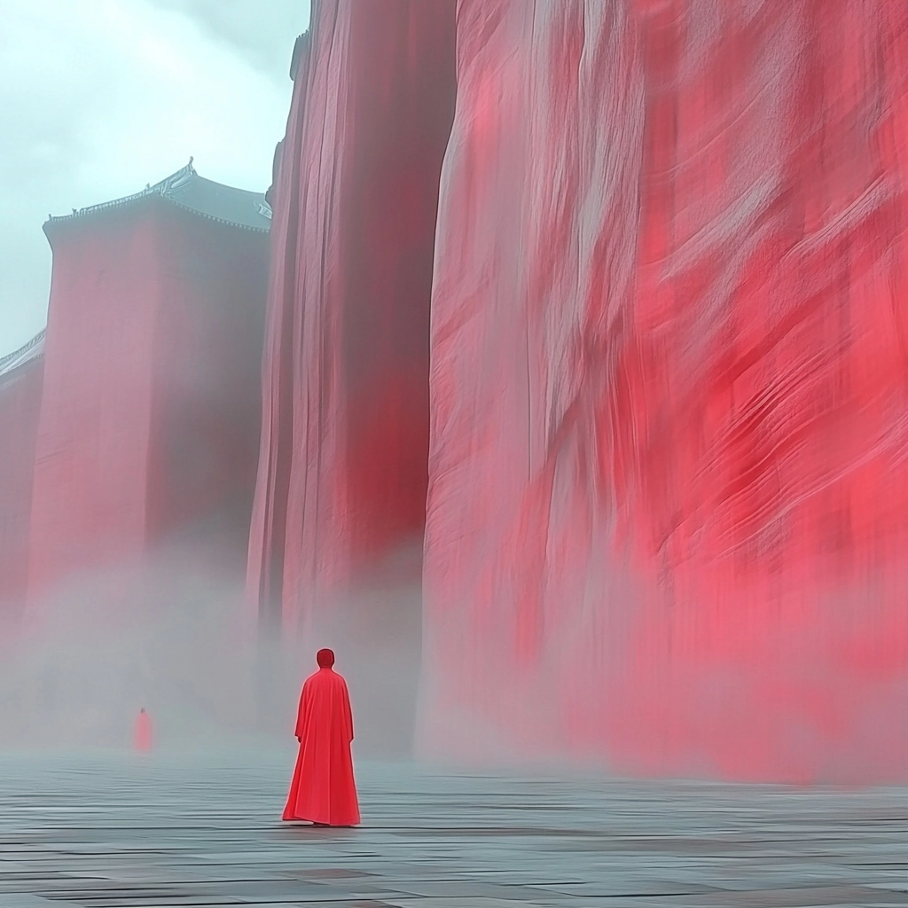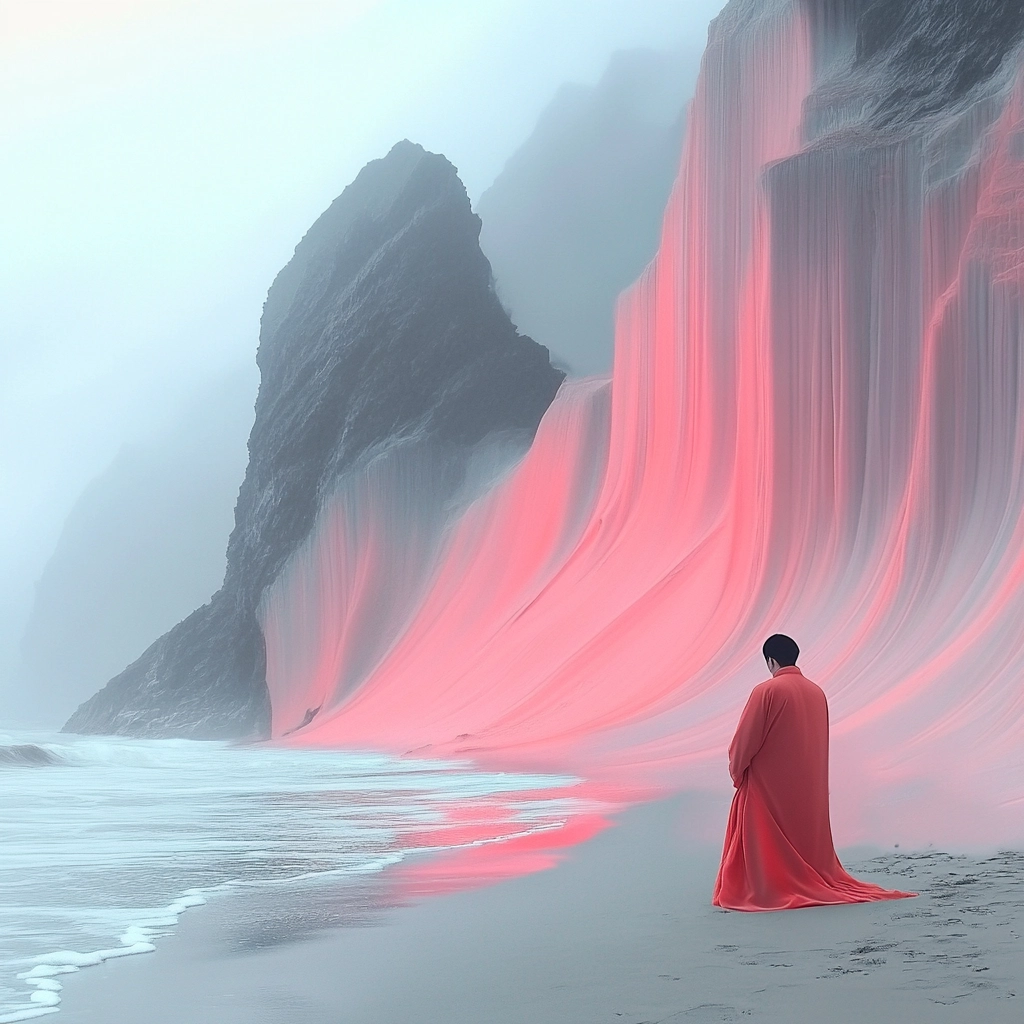 The scene features flowing red tones contrasted with soft gray, creating an ethereal impression. Light is diffused to create a misty effect, while the red appears vibrant and alive, suggesting energy and movement across a calm landscape.