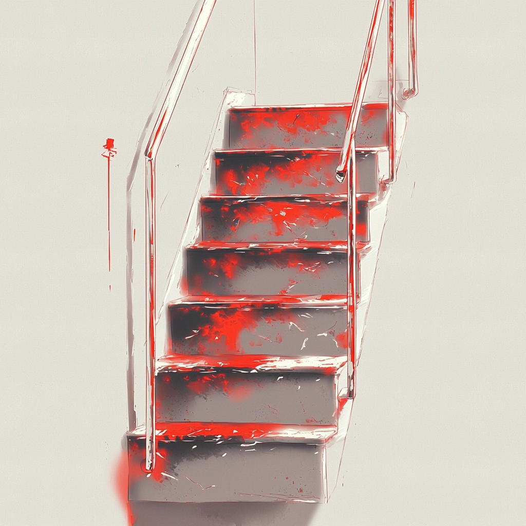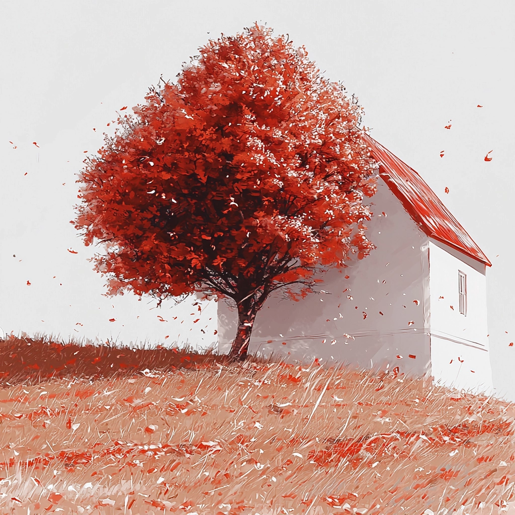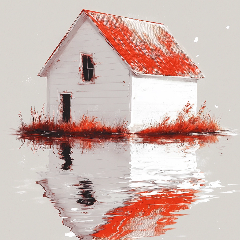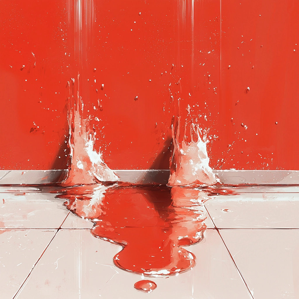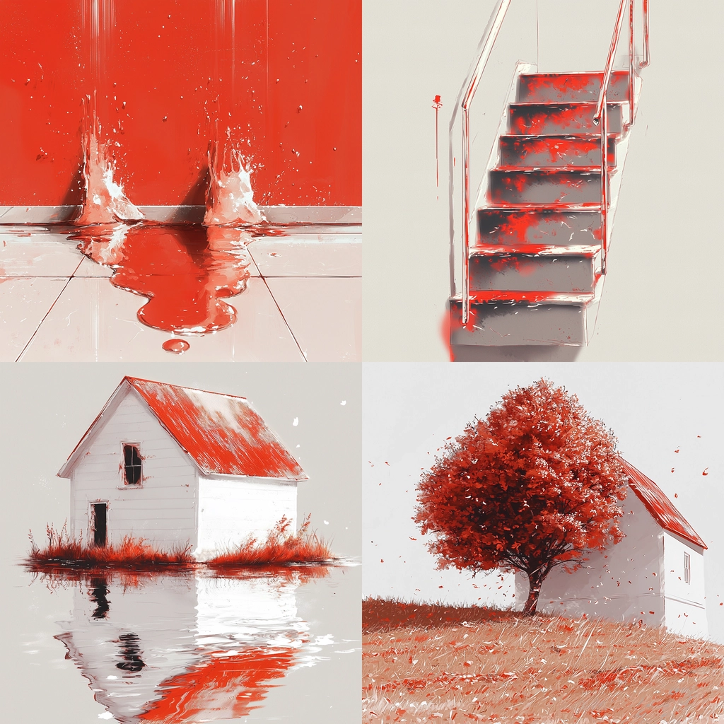 The lighting produces stark contrasts that highlight the dominance of red hues over muted gray and white backgrounds. This creates a surreal spatial depth accentuated by the flowing and reflective textures of surfaces, lending a sense of enhanced dimension.