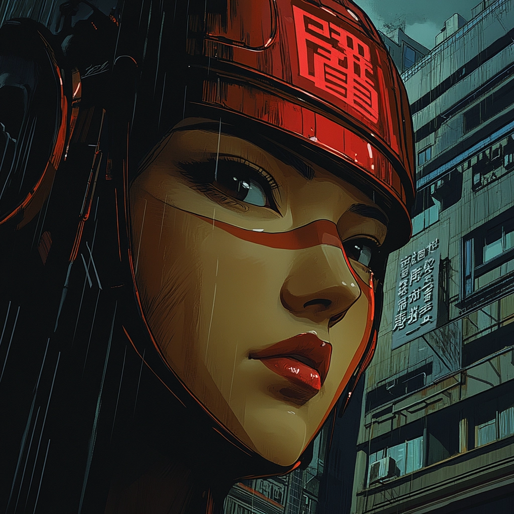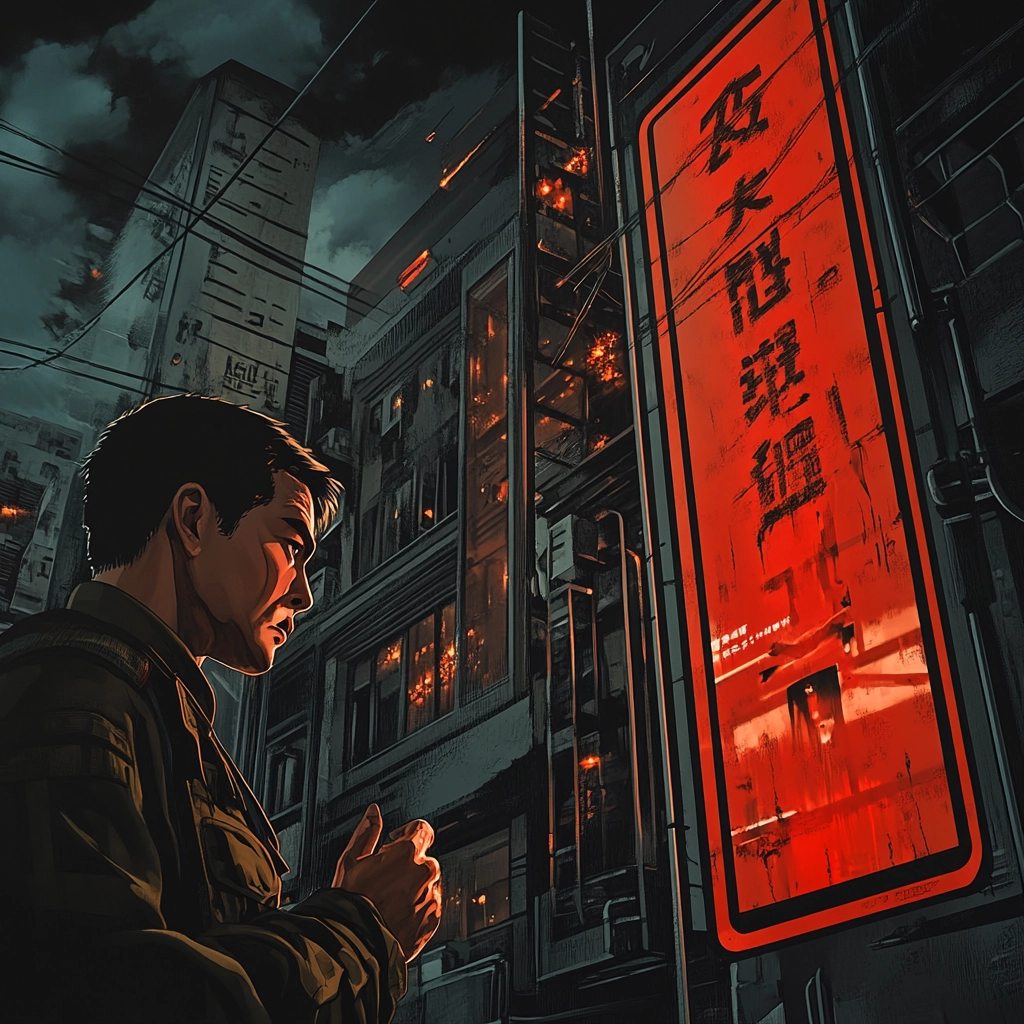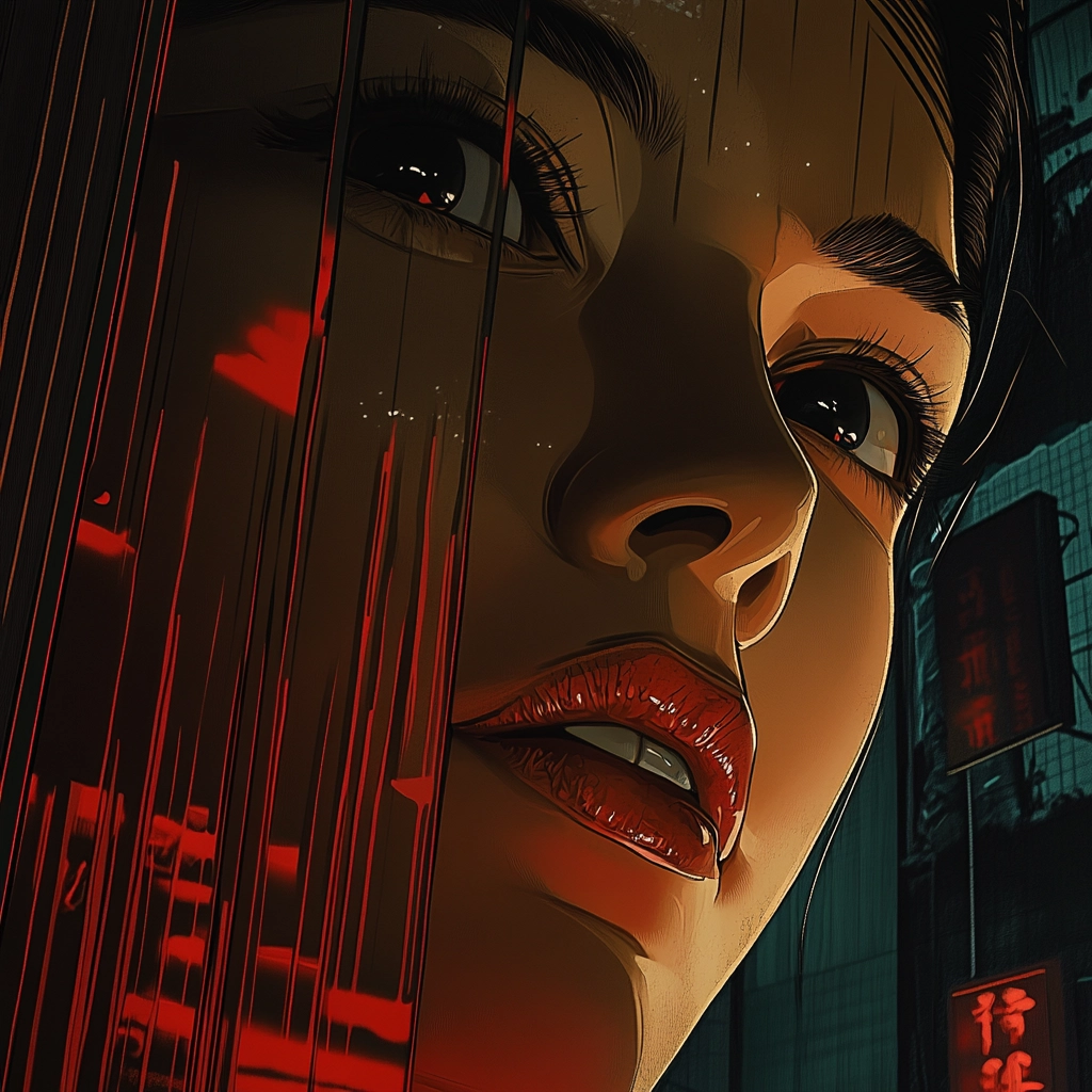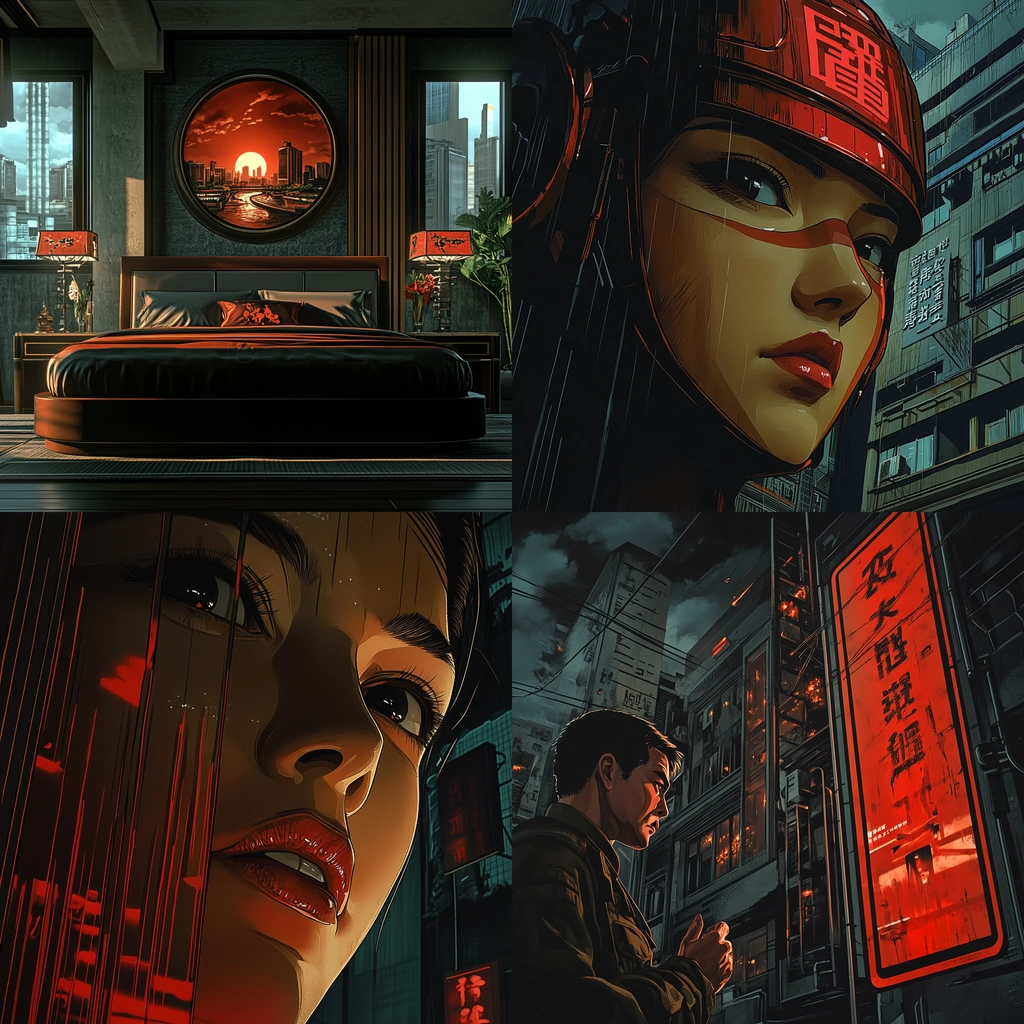 Strong red accents create an intense urban atmosphere amidst dark and muted tones.