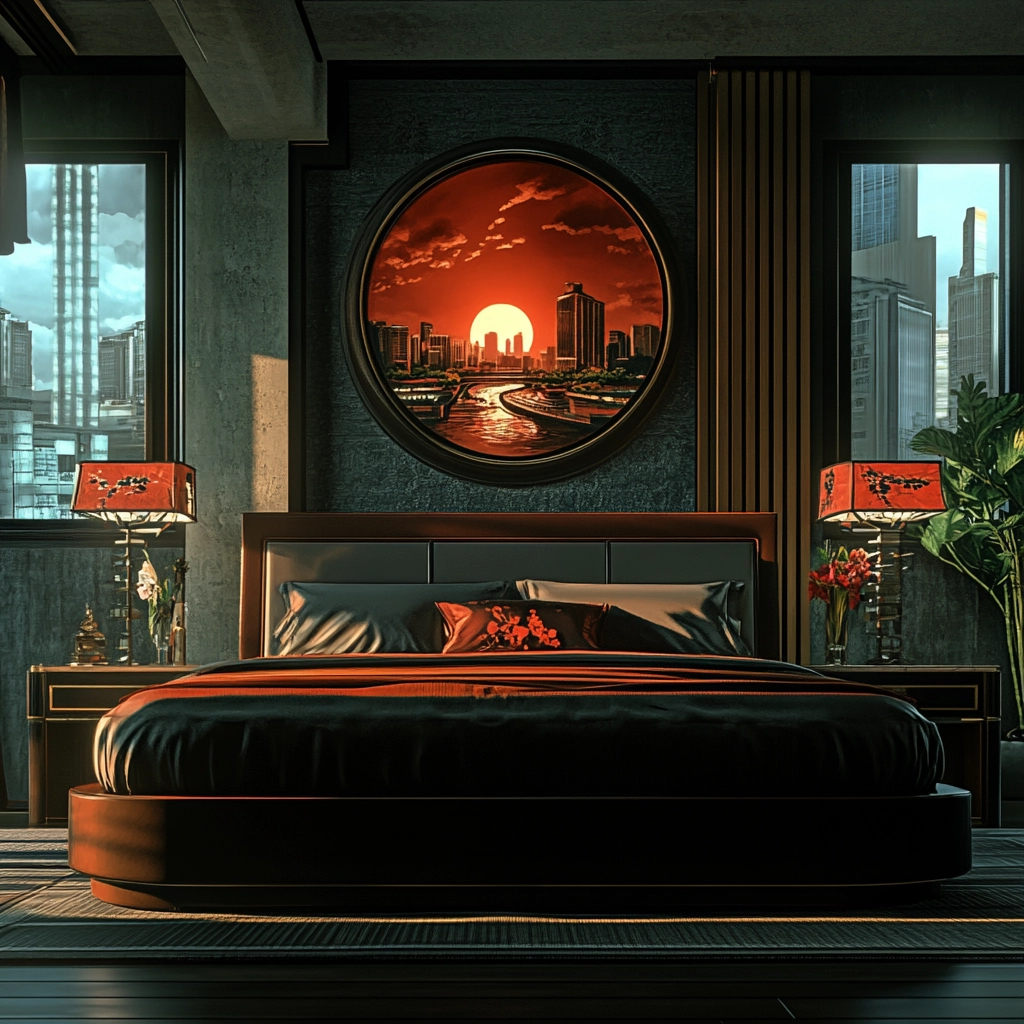 The interplay of light and shadow dramatically heightens the urban setting with bold red neon creating stark contrasts against the black and gray hues. Textures appear polished and smooth, while spatial depth is established through layered architectural elements.