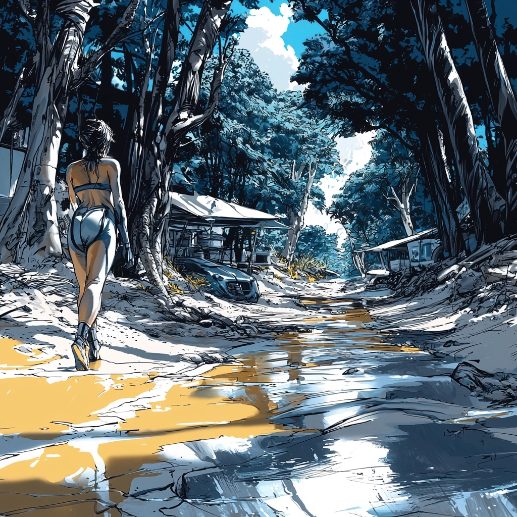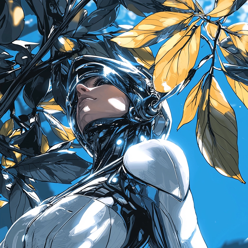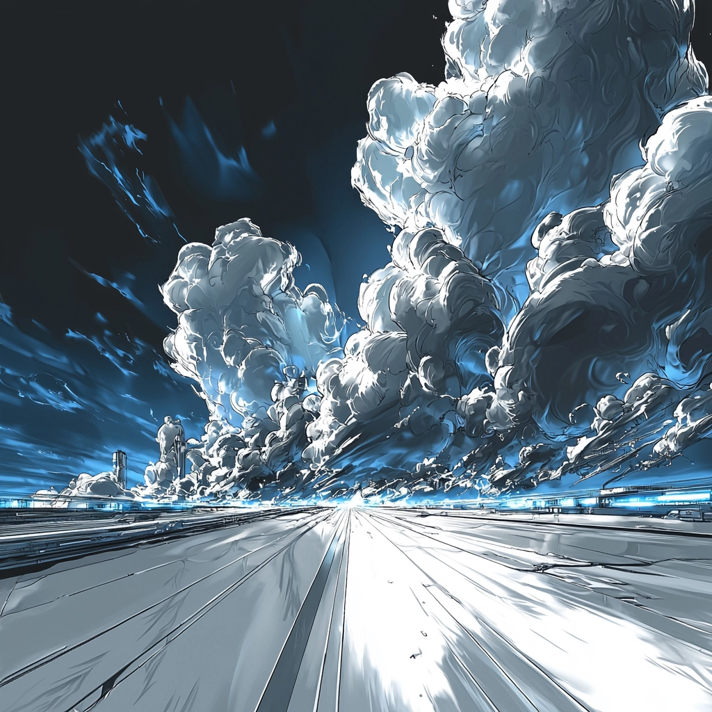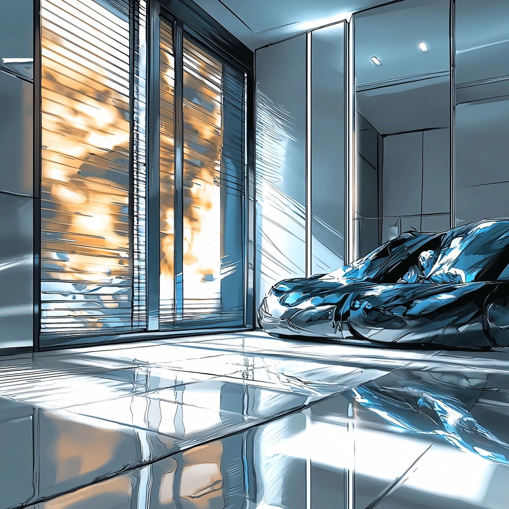 The lighting effects create a metallic sheen that emphasizes the futuristic ambiance. The blue tones dominate the palette, reinforced by stark white highlights and occasional yellow accents. The spatial depth is enhanced by the strong use of perspective lines, while textures range from smooth to highly reflective, adding a dimensional quality to the scenes.