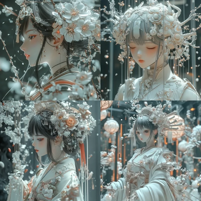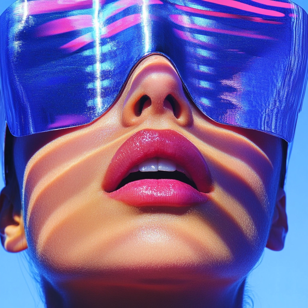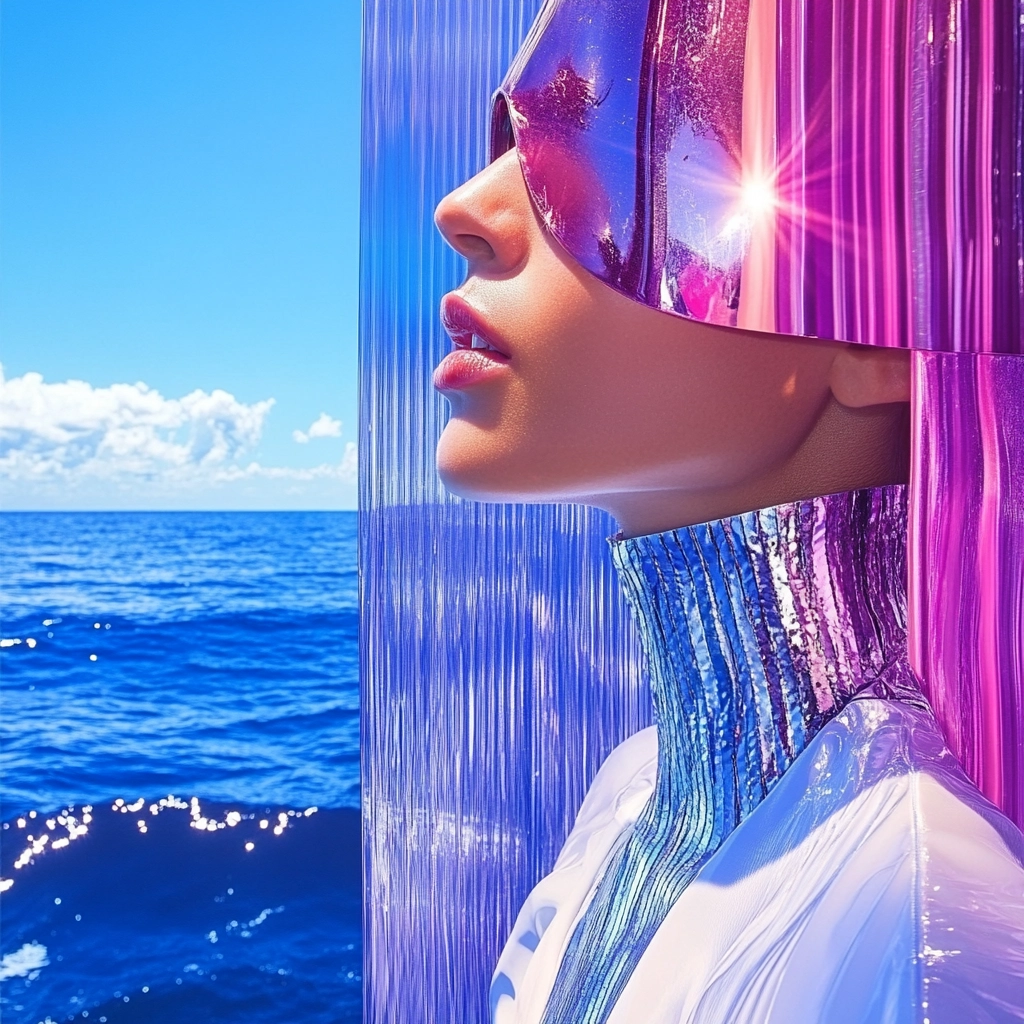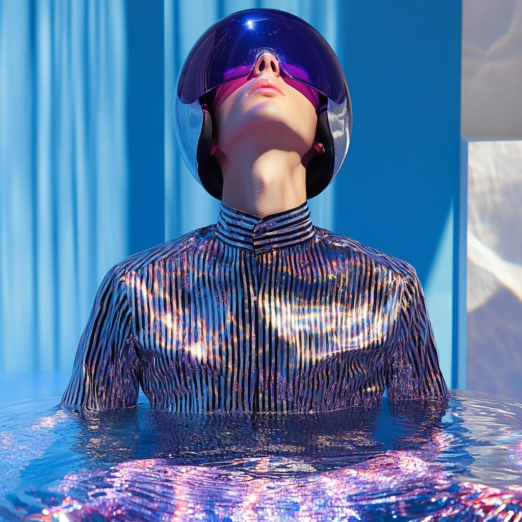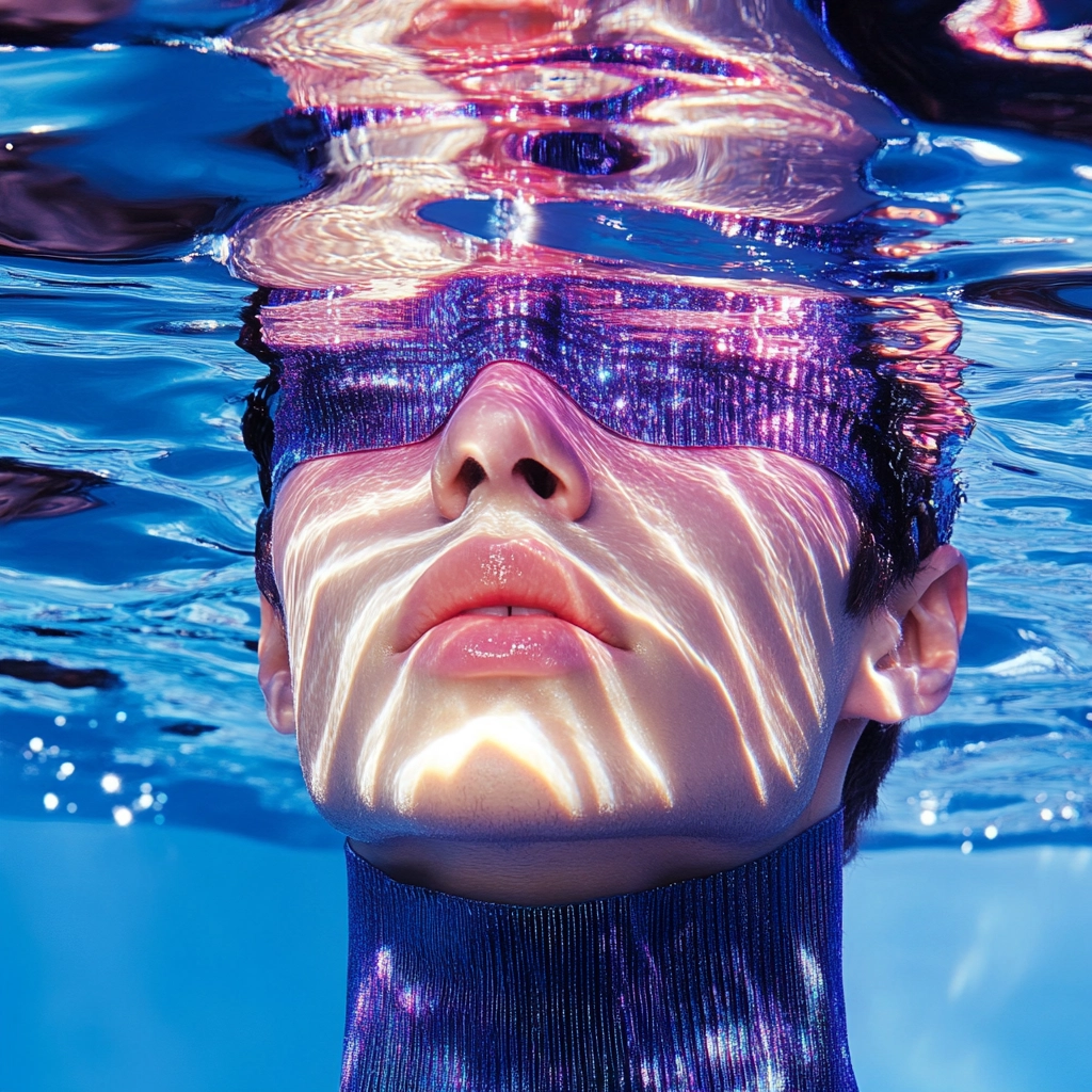 Reflective surfaces create a fluid, almost liquid lighting effect with crisp color transitions and a sense of depth. Contrasting textures highlight the play of light across smooth, polished areas and softer elements.
