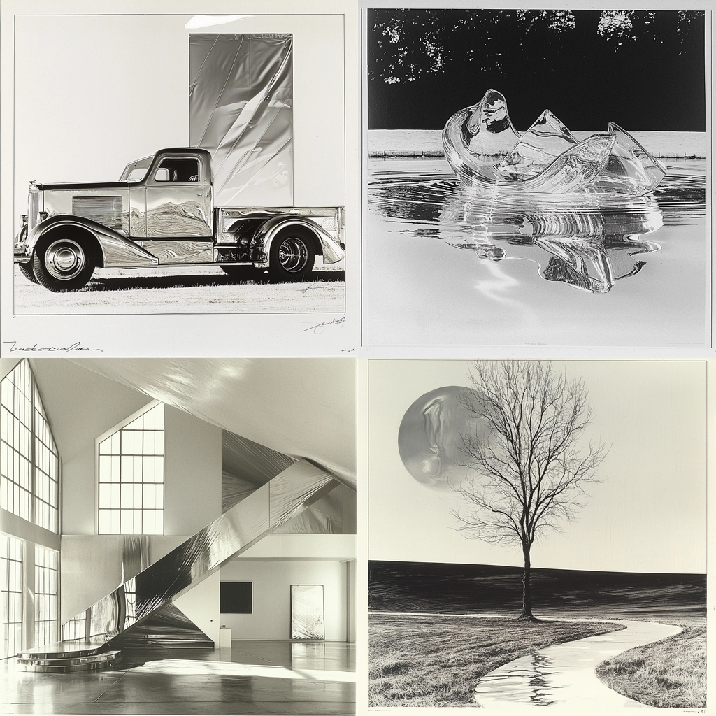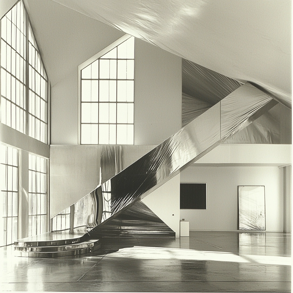 Lighting effects are prominent with reflective surfaces capturing and amplifying ambient light. Monochromatic color scheme heightens contrast and clarity. Spatial sense is enhanced by clean lines and open spaces with texture primarily expressed through smooth, metallic surfaces.