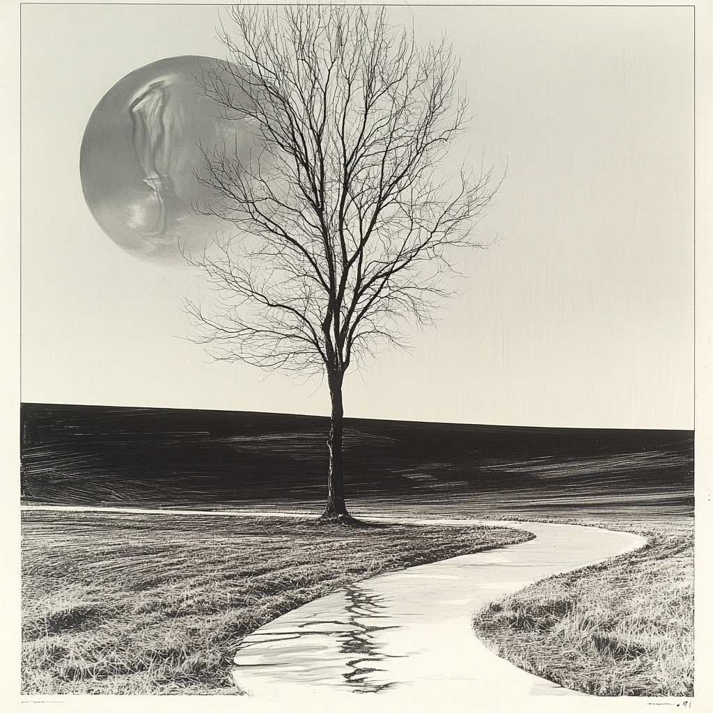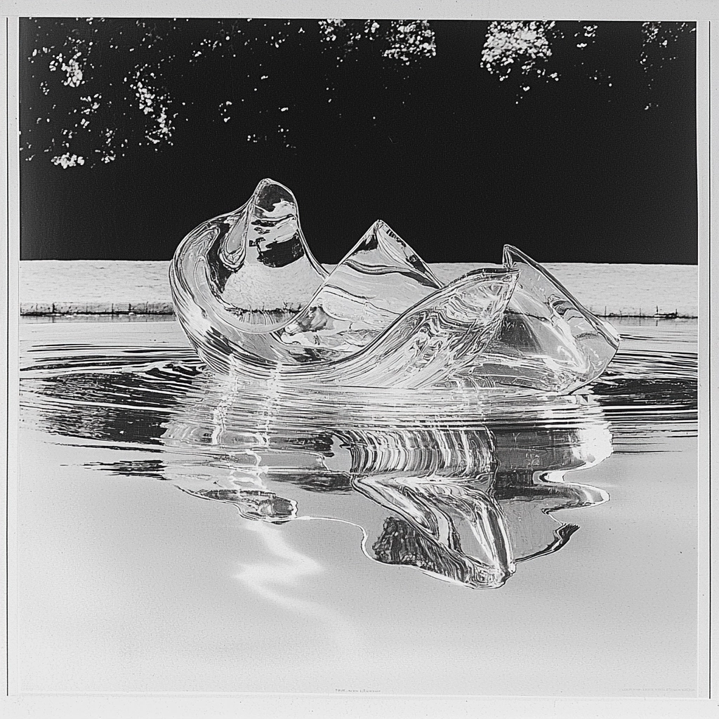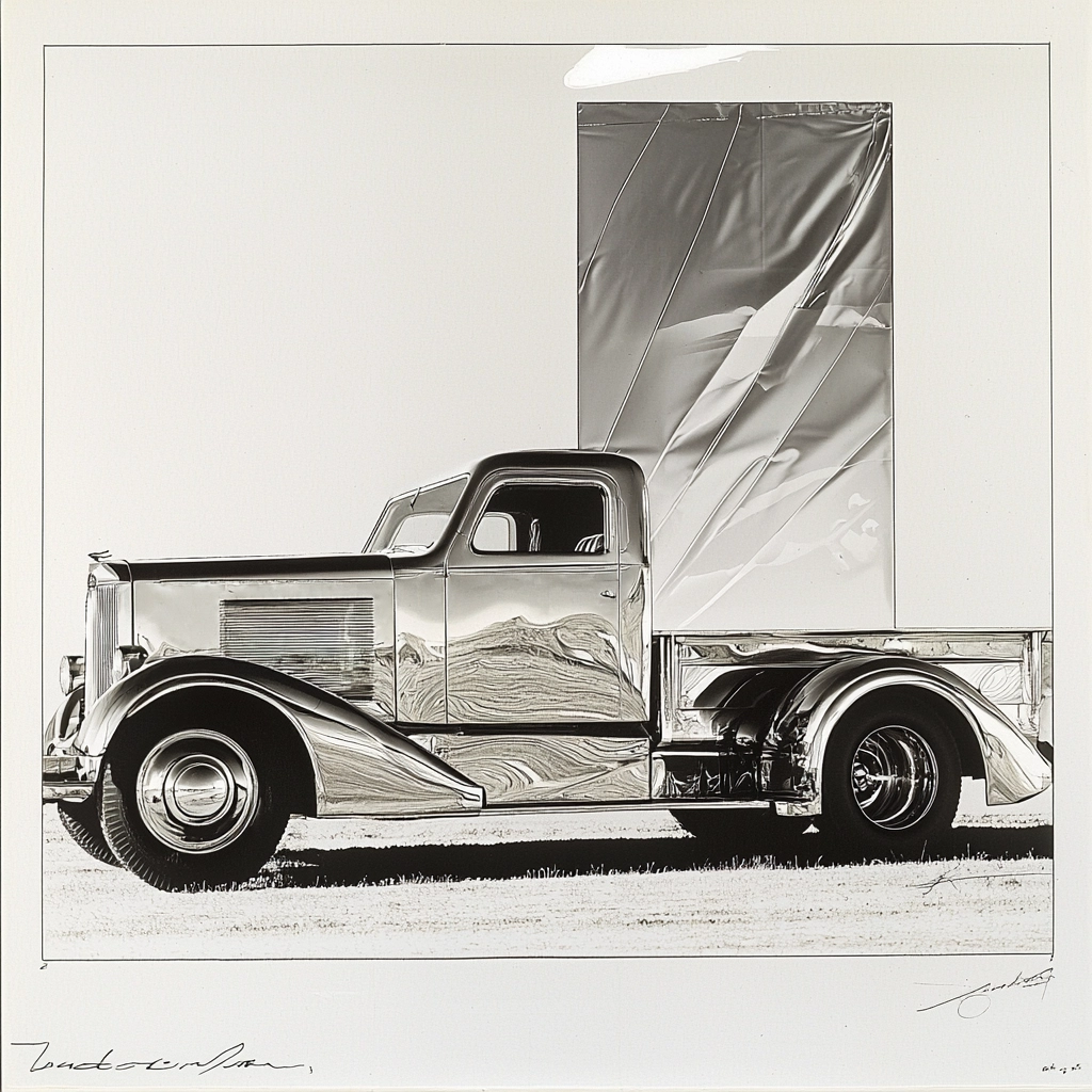 The use of silver reflections and monochrome tones creates a striking visual that plays with light and surfaces.