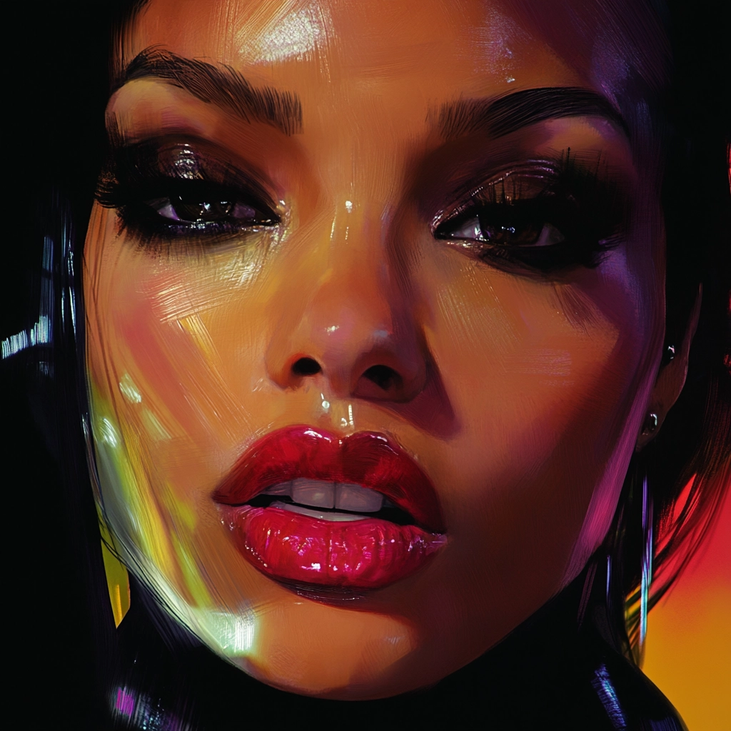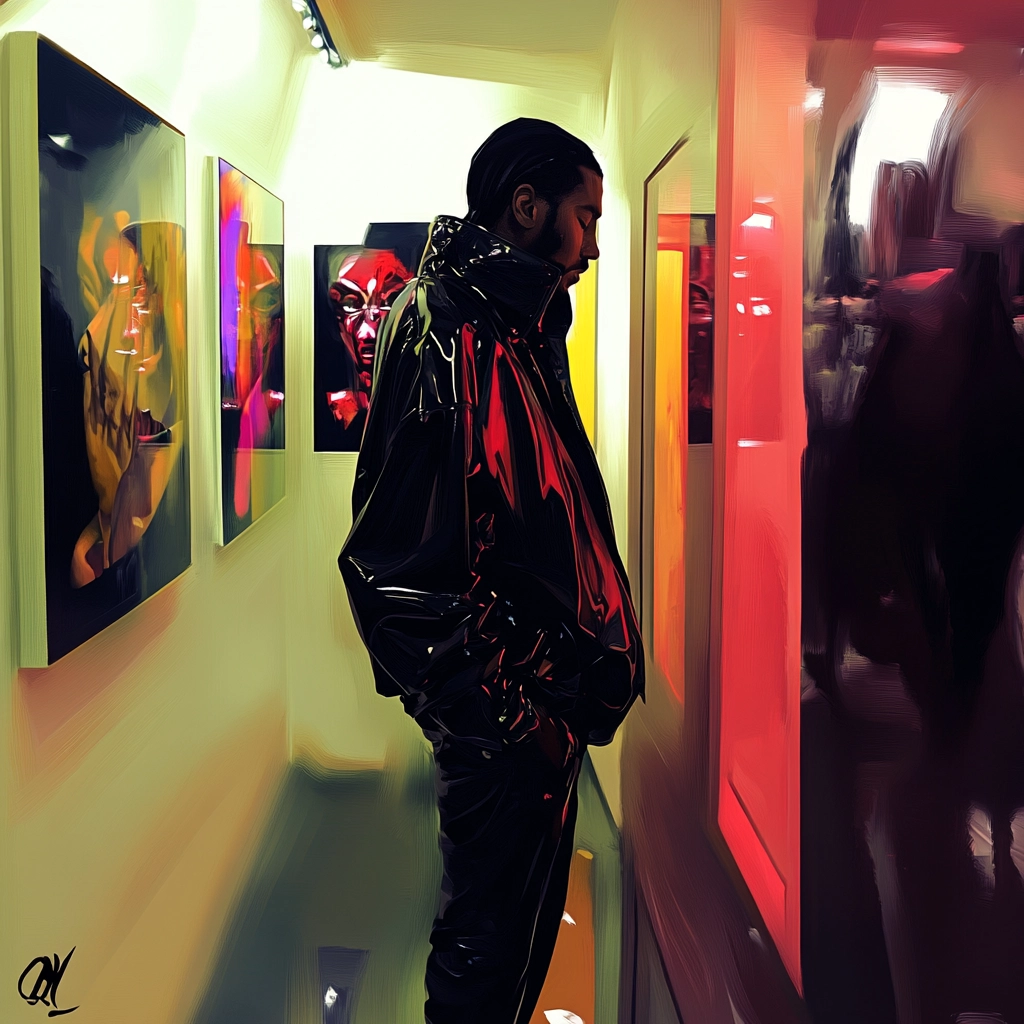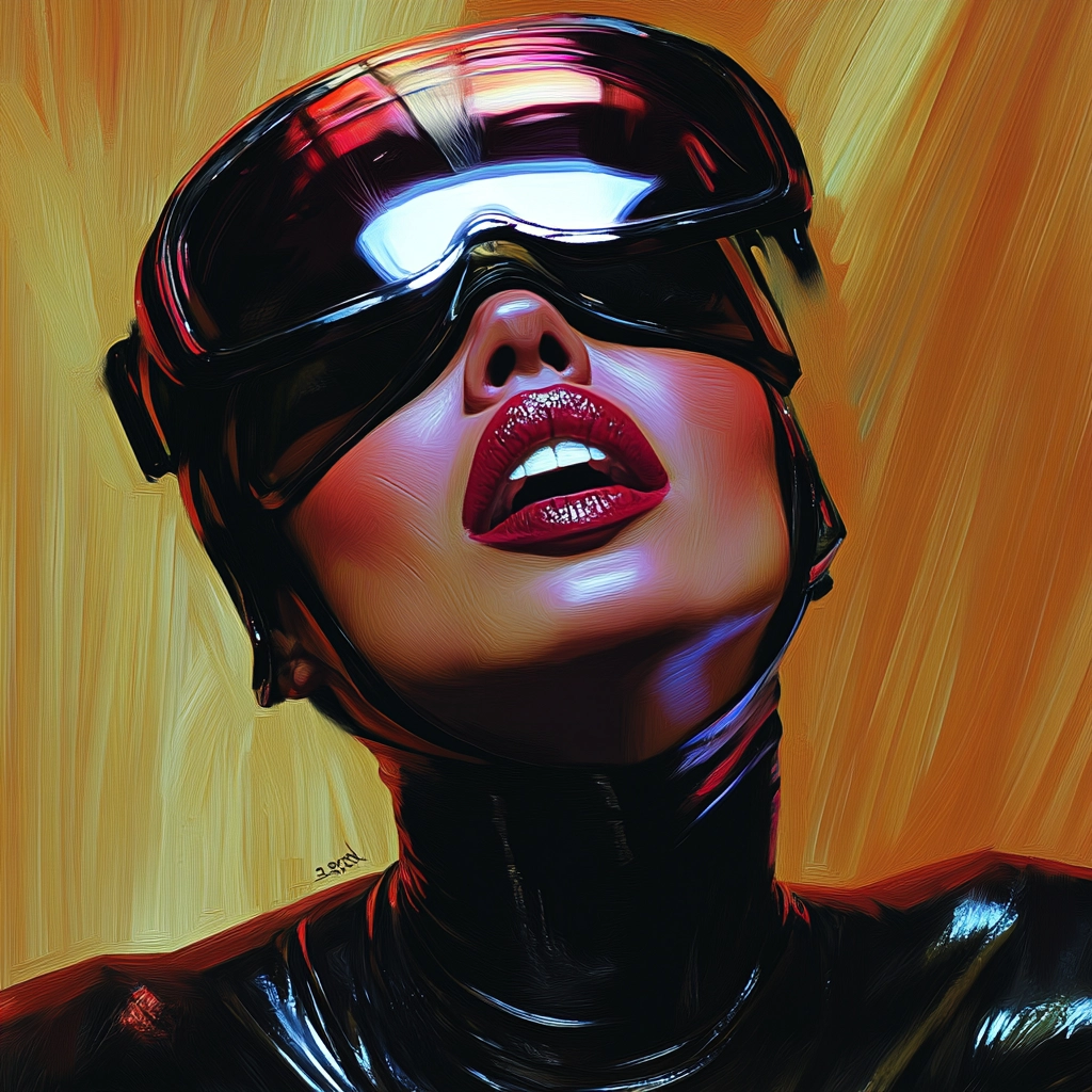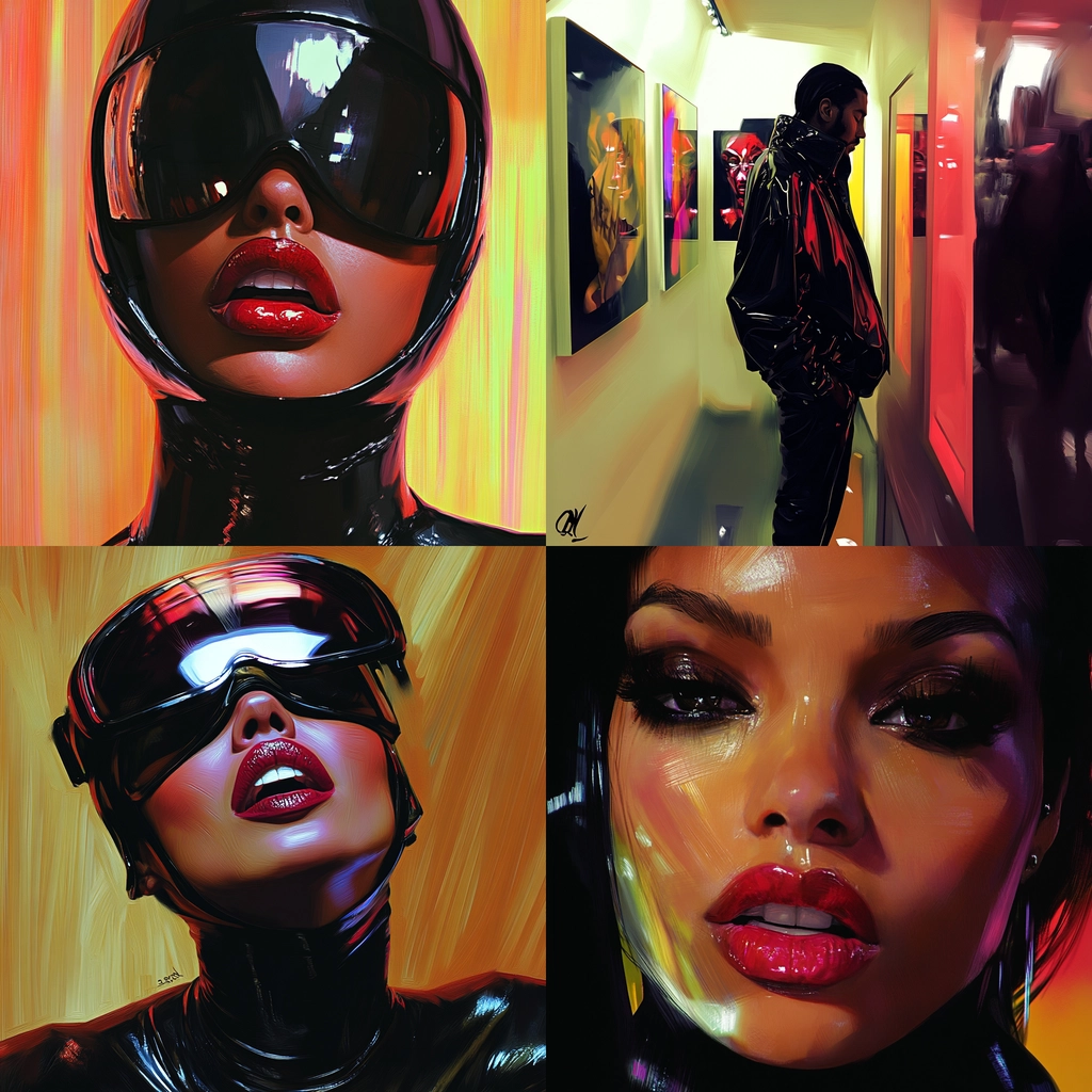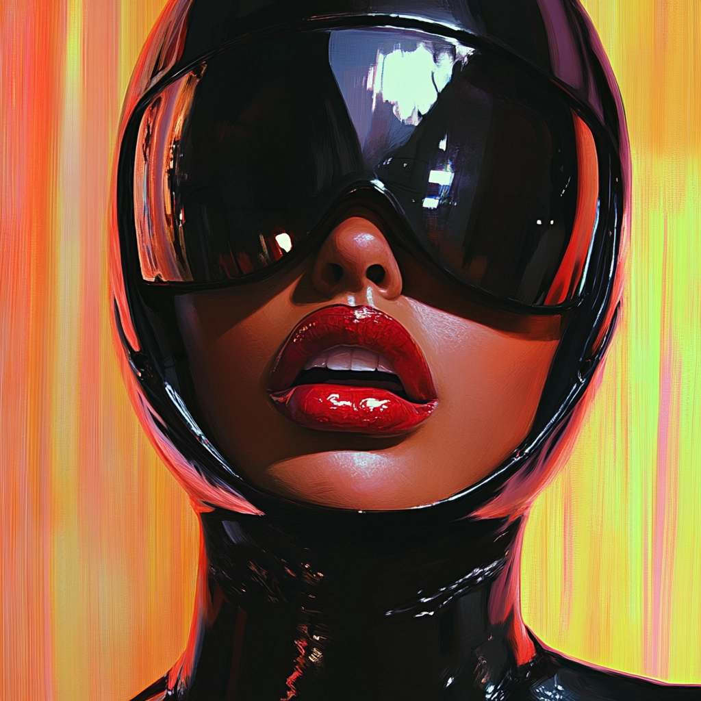 The lighting effects create a striking contrast with intense highlights and shadows. The use of reflective, glossy textures enhances the visual impact, while the spatial arrangement provides a dynamic depth. The color palette is vivid, with yellows and reds creating a vibrant atmosphere.