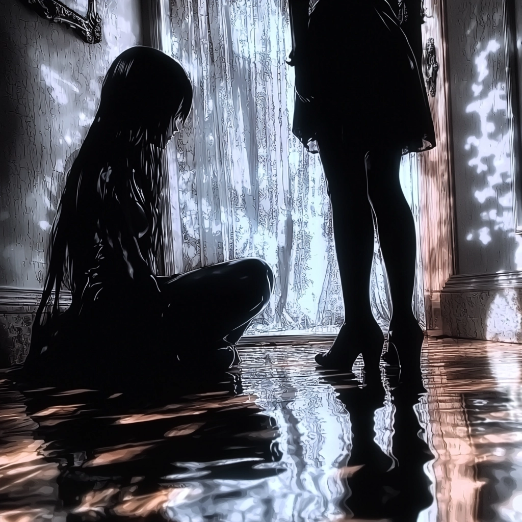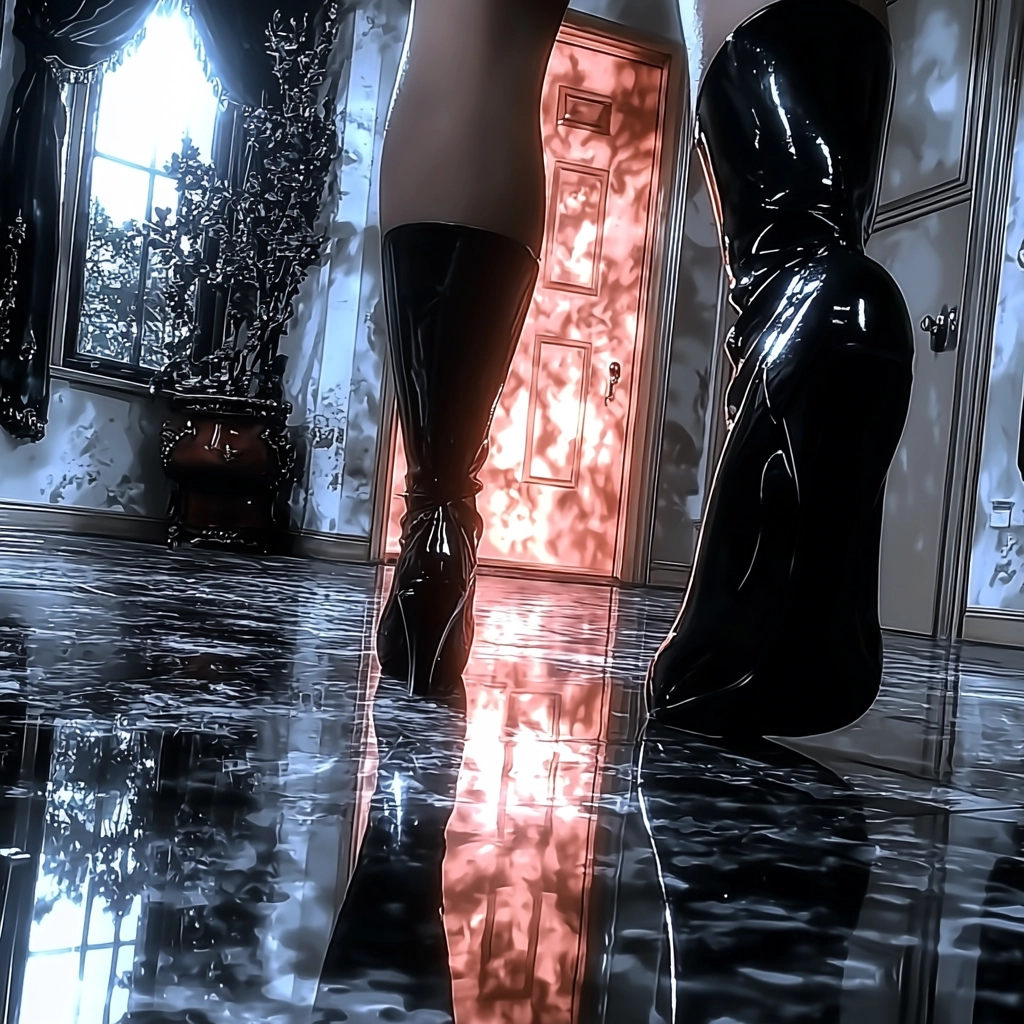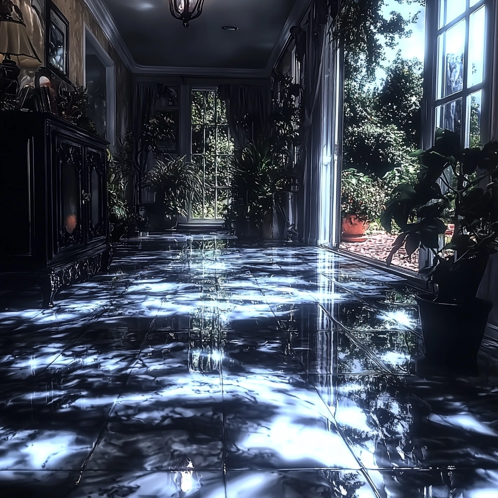 Strong contrast lighting creates a shimmering reflection against a dark backdrop, with glowing shadows emphasizing texture variance. The spatial depth is amplified by glossy surfaces mirroring ambient light.