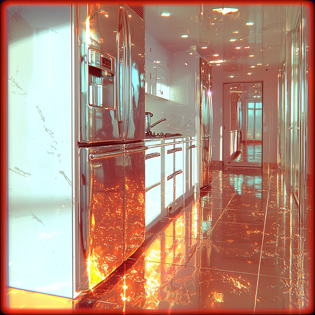 Brilliant lighting enhances the gleaming surfaces, emphasizing the reflective quality. The dynamic arrangement of elements creates a depth through varied spatial layers, while the smooth textures contribute to a sleek aesthetic vision.