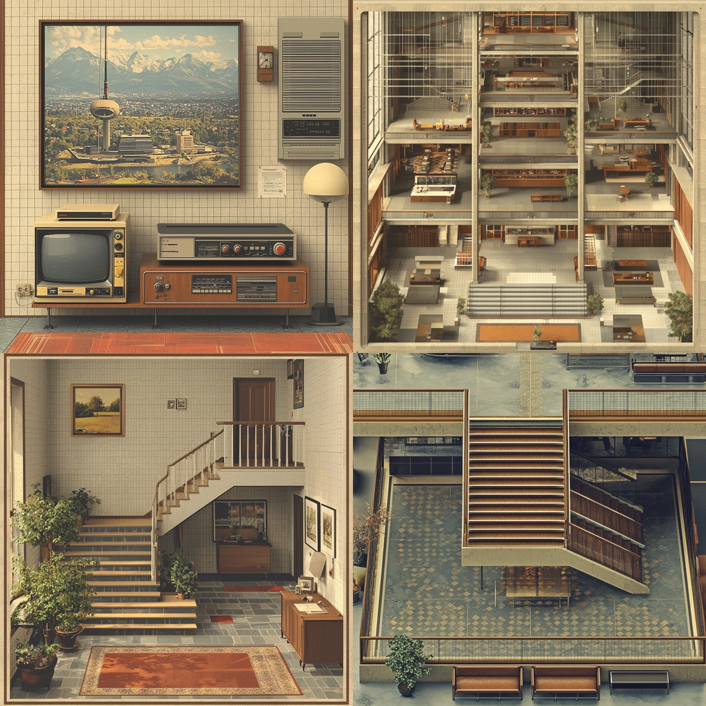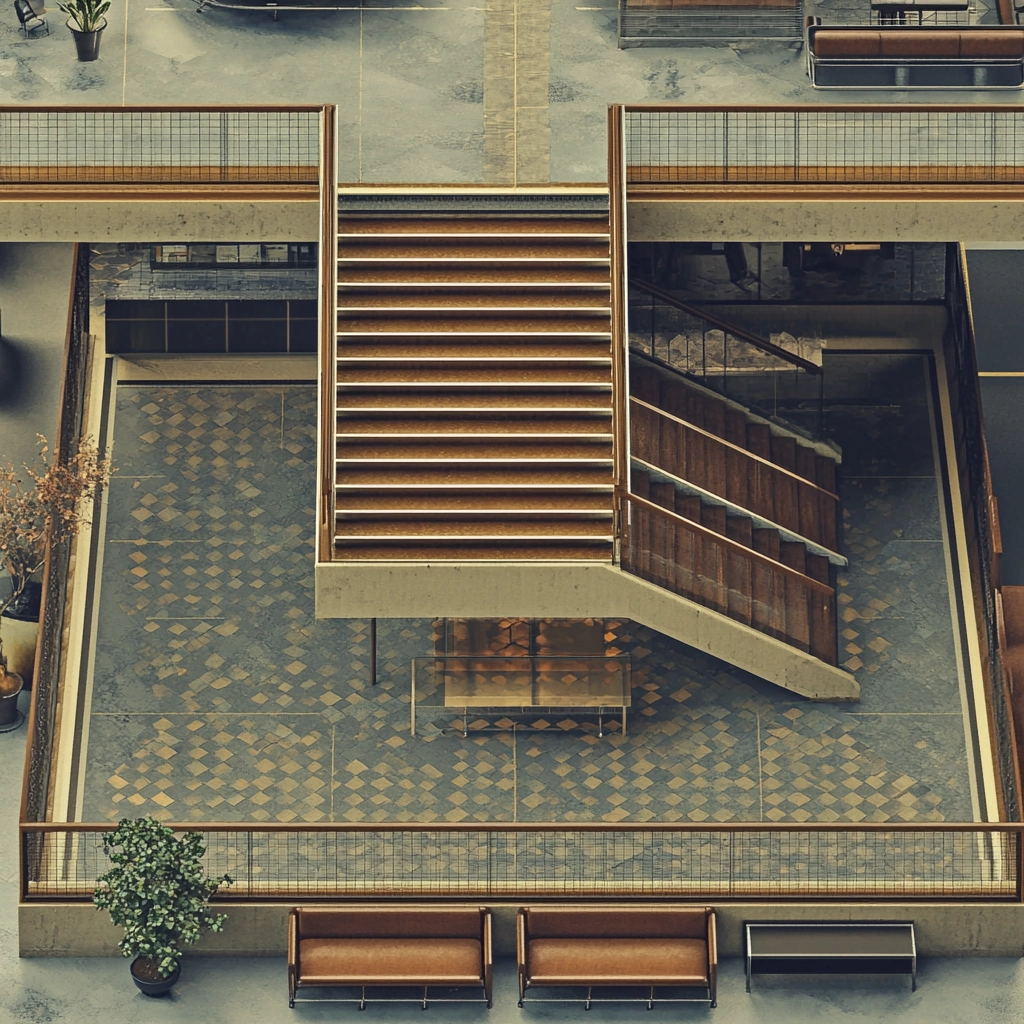 The lighting highlights the warm tonal range and shadows create a detailed texture, offering depth to the surroundings. The structured layout emphasizes space with precise angles and layered planes, mimicking retro architectural elements.