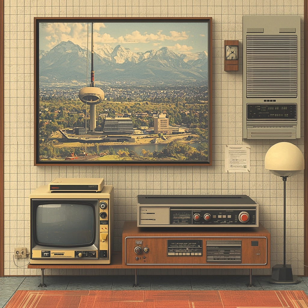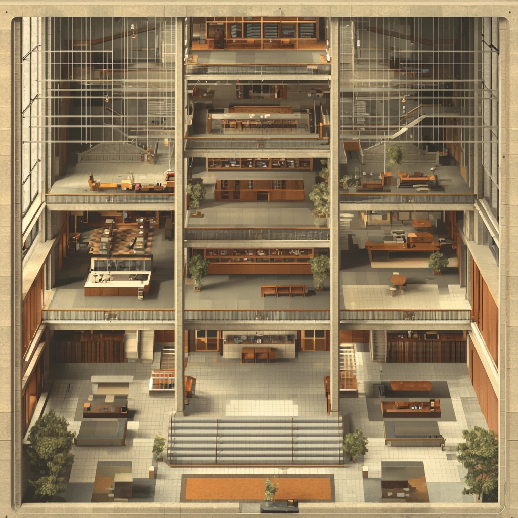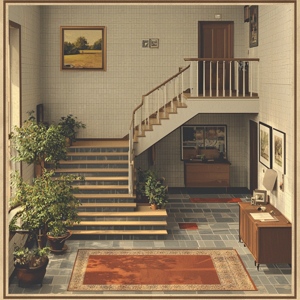 The composition utilizes a warm palette with structured, balanced spaces that evoke a sense of mid-century interior design.