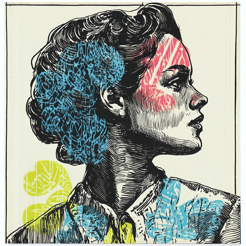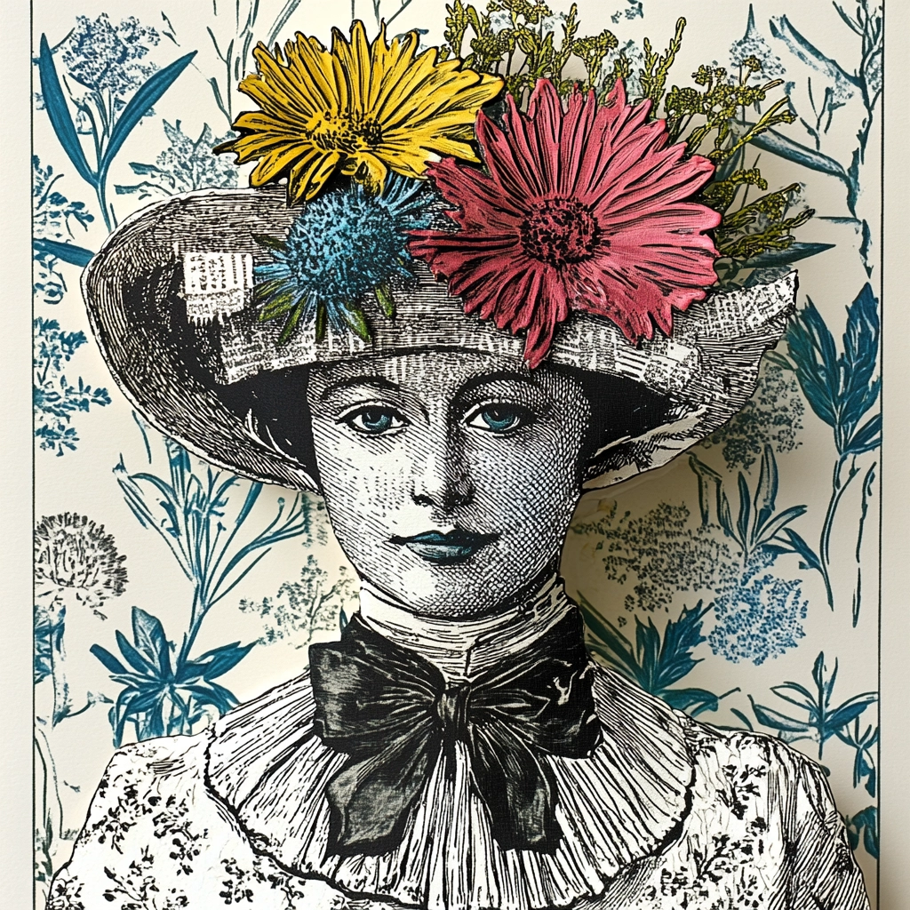 The use of deep black lines sets a firm structural foundation, allowing the bright colors of the floral illustrations to pop and entice the eye. A flattened spatial sense suggests a print-like quality, while textures from differing line densities add depth and interest.