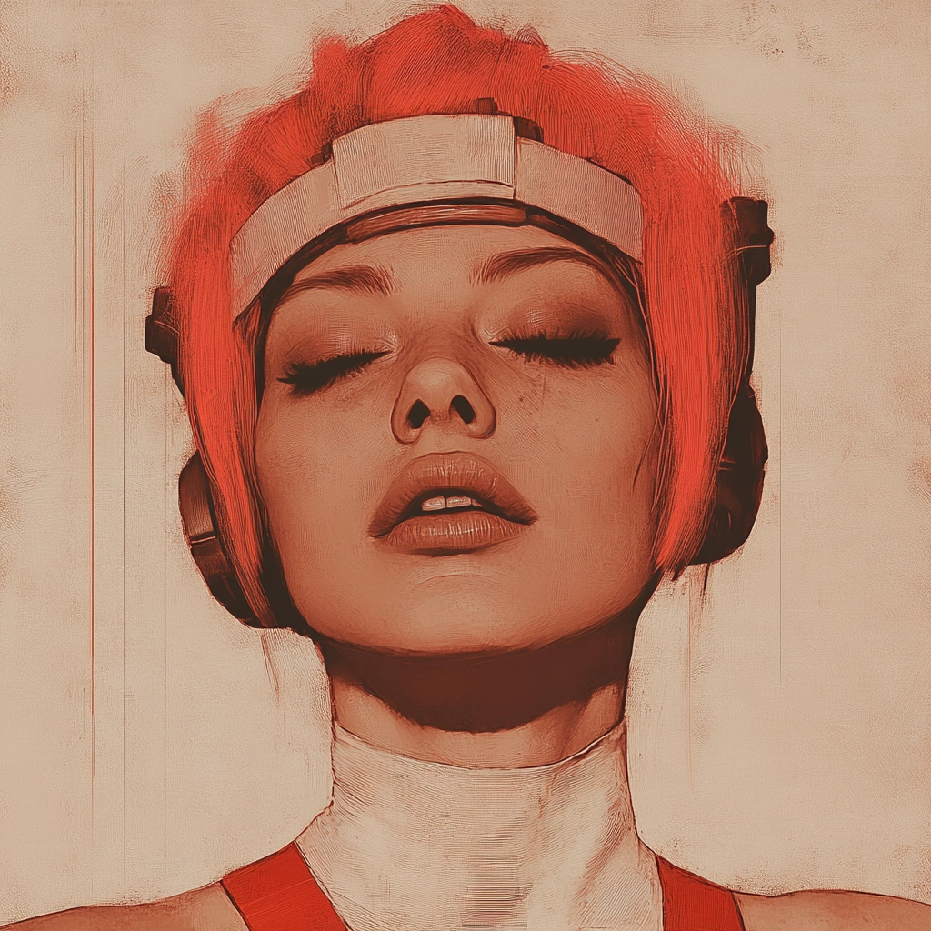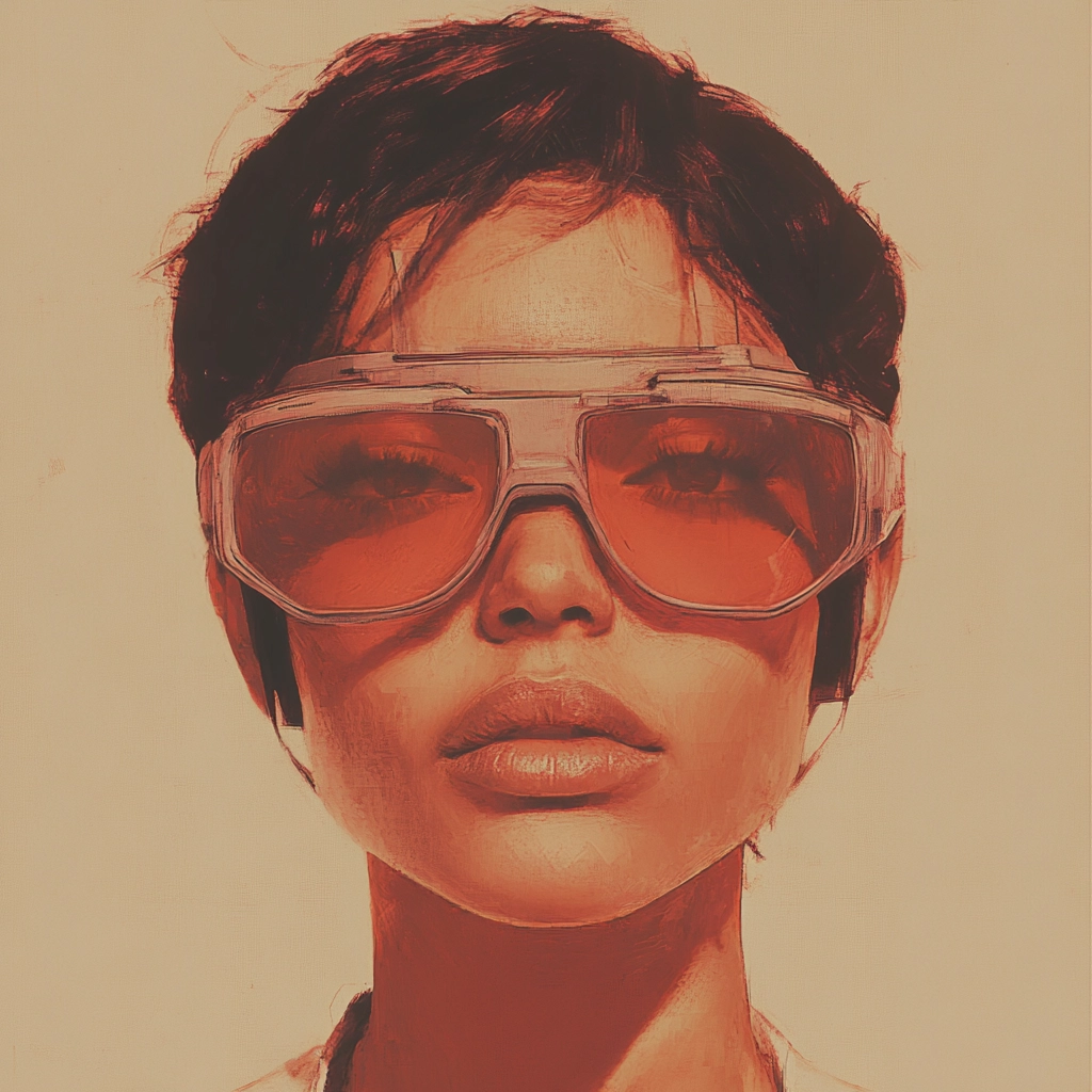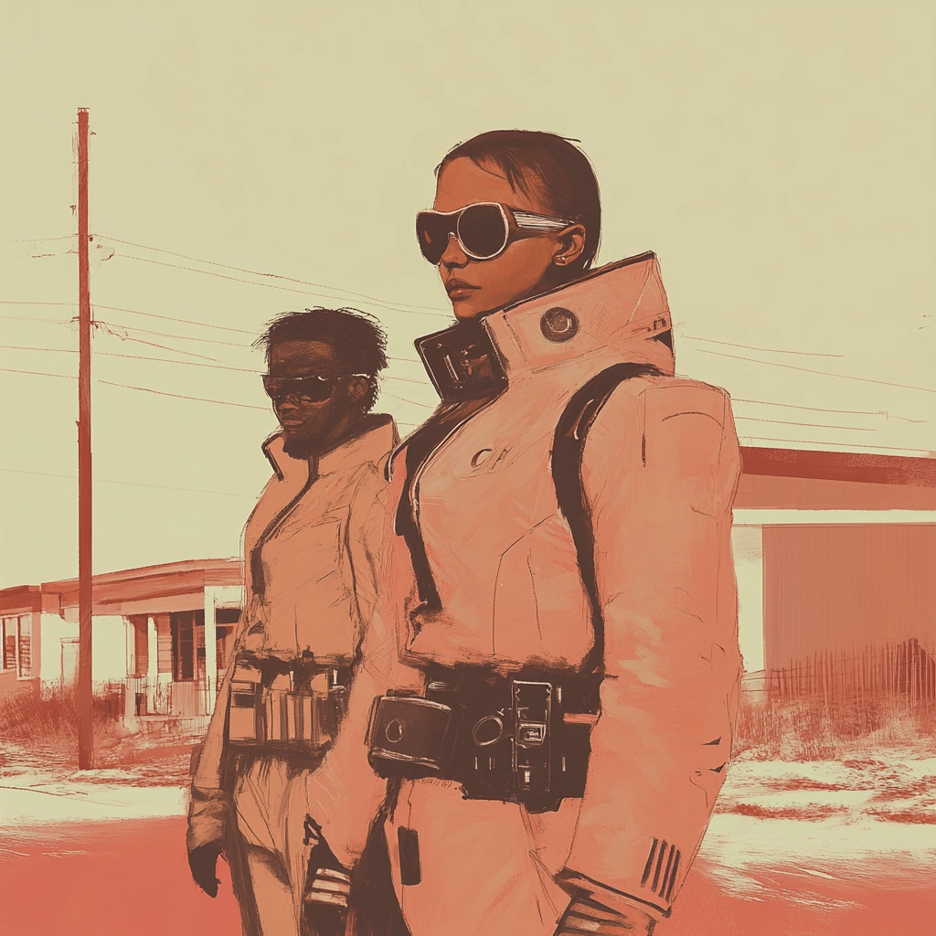 Warm tones envelop scenes with retro-futuristic aesthetics.