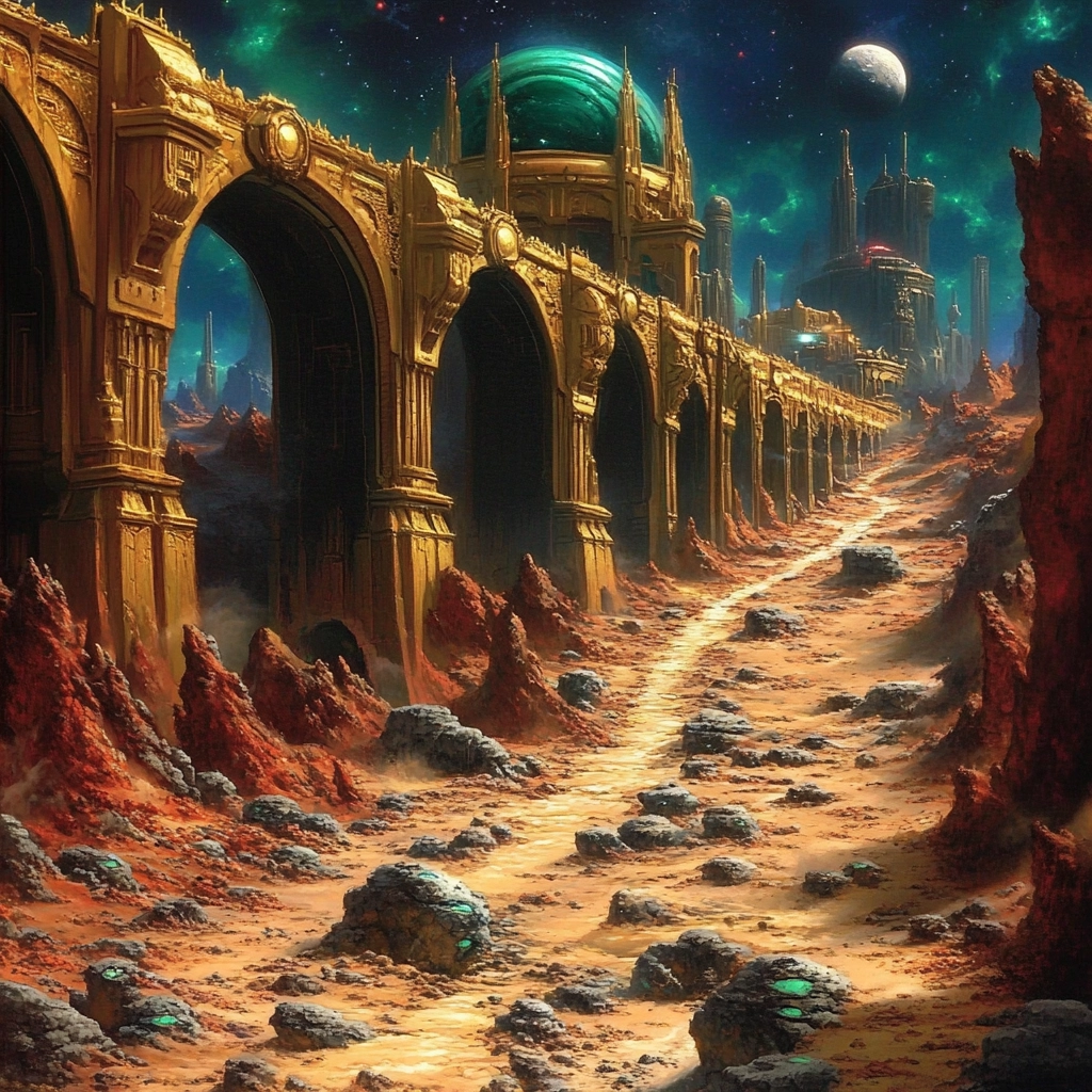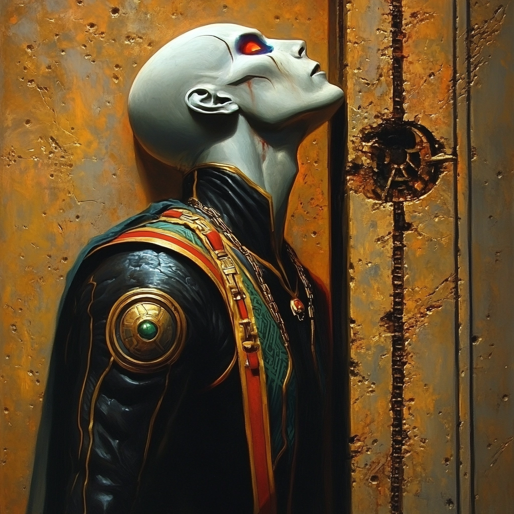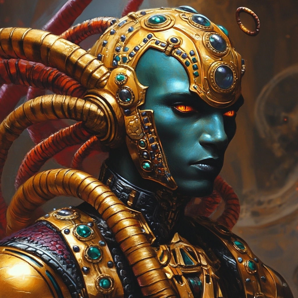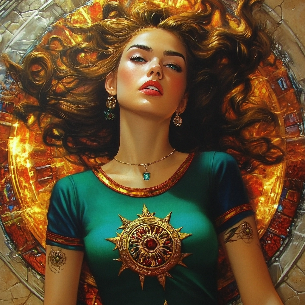 The artwork employs sharp, contrasting lighting effects which highlight bold and vivid colors such as gold and dark blue. The texture is meticulously detailed, giving a sense of depth through layered compositions and intricate background elements.