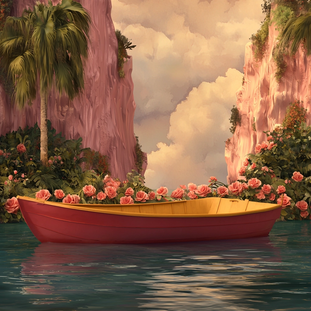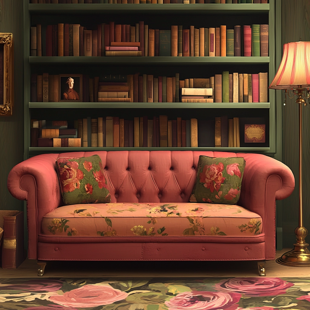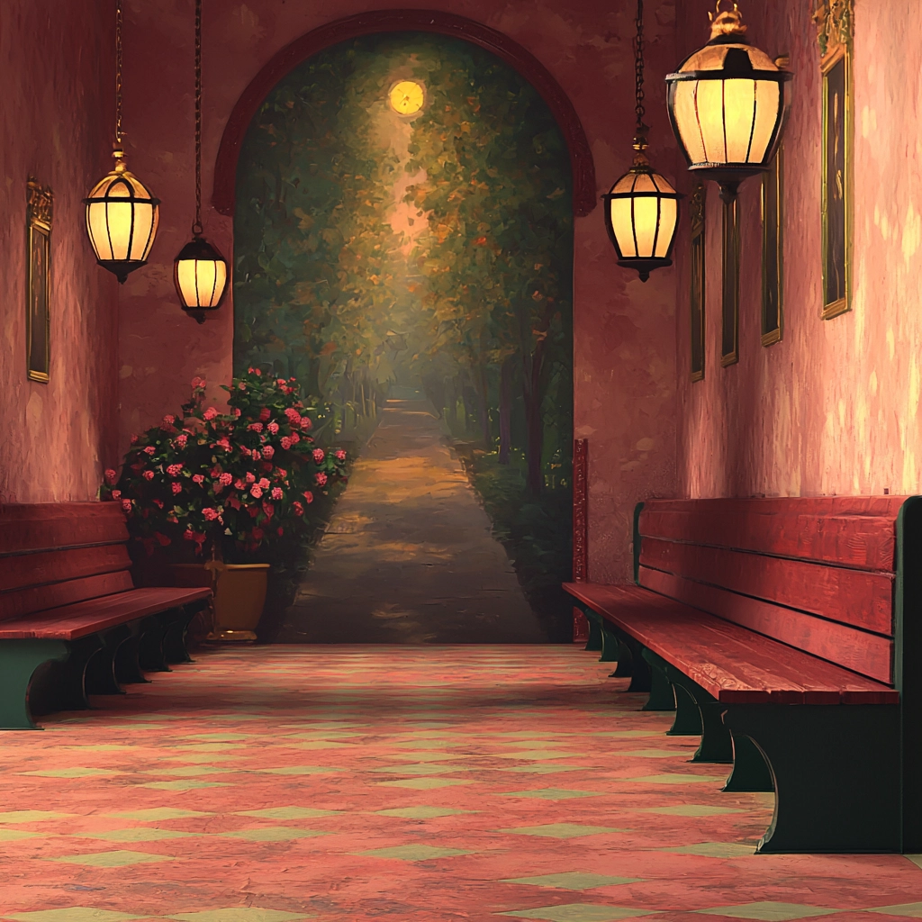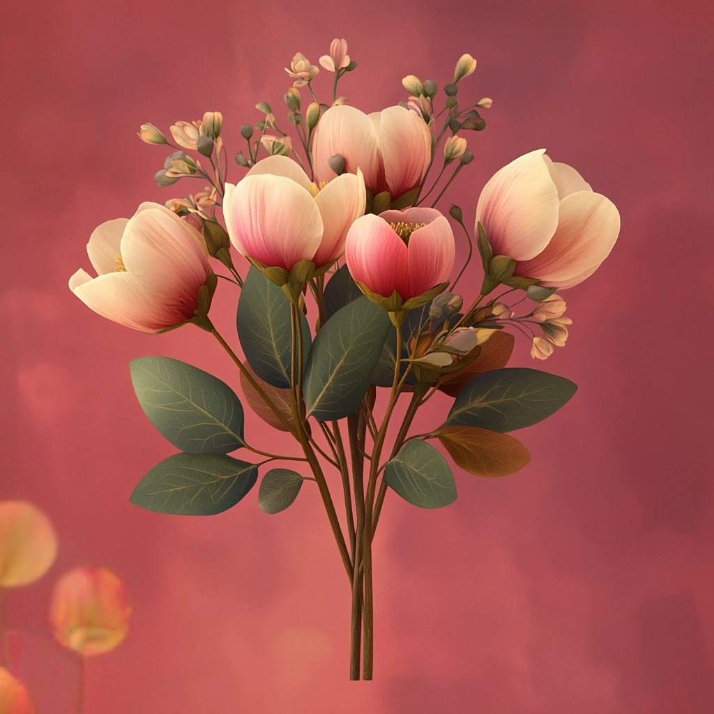 Warm, soft lighting creates a welcoming atmosphere. Color palette predominantly features delicate pinks, complemented by natural greens and earthy browns. Smooth textures enhance the gentle, inviting spatial depth. All elements combine harmoniously, presenting a tender visual coherence.