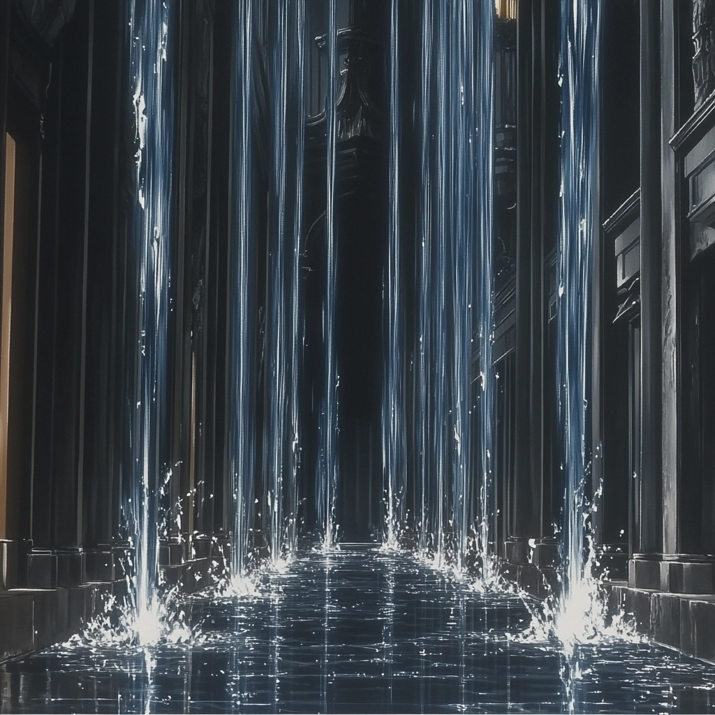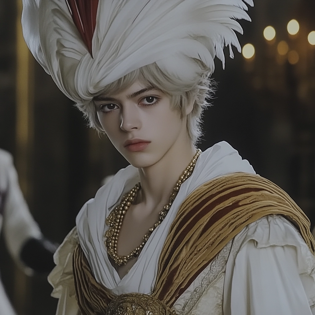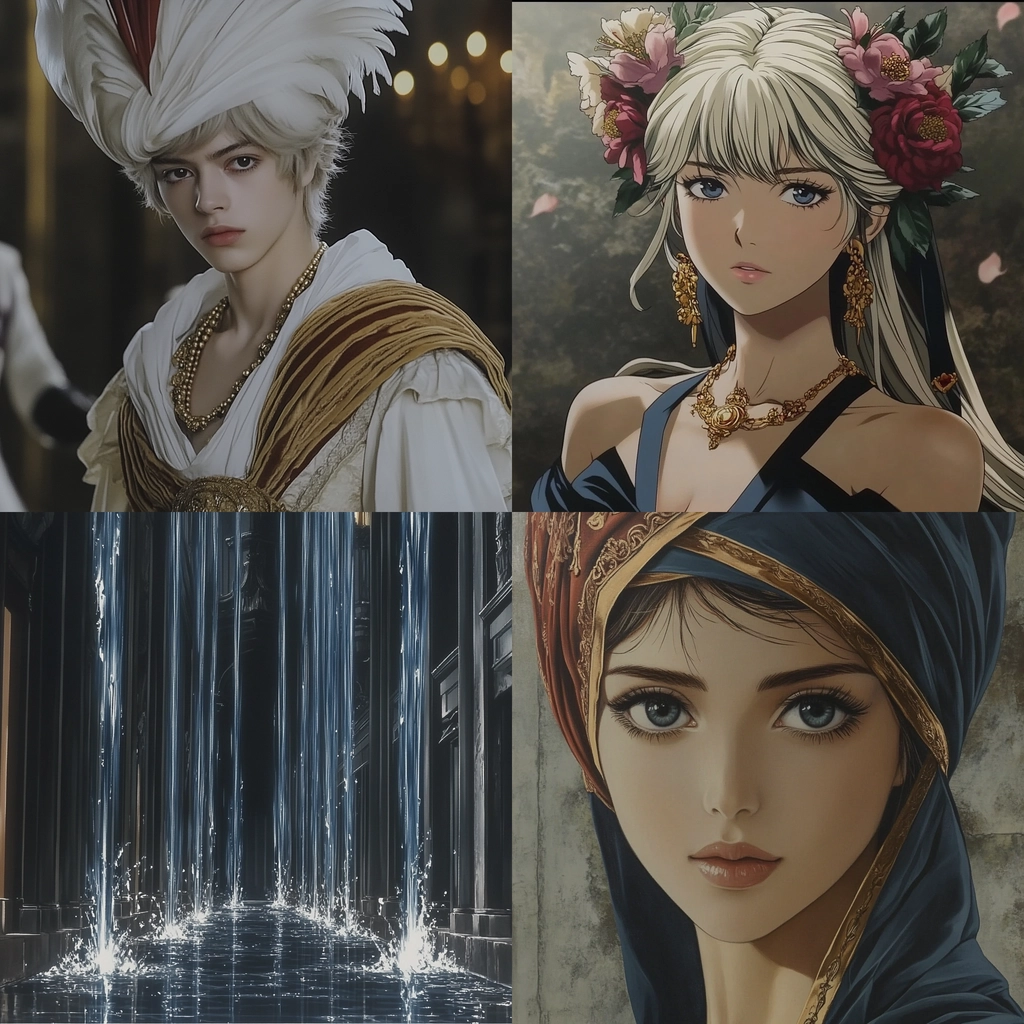 The lighting is dramatic, casting bright highlights against deep shadows, while the use of gold accents enhances the richness. Textures are luxuriously detailed, from fabric folds to ornamental details, conveying a sense of opulence and elegance.