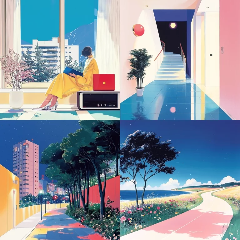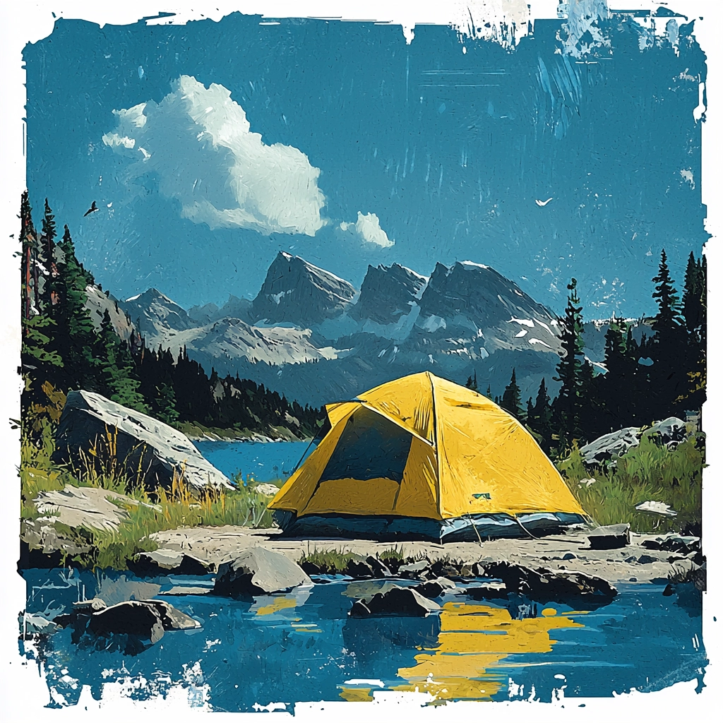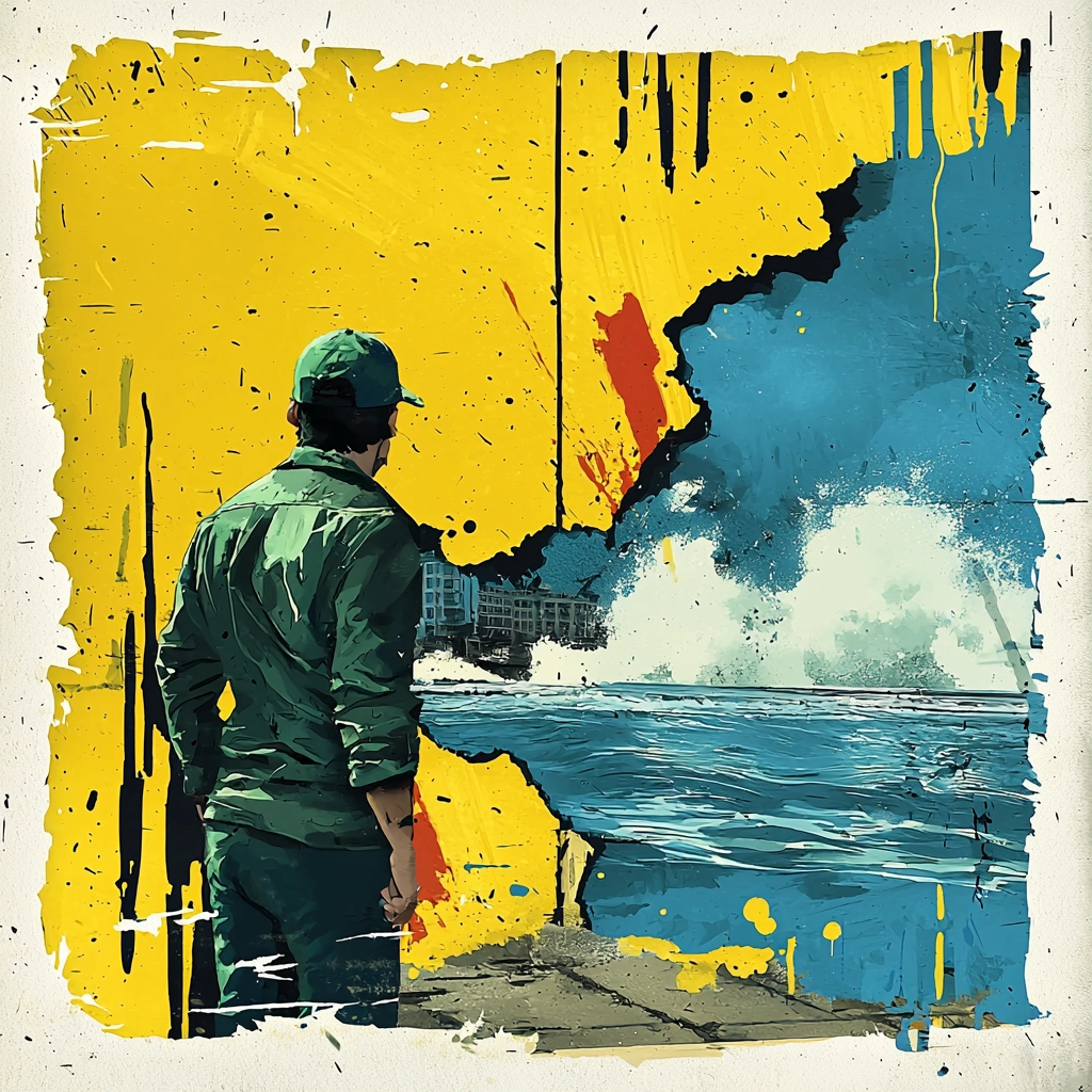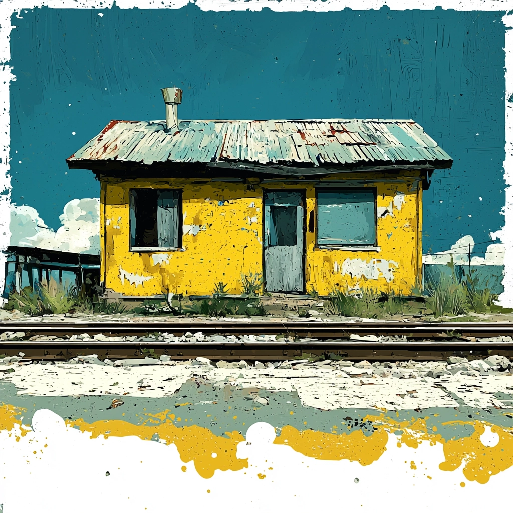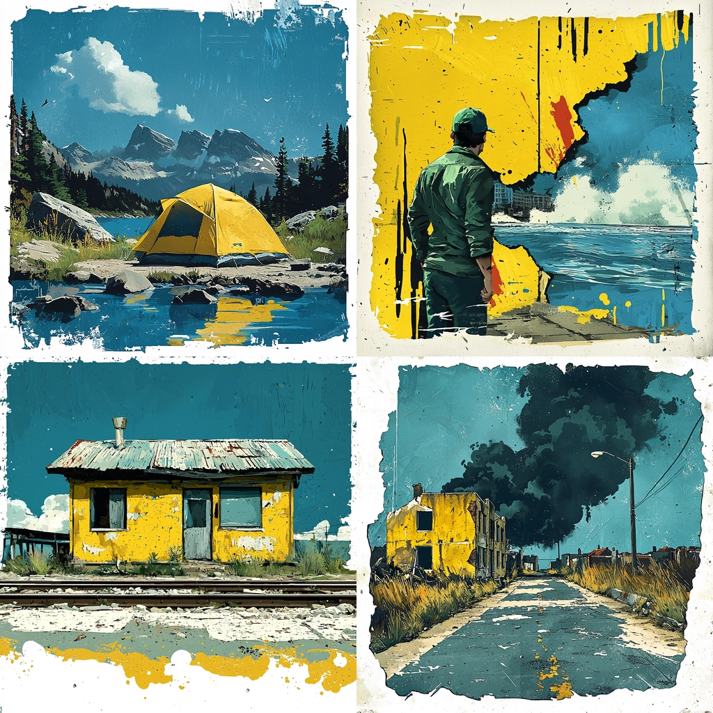 Bold yellow forms juxtaposed against deep blue backgrounds create a rugged contrast.