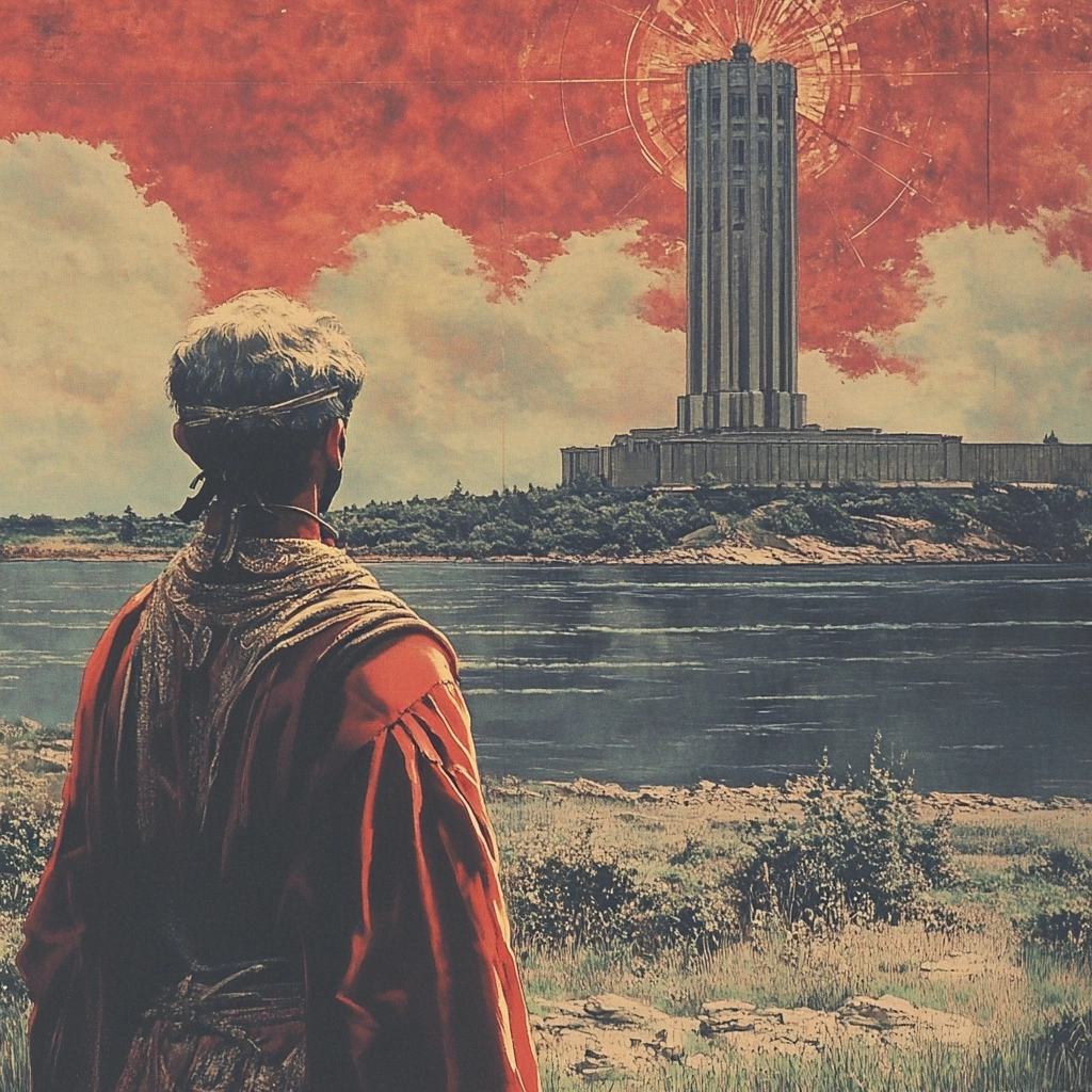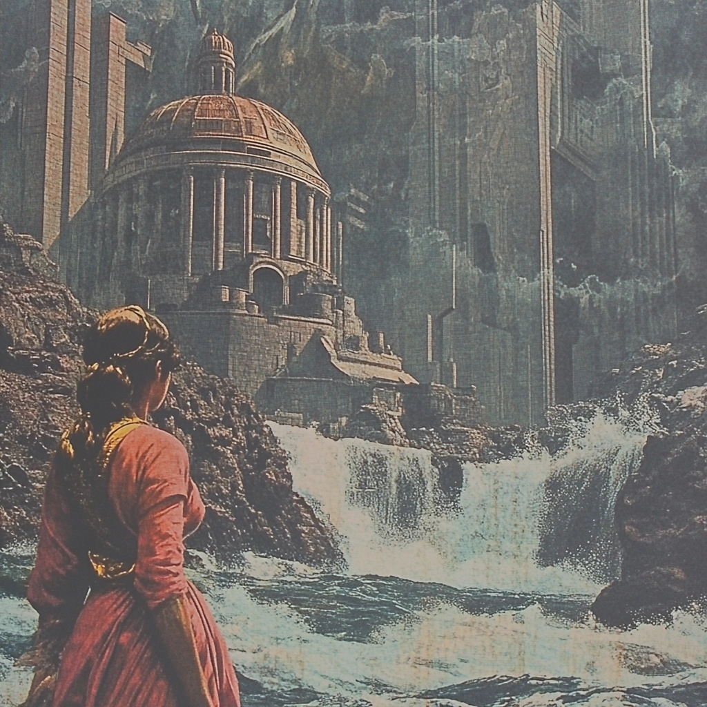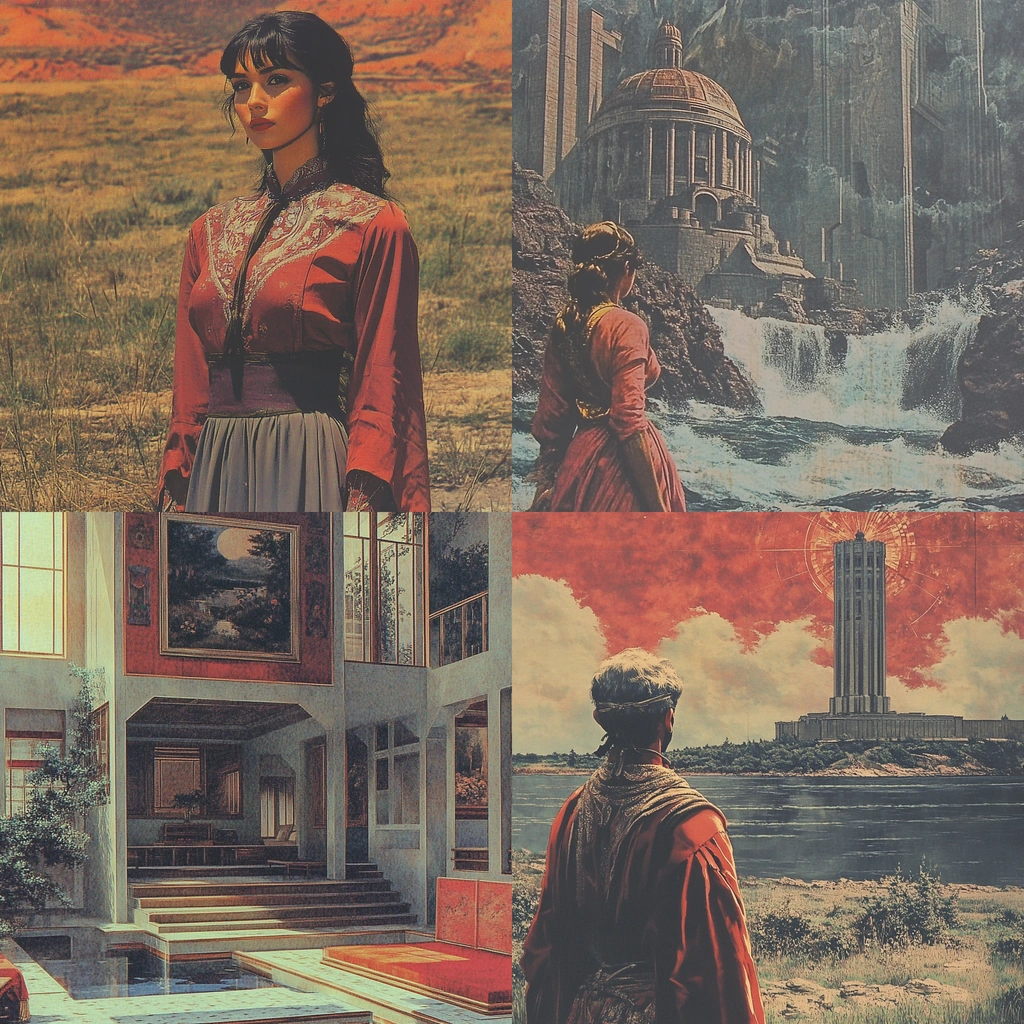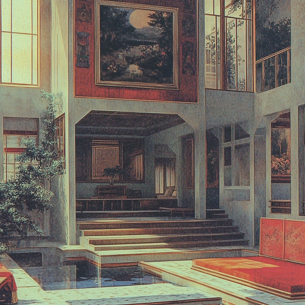 Soft lighting creates a gentle glow across the scenes. The colors are warm and earthy with a predominance of muted reds and grays. Architectural spaces and landscapes provide a frame for depth and texture.