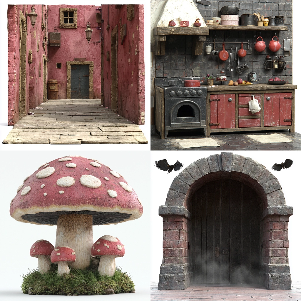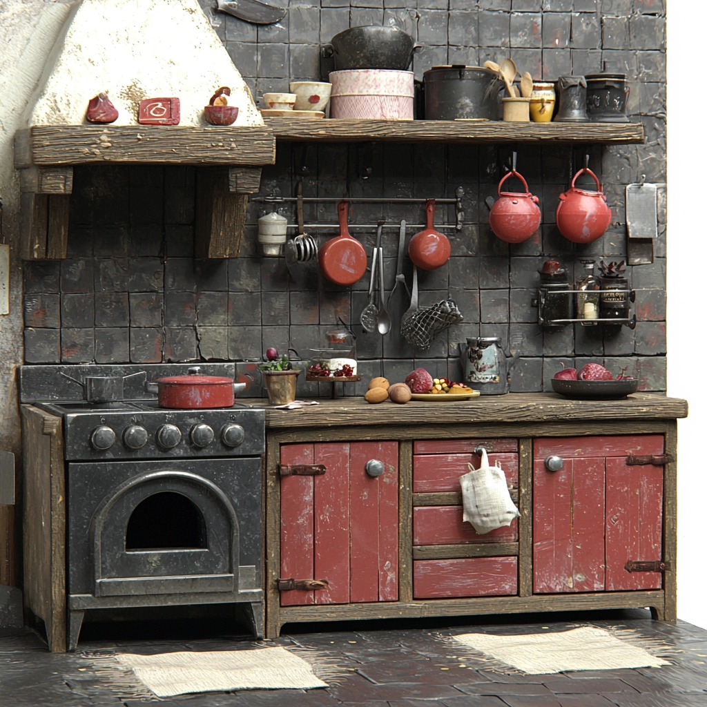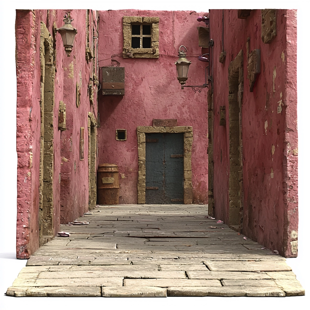 Soft and uneven lighting produces subtle shadows, accentuating the textural contrasts between surfaces. These varied textures give a realism and tangible quality that suggest age and wear. Spatial elements are tightly composed, focusing on depth and detail.