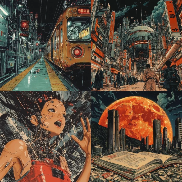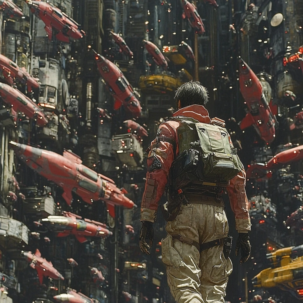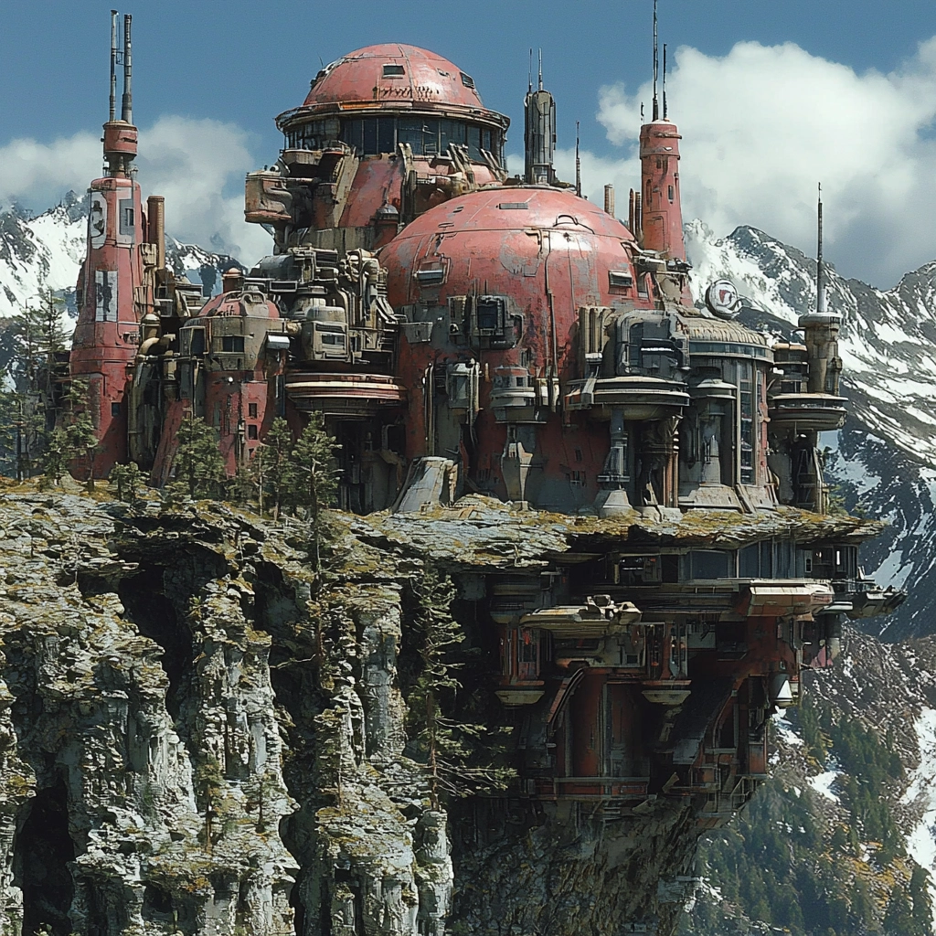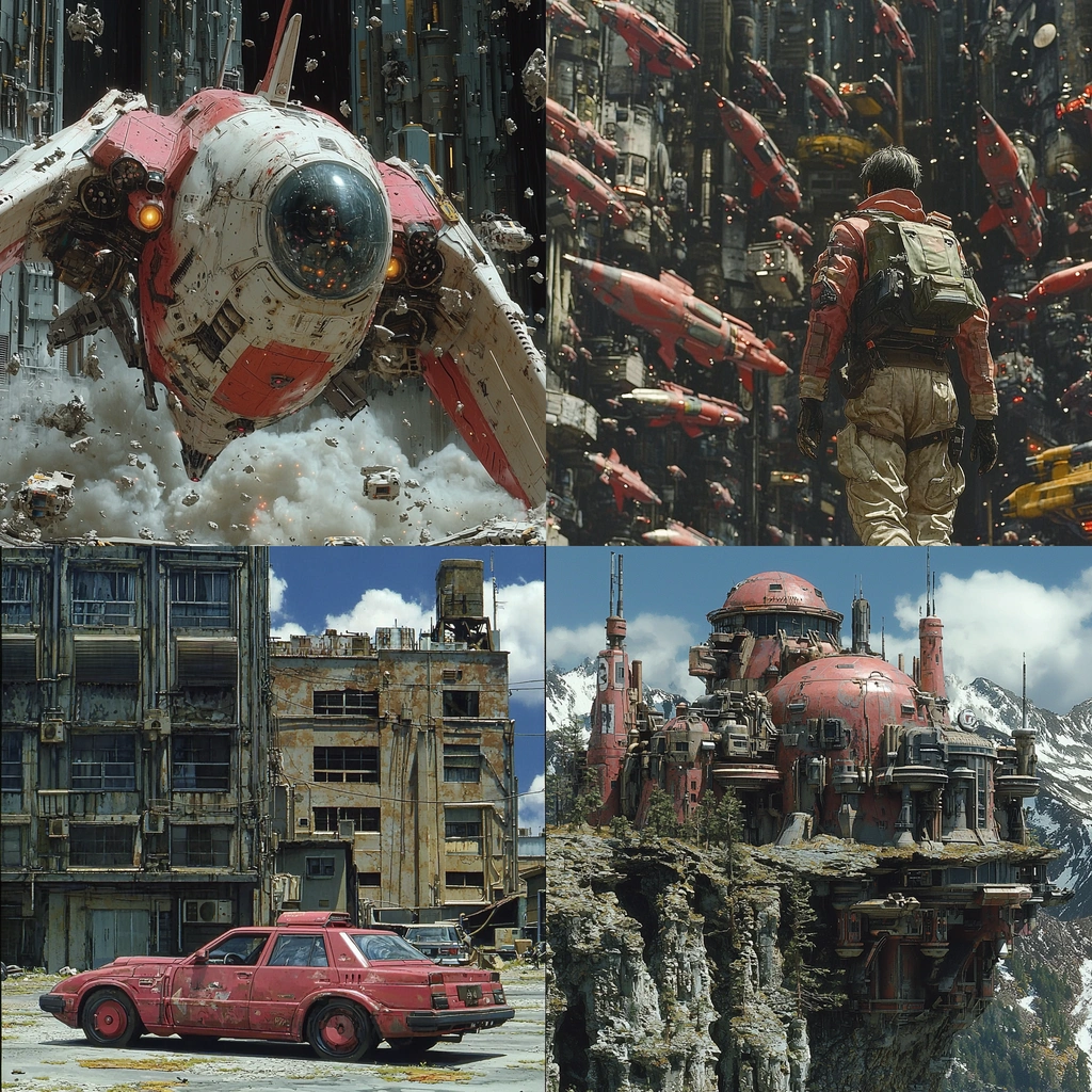 The composition integrates mechanical structures with rustic textures and bold red accents.