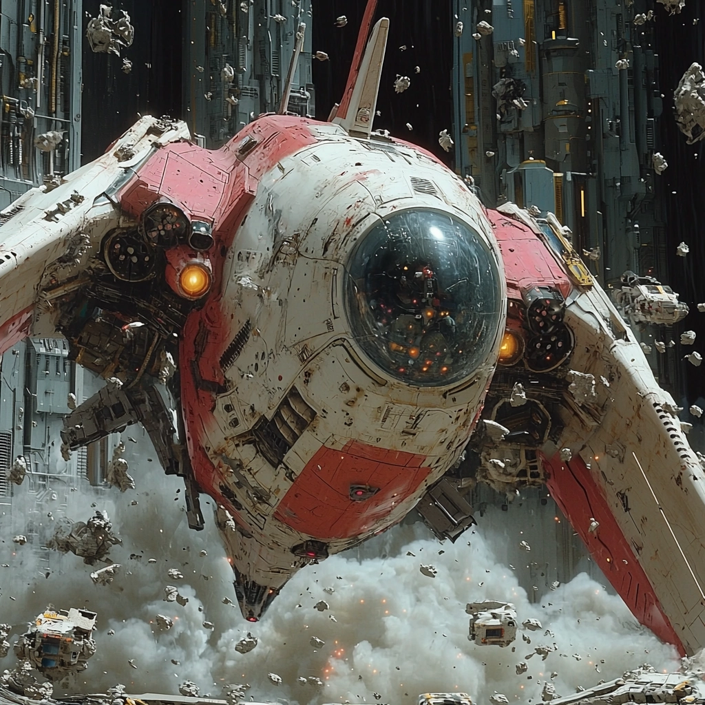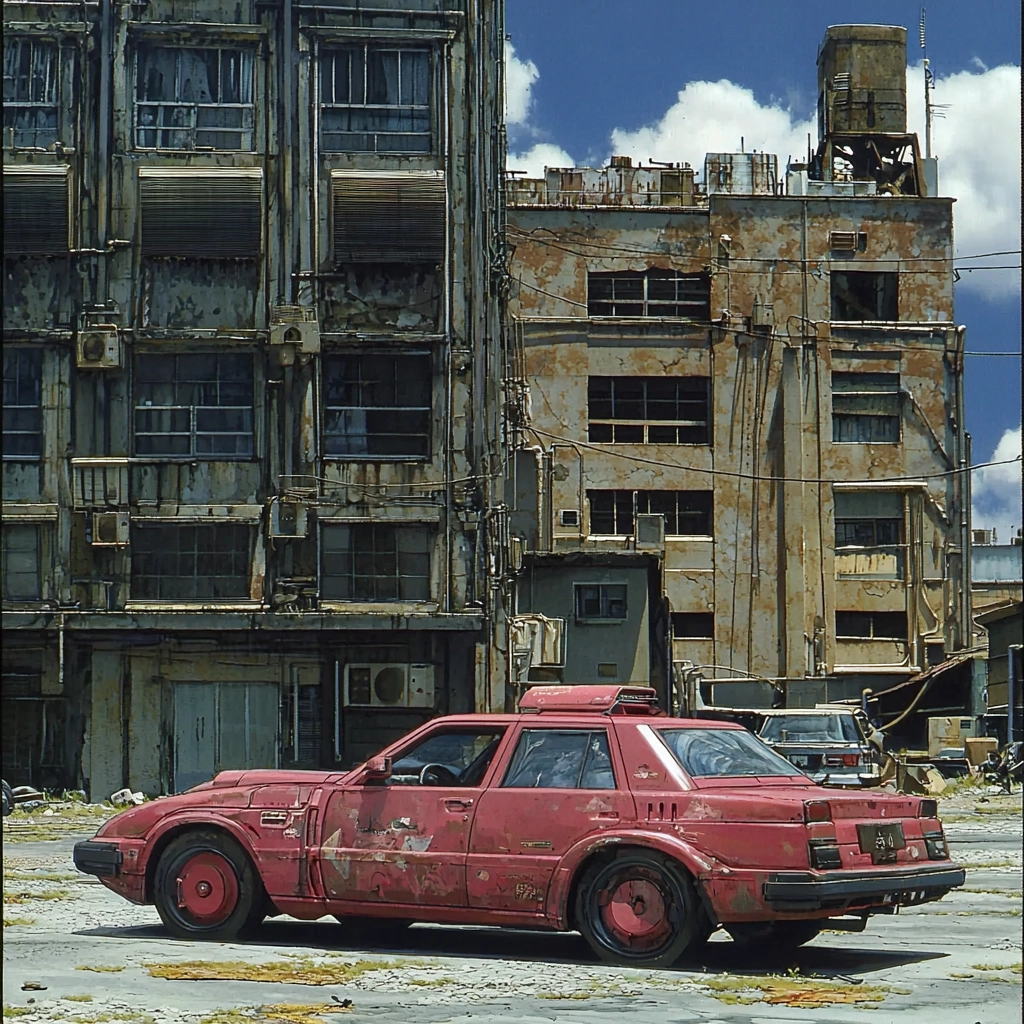 The lighting accentuates the aged surfaces and mechanical details, creating a sense of depth and complexity. Red hues provide contrast against the gray and brown tones, highlighting the intricacies of forms and shadows.