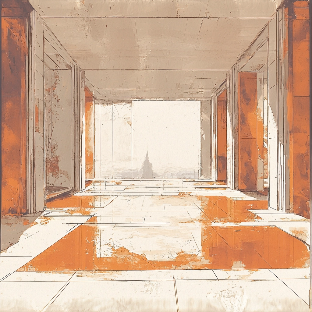 The lighting is subtle, emphasizing the contrast between light and shadow. The colors are warm and earthy with a patina finish, giving depth to the scenes. Texture is rough and sketch-like, enhancing the tactile experience. The spatial arrangement is precise and structured.