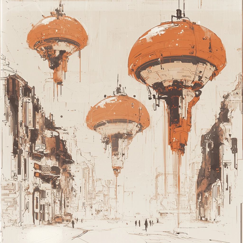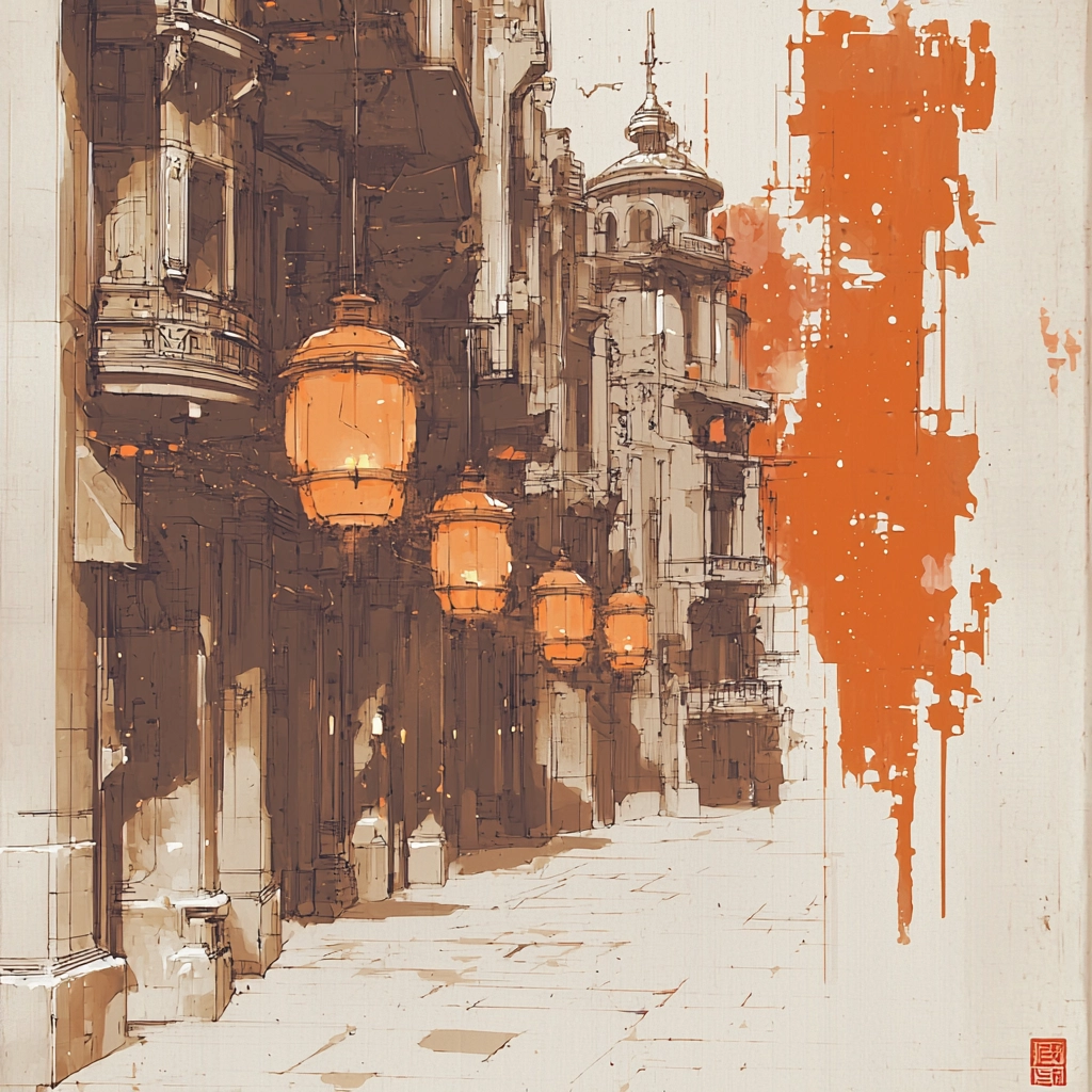 The composition showcases a rustic sketch style dominated by orange and brown tones, creating a striking visual impact.