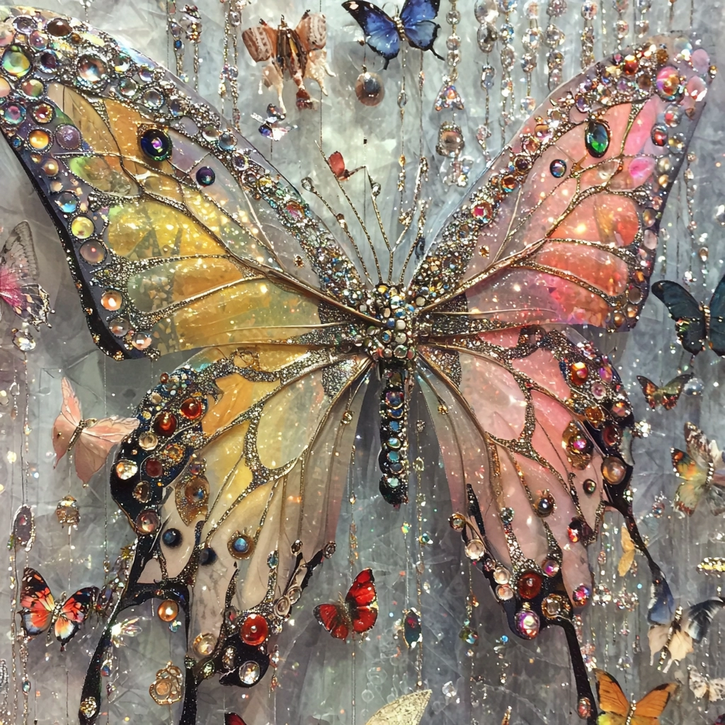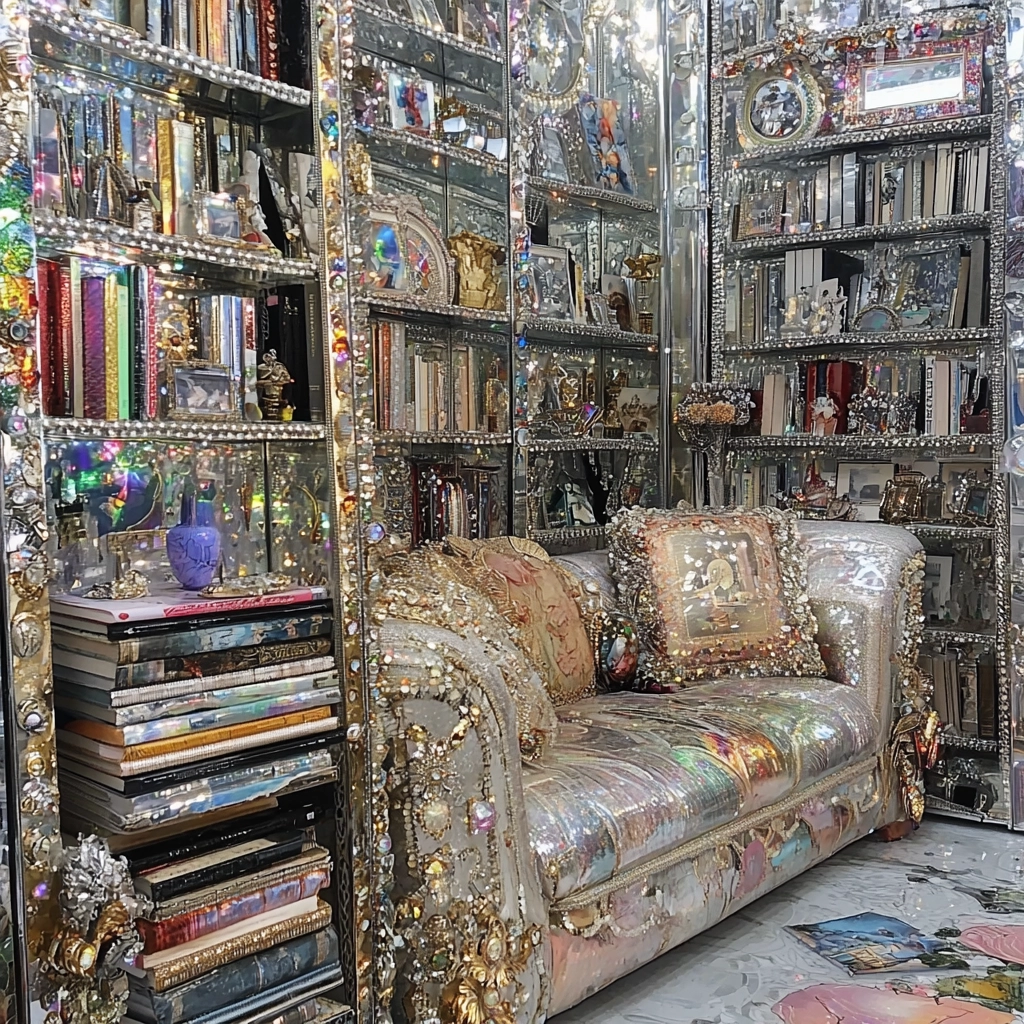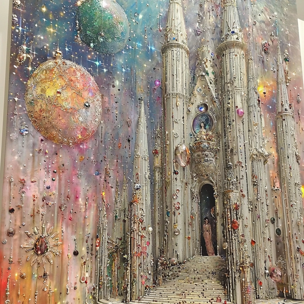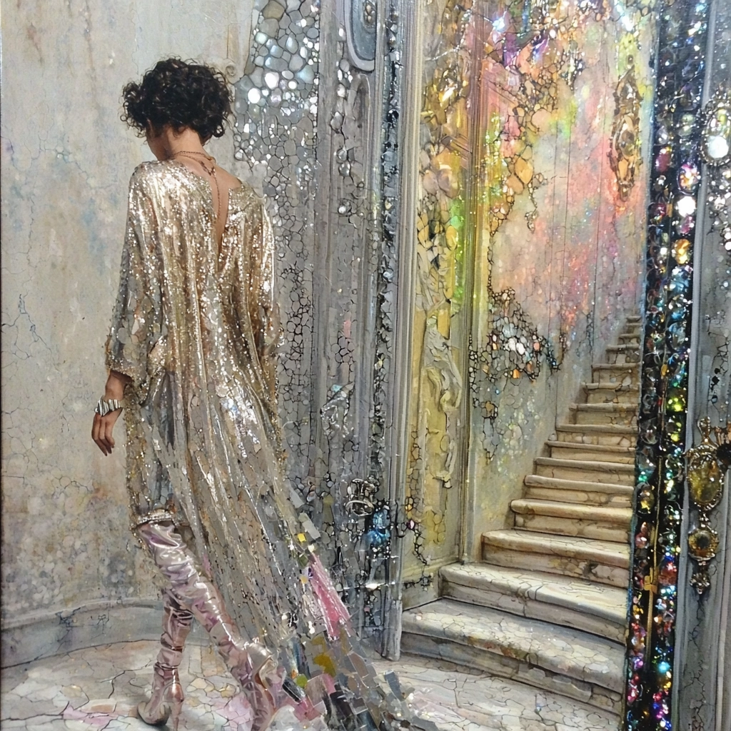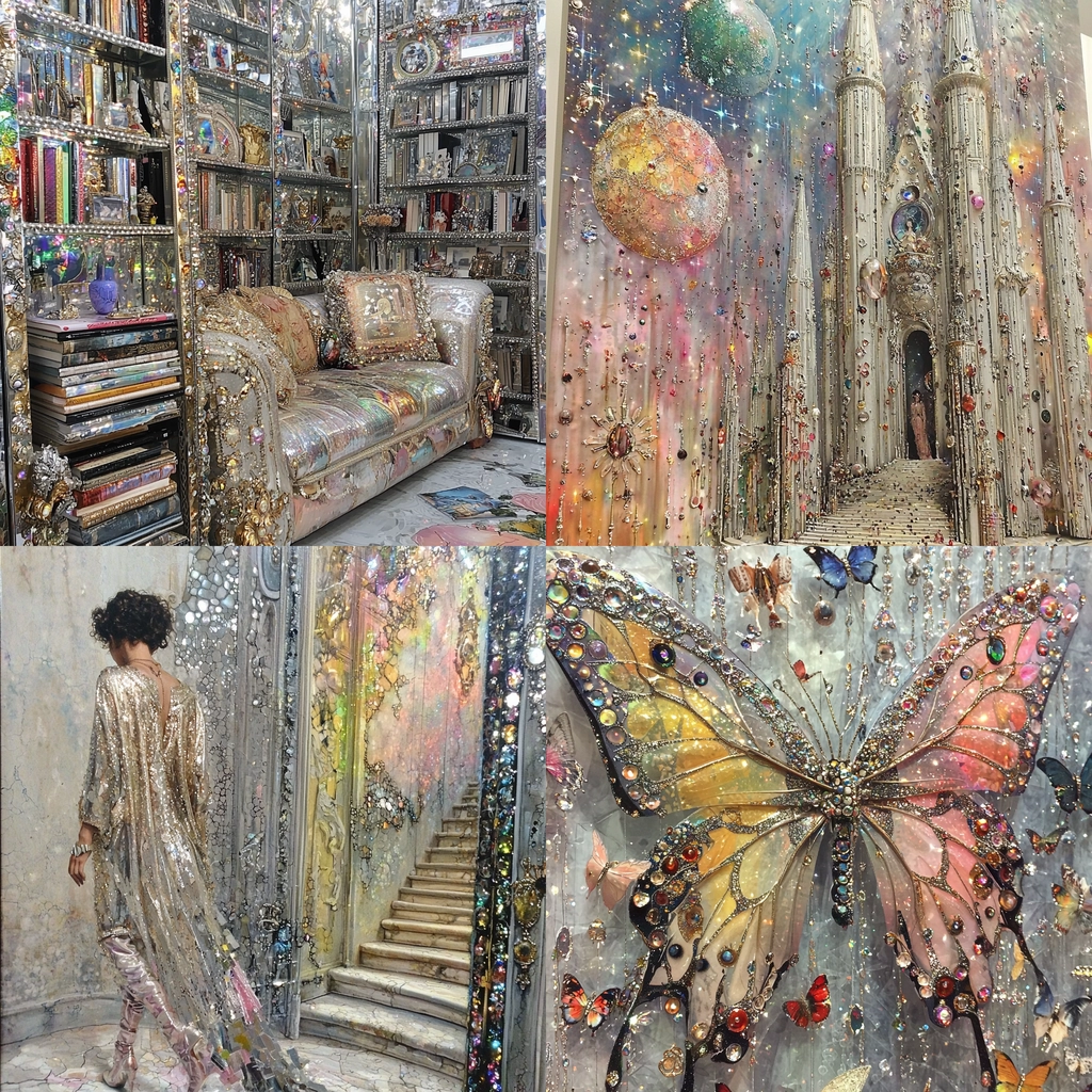 Lighting creates a captivating shimmer effect, amplifying the saturated color palette. Textures are emphasized through intricate detail, giving a sense of depth and opulence. Spatial elements construct an elaborate realm filled with layered detail.