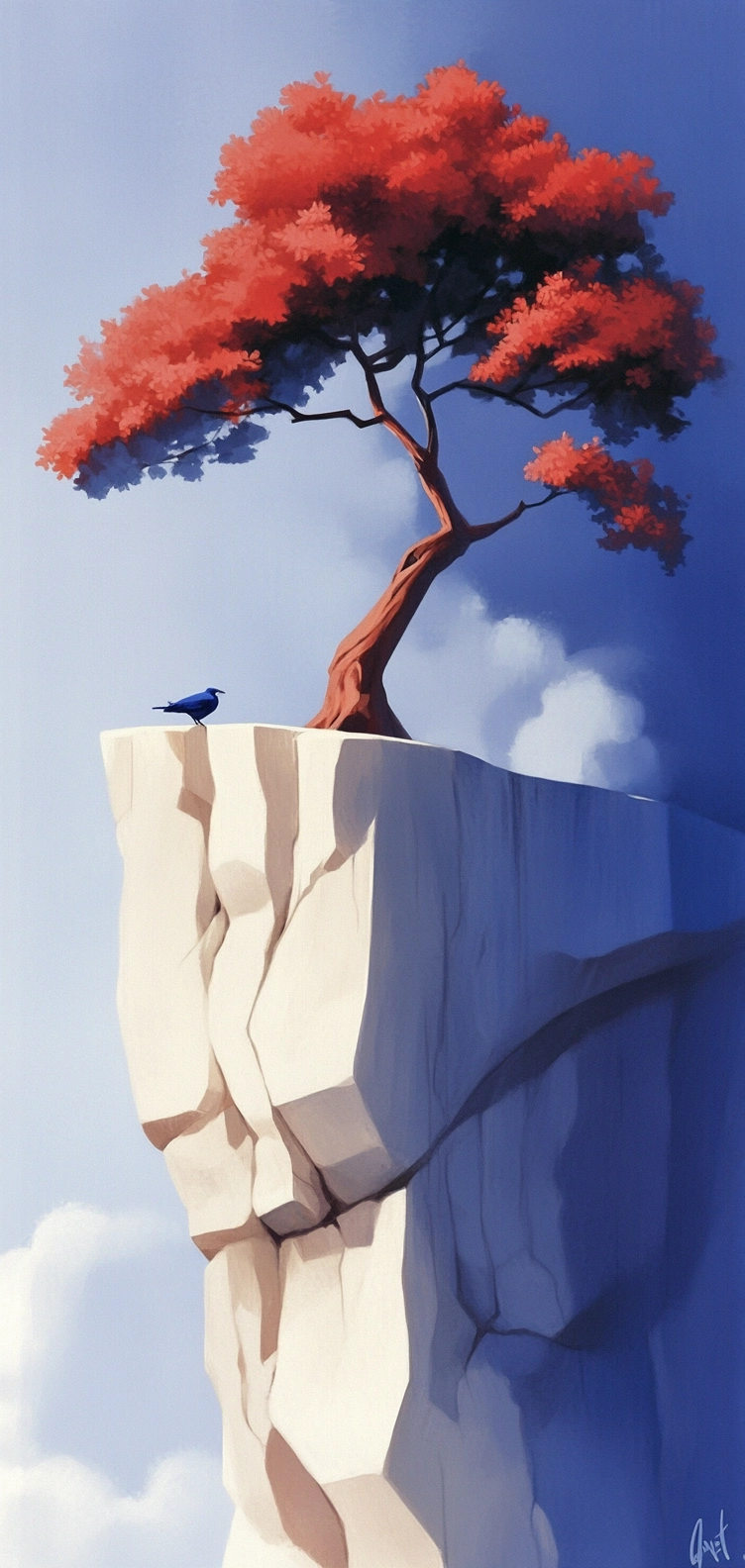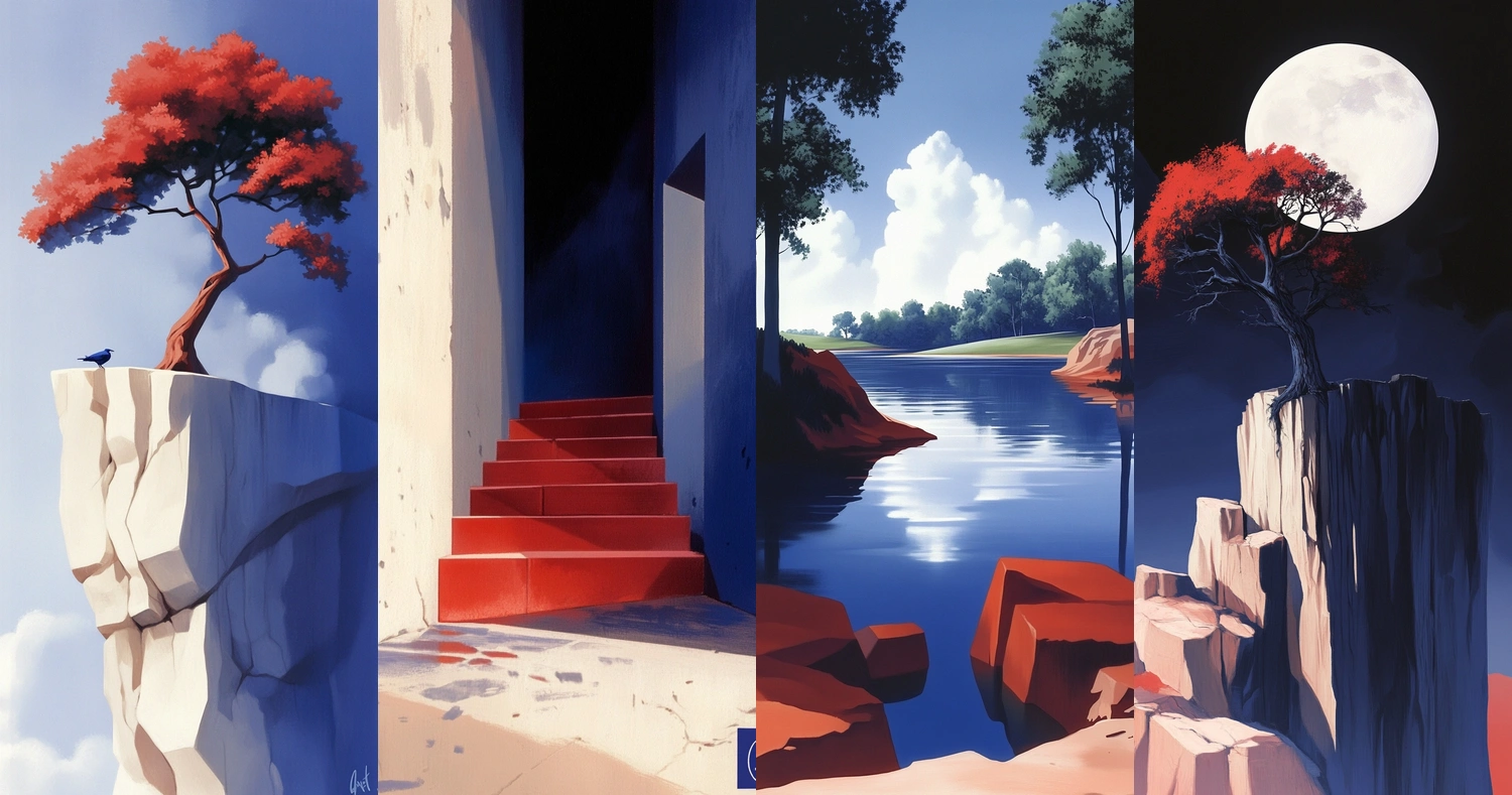Lighting effects emphasize sharp contrasts between bright reds and deep blues against a white backdrop. The spatial arrangement is deliberate, utilizing strong geometric lines, while textures appear smooth and polished.