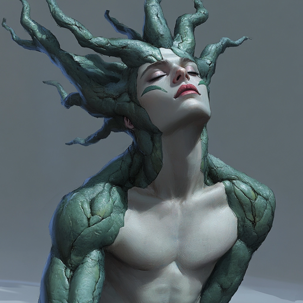 The lighting is sharp, accentuating the realistic textural details and volumes with balanced cool tones. There's a sculptural quality to the forms, supported by the nuanced play of light and shadow that adds depth, while smooth surfaces and shadows are distinct, highlighting each individual form.