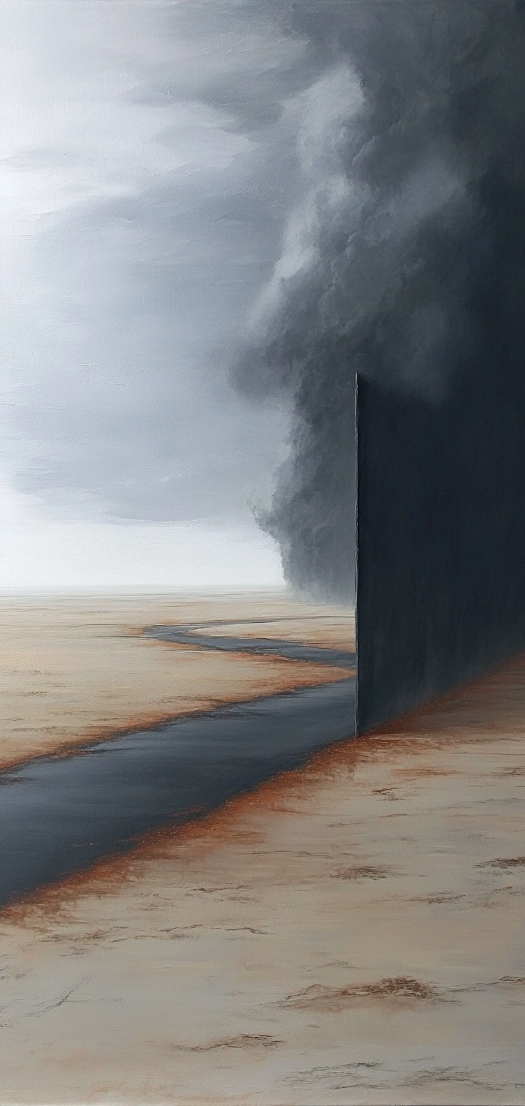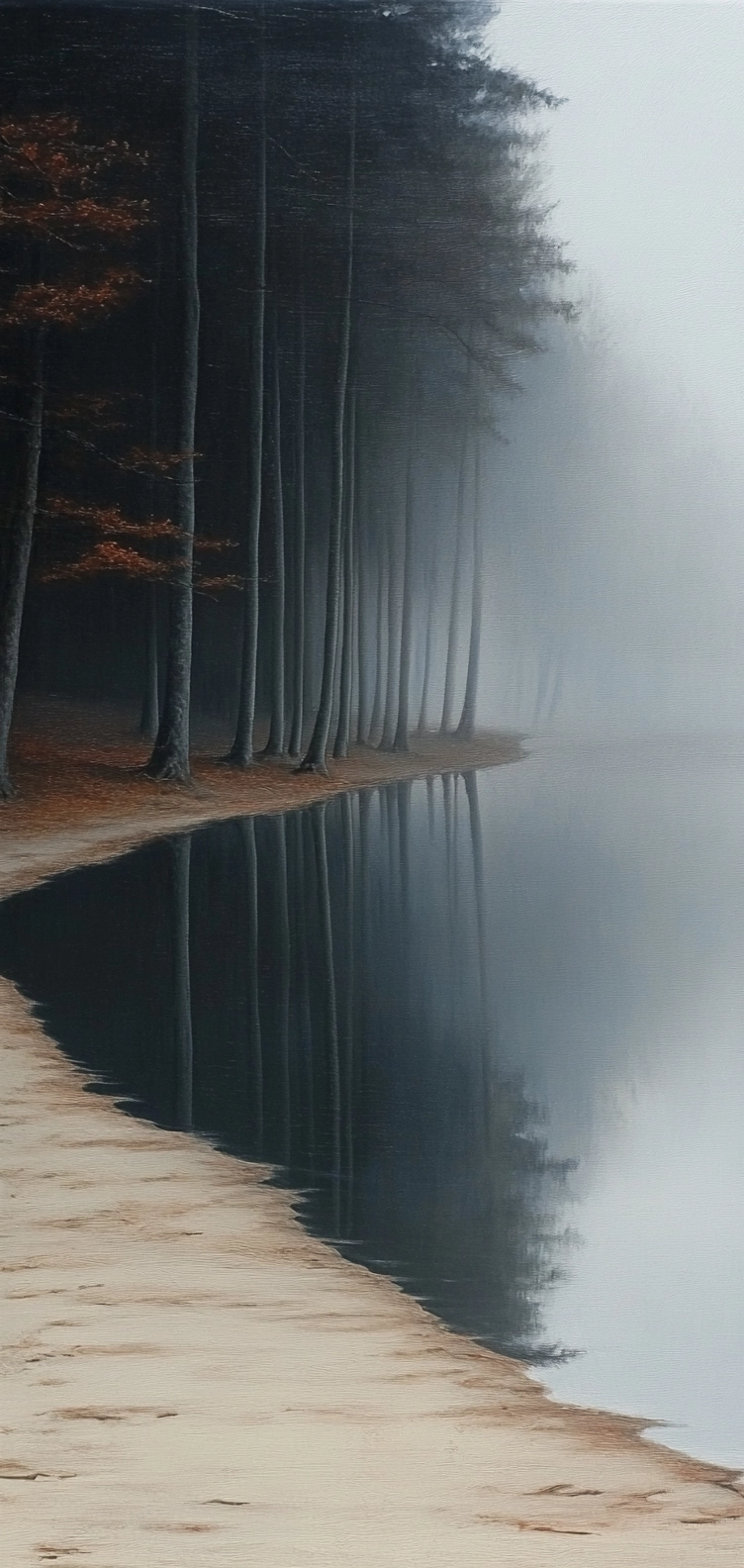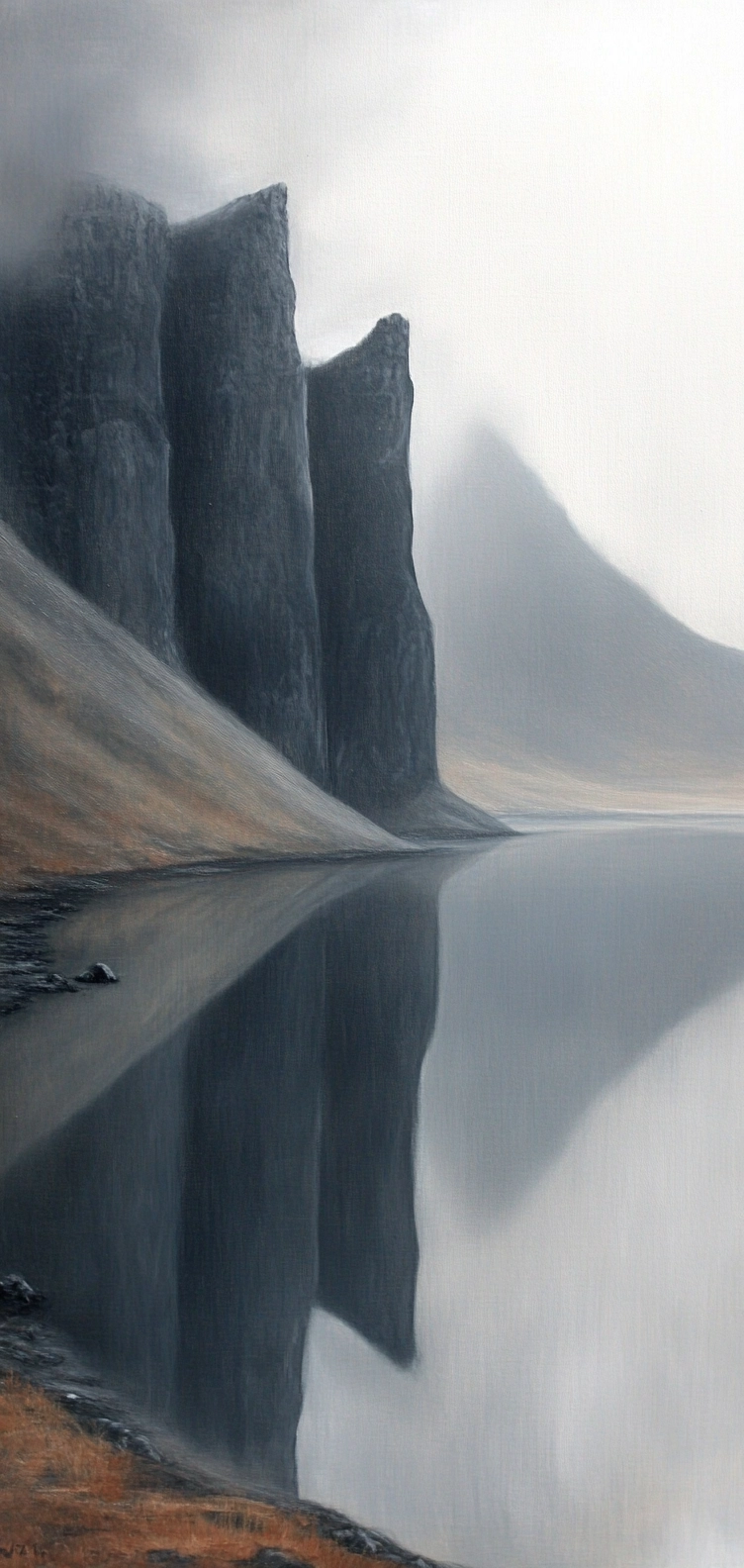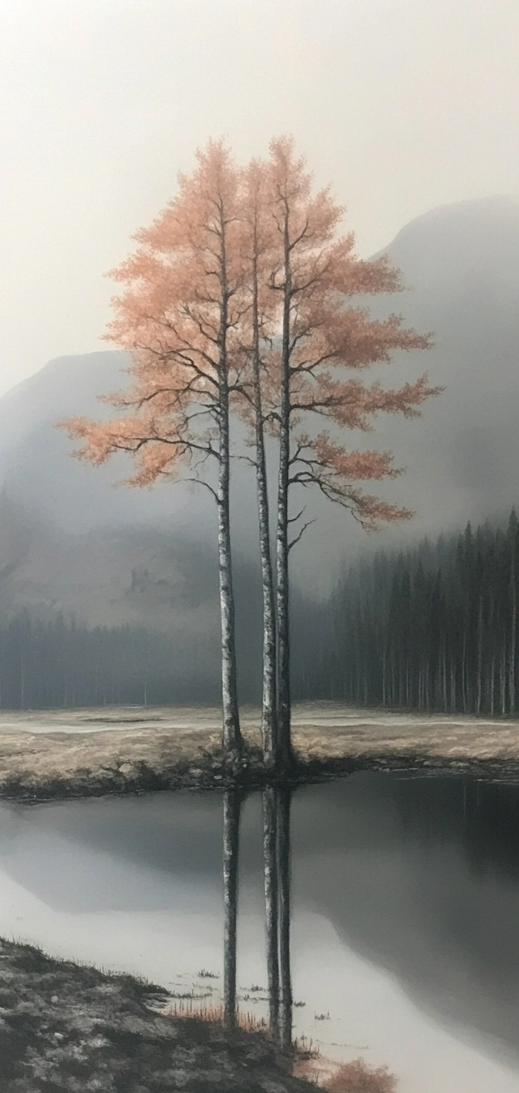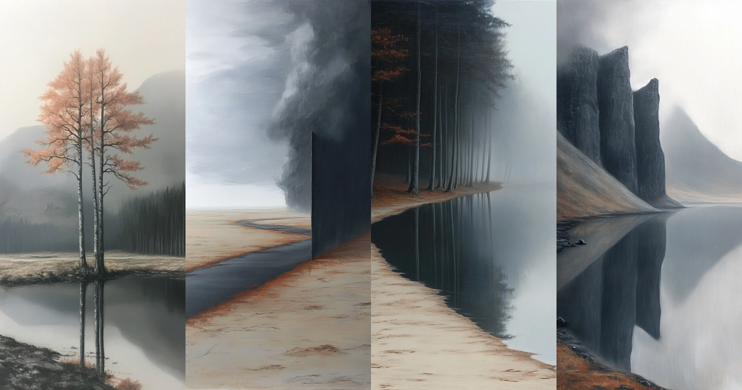 The use of sepia tones enhances earthy textures, with smooth gradients adding dimensionality. Reflections in water contribute to a strong vertical symmetry, while light diffuses gently across the scene.