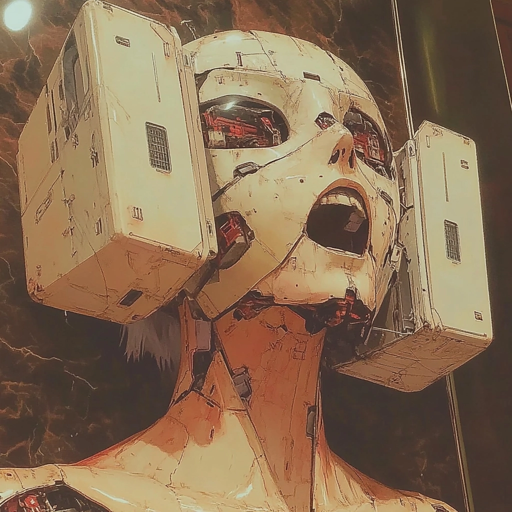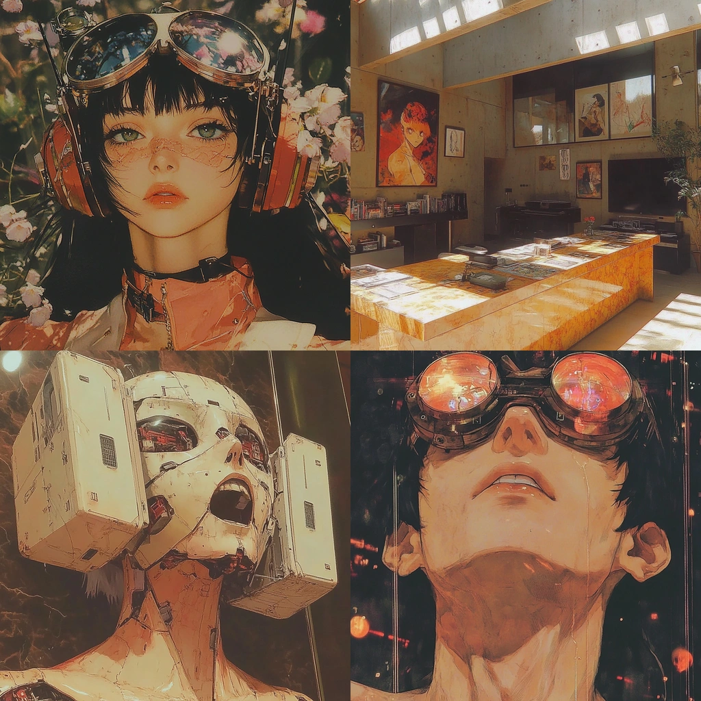 Muted sepia tones with industrial elements dominate the scenes, structured through harsh lines and a warm palette.