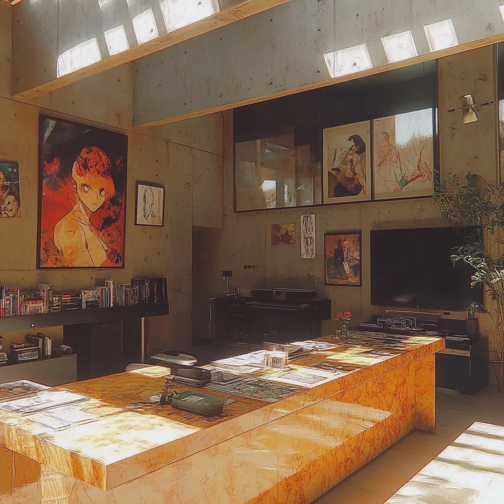 The lighting casts a soft glow enhancing the sepia tones, while the texture appears grainy, contributing to an industrial feel with a structured and boxy spatial arrangement.
