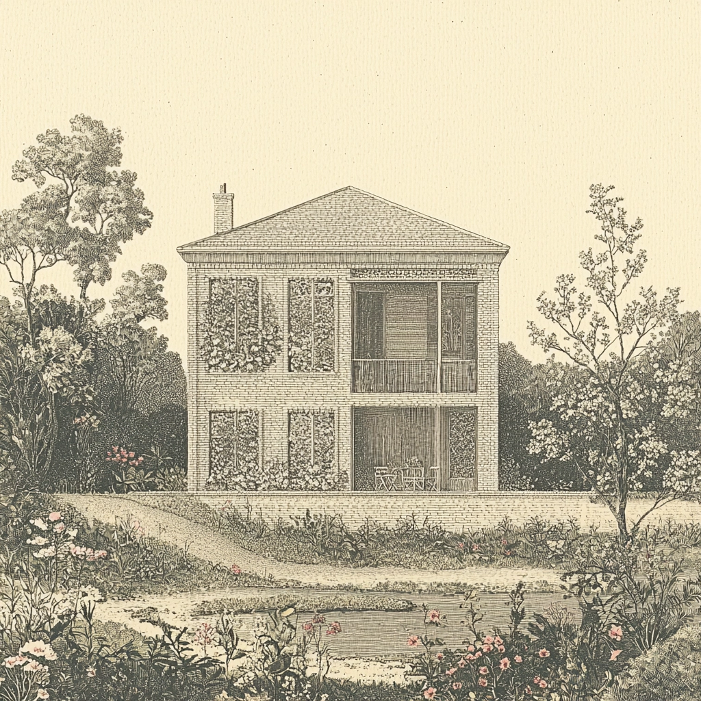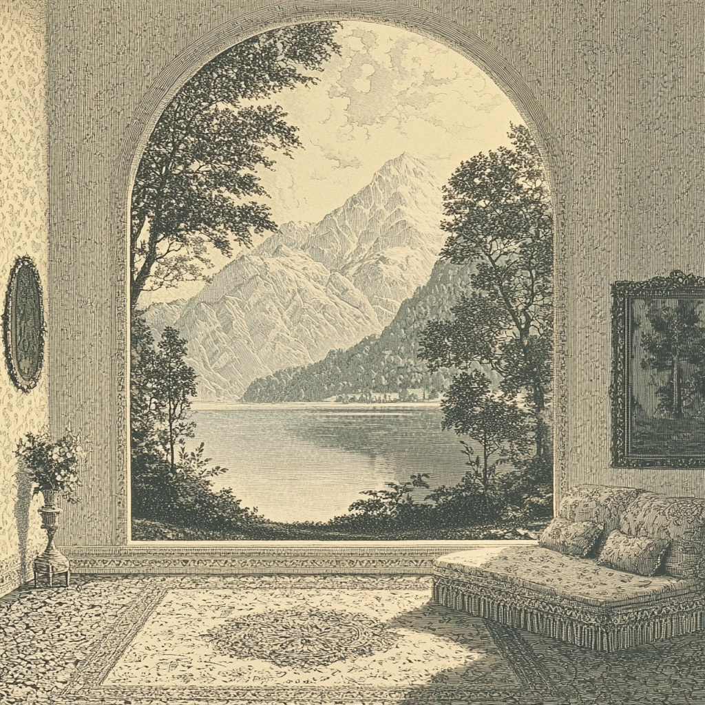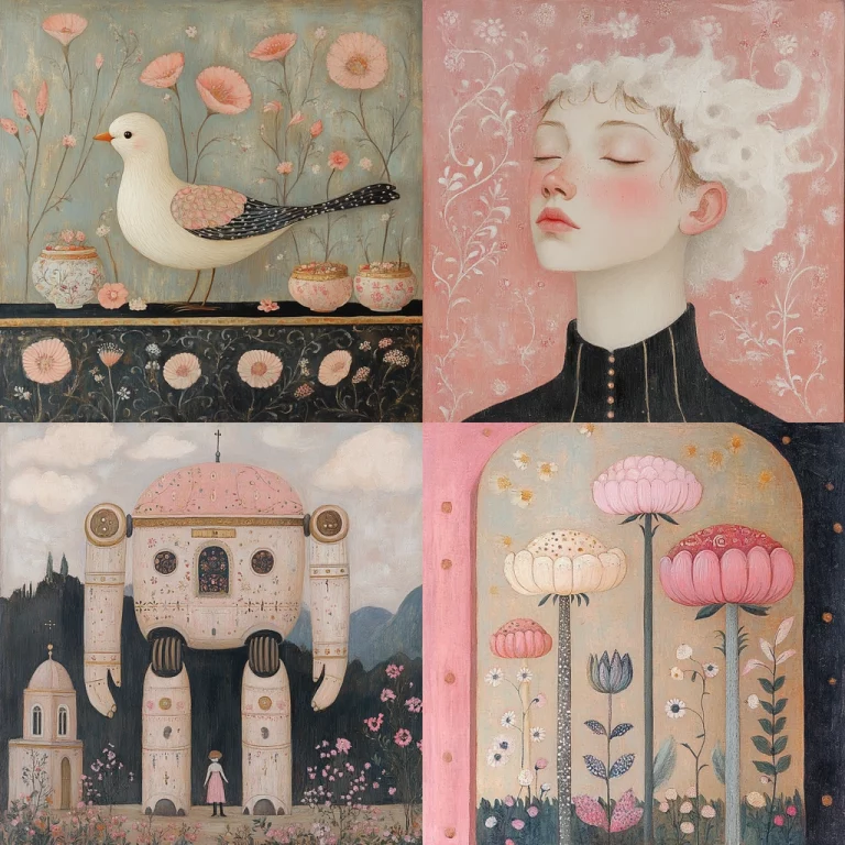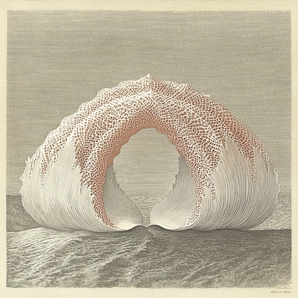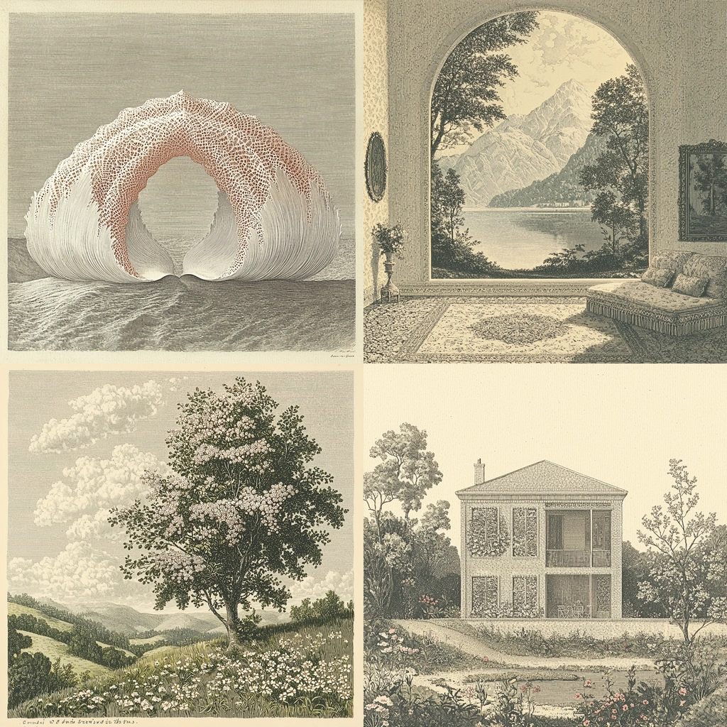 The lighting captures soft shadowing, while colors are subdued, imparting a calm quality to the forms. Space exhibits depth through layered elements, and textures are delicately and meticulously rendered.