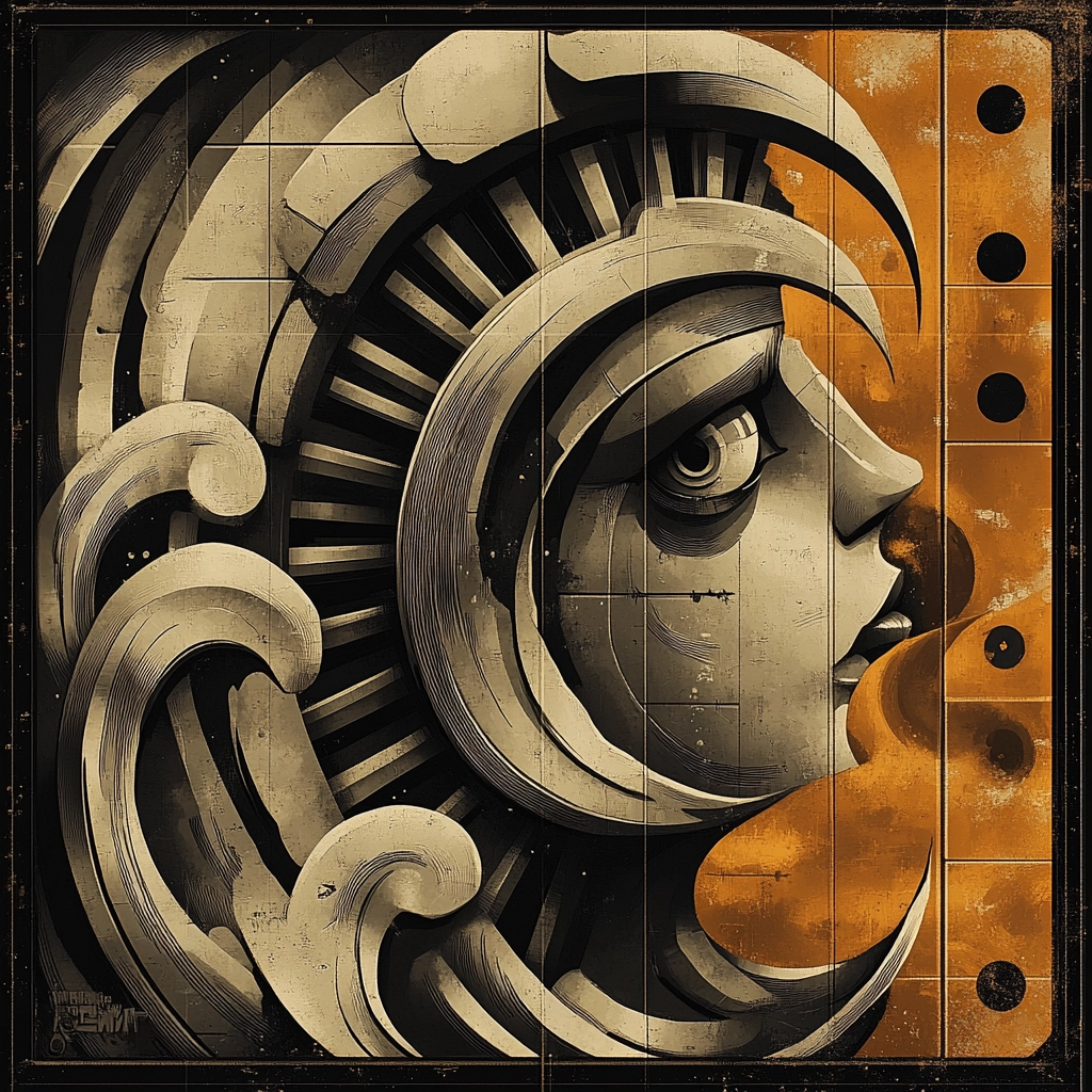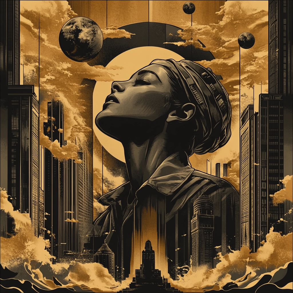 Dominant sepia tones create a nostalgic yet futuristic ambiance, while contrasting lighting adds depth. Sharp lines and intricate details provide a realistic texture that enhances the urban landscape.