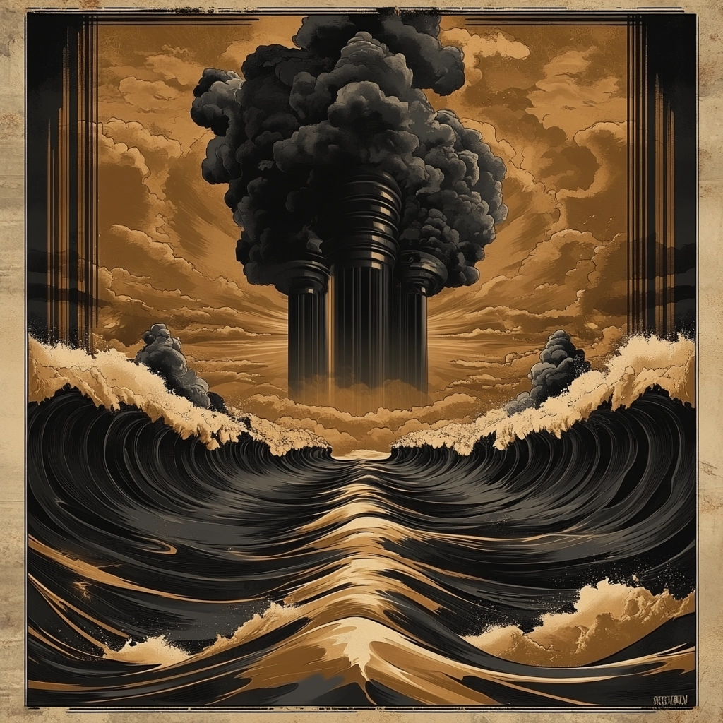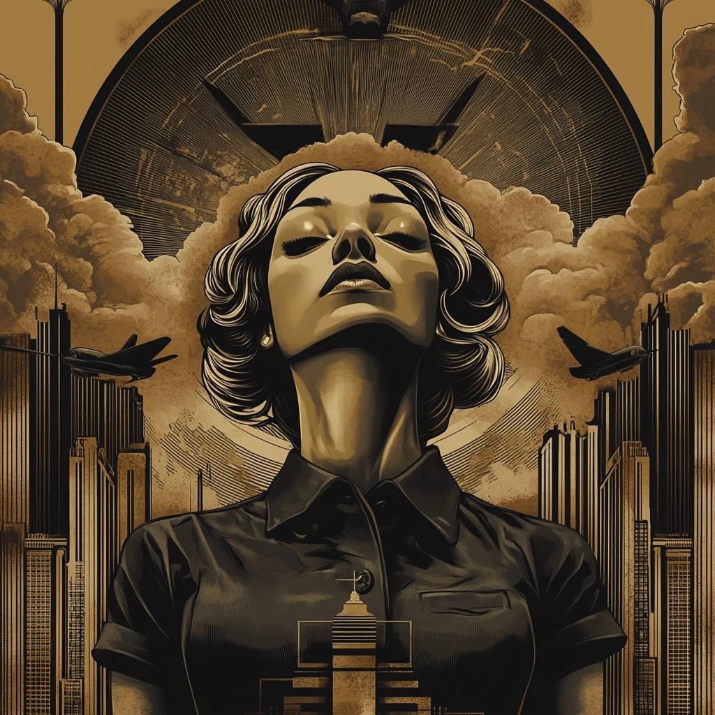 The composition blends industrial motifs with sepia toning for a distinct, futuristic interpretation.