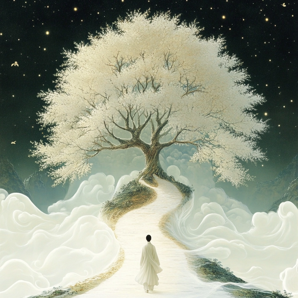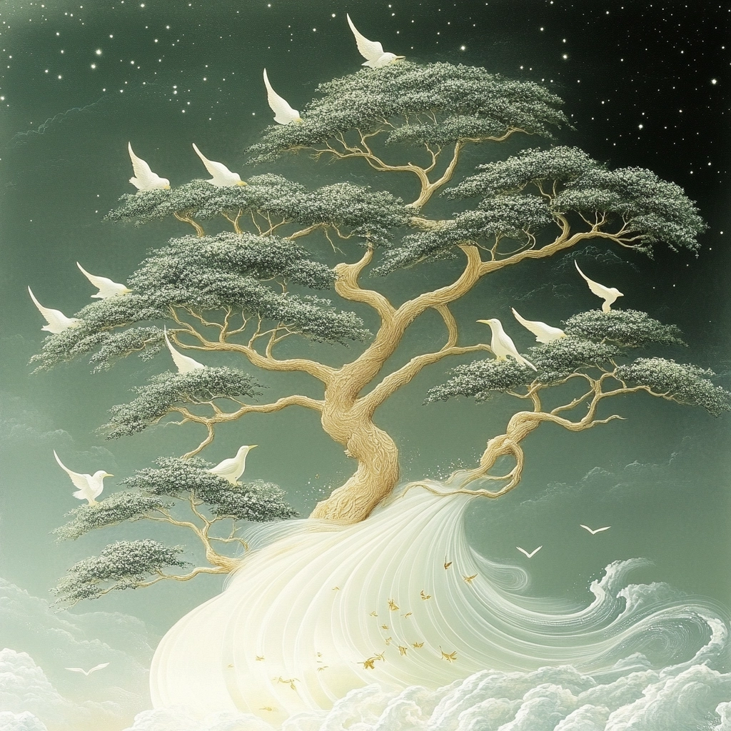 The lighting is soft, creating a gentle glow that enhances the subtleties of the compositions. Colors are pale, predominantly white and green, lending a soothing quality. There is a strong sense of depth achieved through meticulous detailing and layering. The textures are smooth yet detailed, particularly in natural elements, which adds to the overall ethereal quality of the scenes.