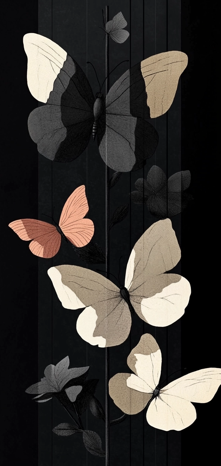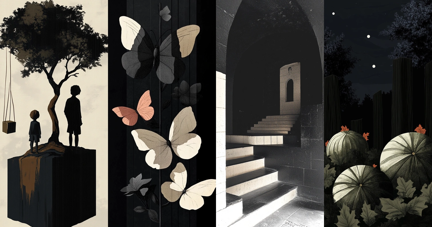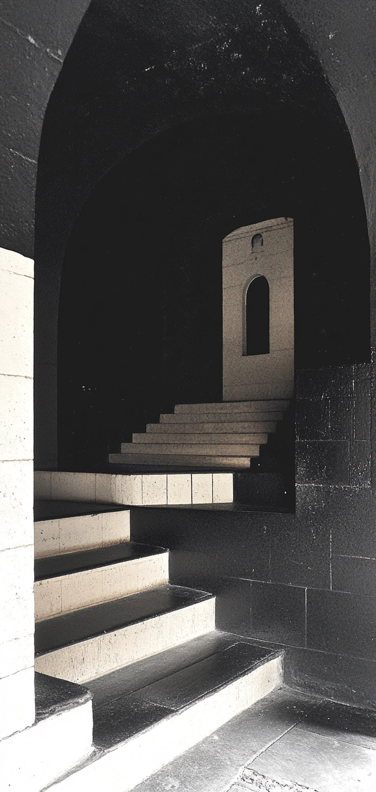 Strong interplay of light and shadow creates dynamic forms, with a balanced composition of muted black, white, and gray tones. Minimal textures emphasize the stark contrasts and silhouette effects.