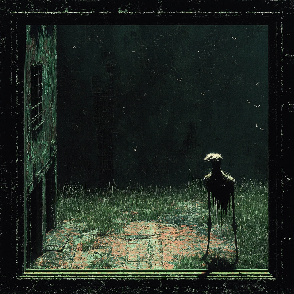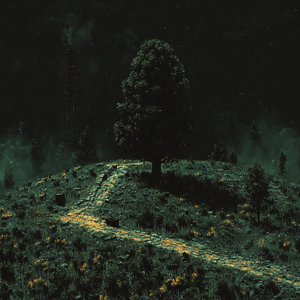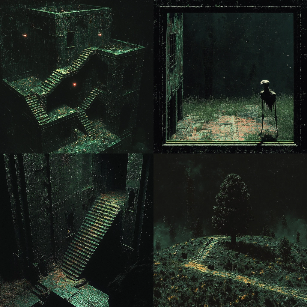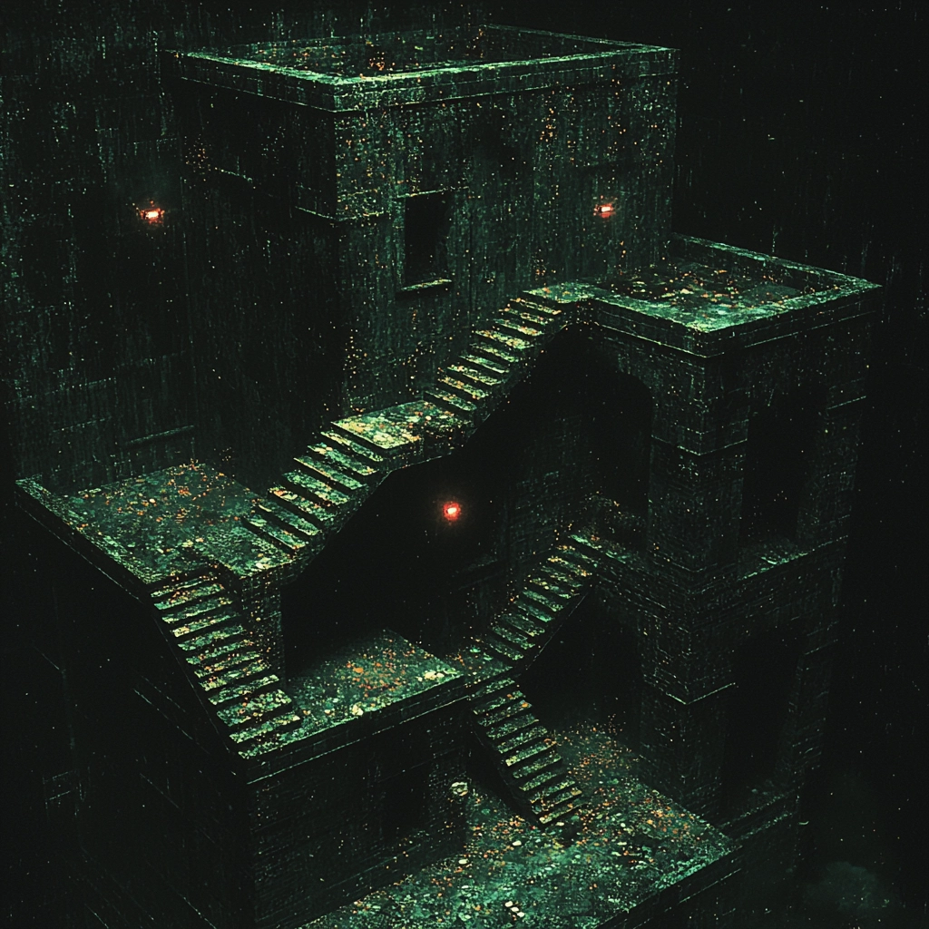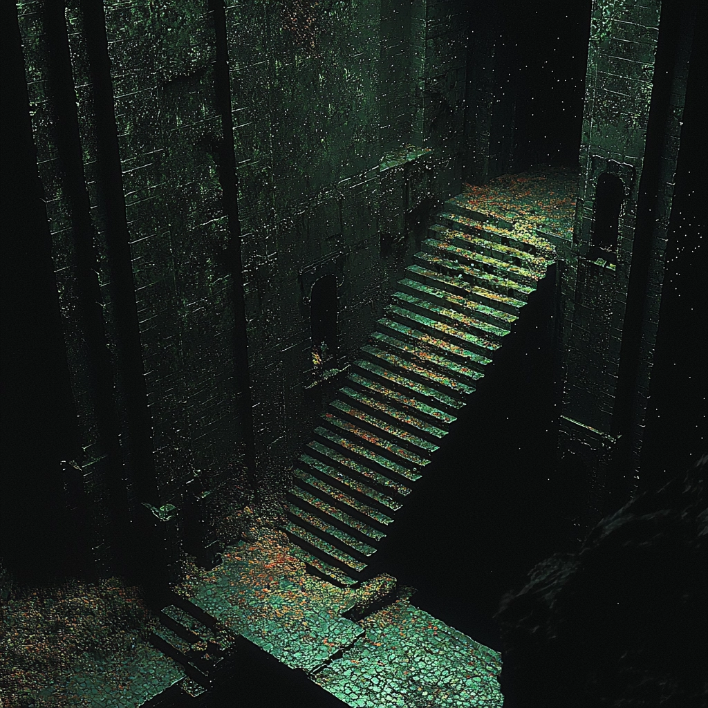 Soft lighting casts shadows across the surfaces, enhancing the rough textures of the stone. Green dominates the palette with patches of brown creating a sense of wear. The composition draws the eye to the pathway's distant focus.
