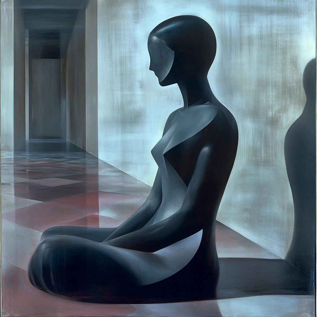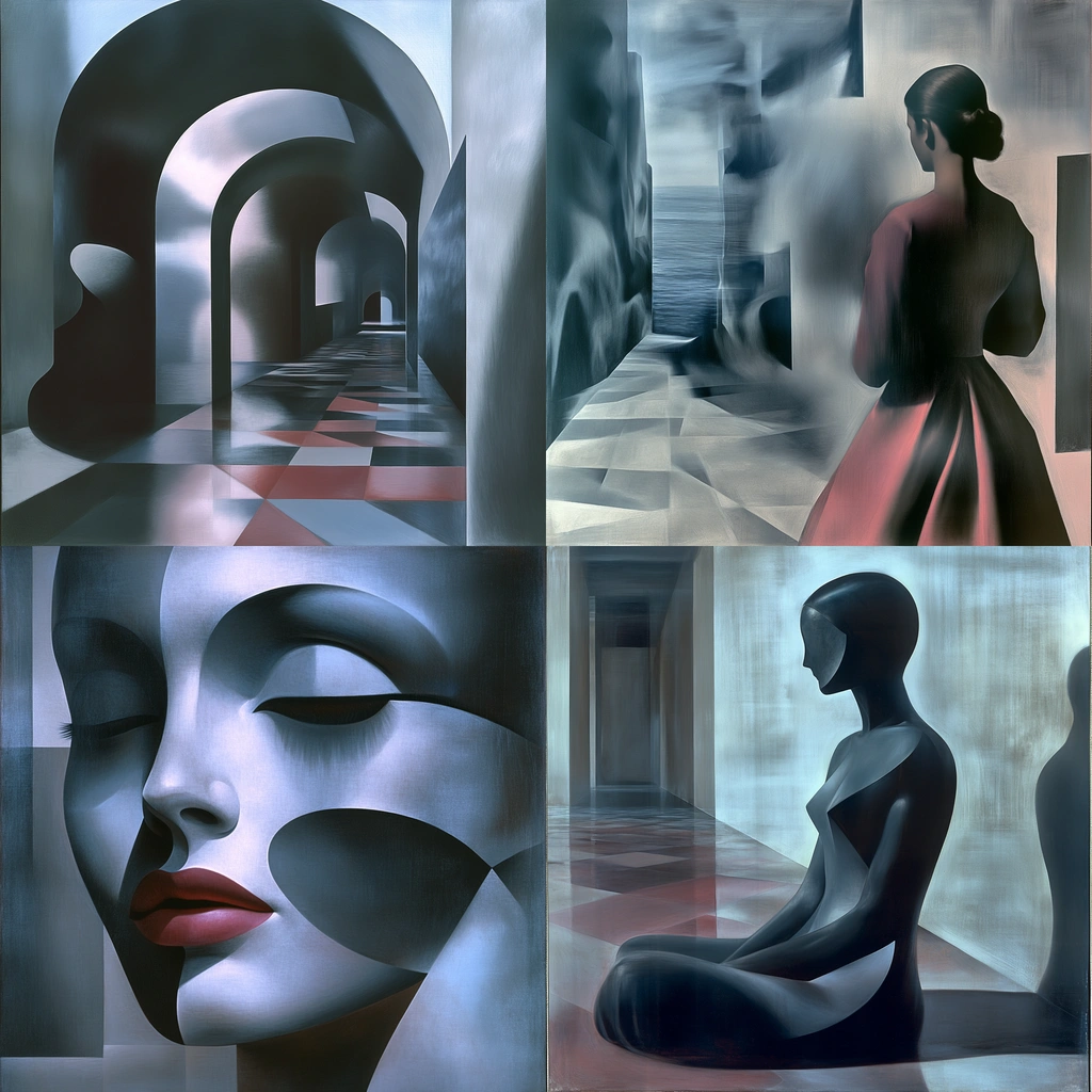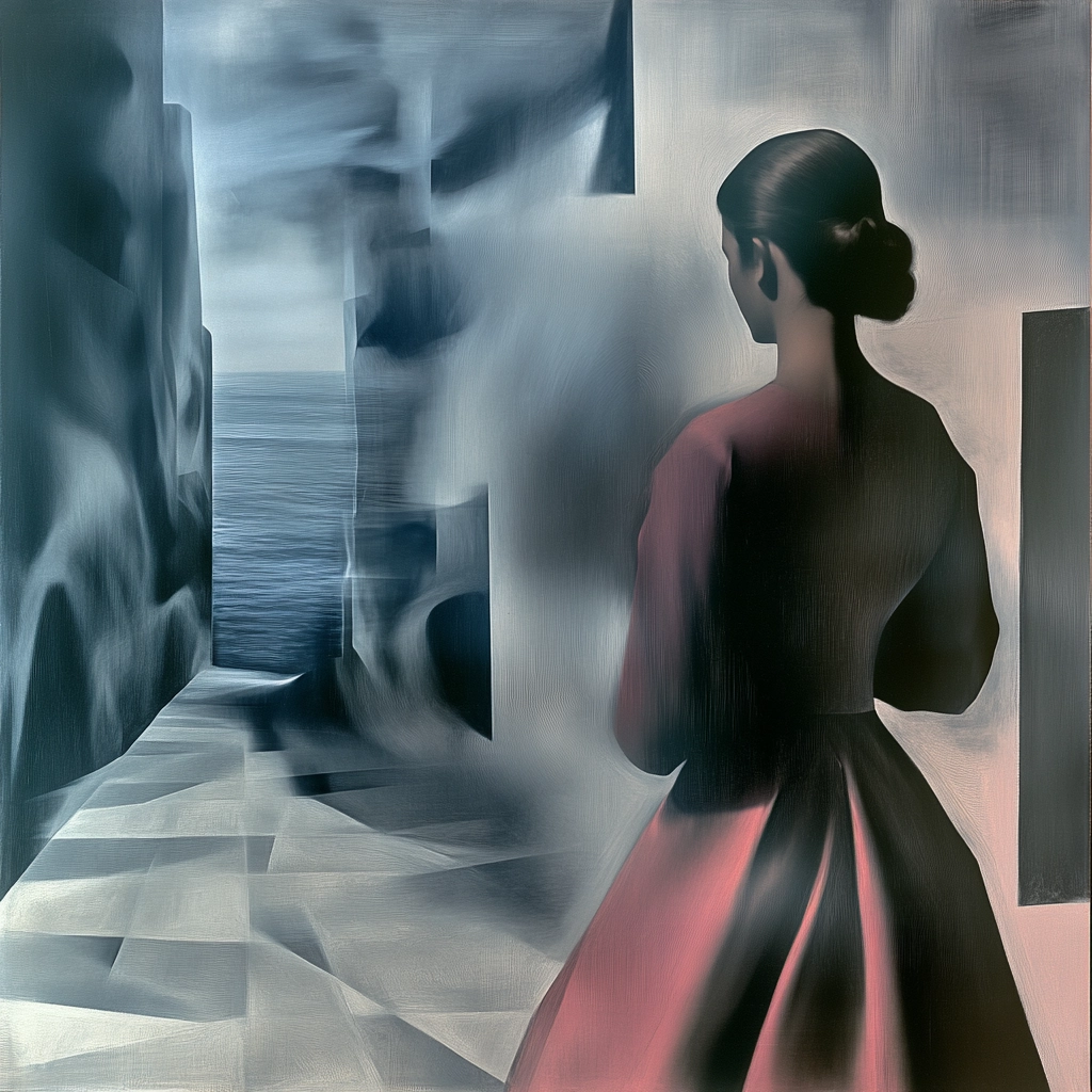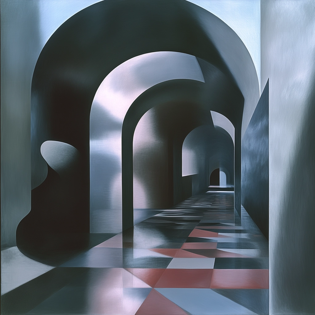 The lighting suggests a somber tone, with shadows softly merging into subtle highlights. Colors are muted, dominated by gray tones with occasional vibrant red, creating a sense of elongated spaces with gradient textures.