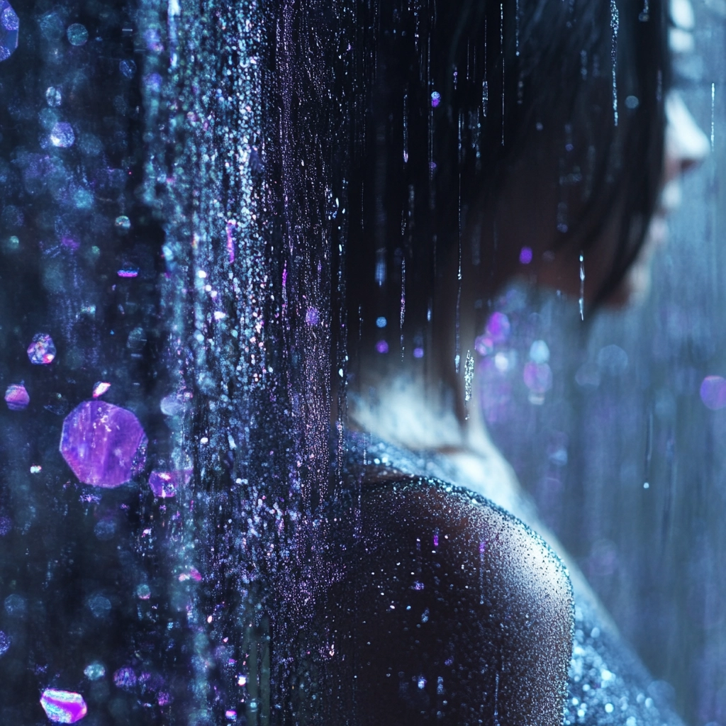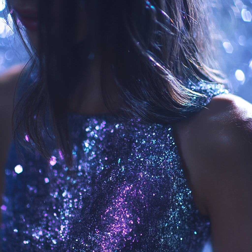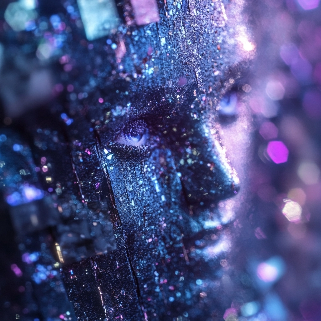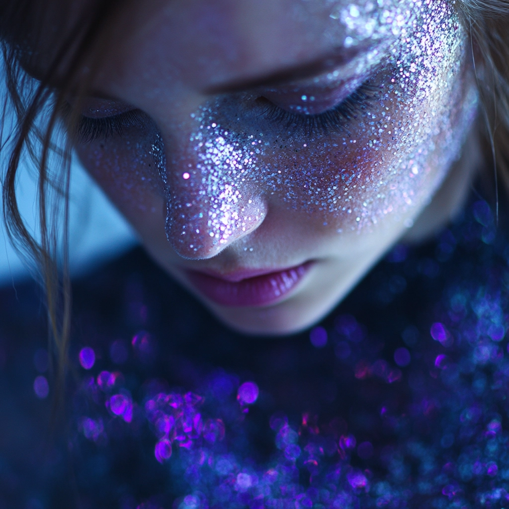 The sparkling reflections and shimmering glints create a dynamic lighting effect, bringing a vivid and immersive quality. The cyan and purple colors dominate, evoking a sense of depth and subtle luminosity. The texture appears almost tangible, enhancing the visual richness.