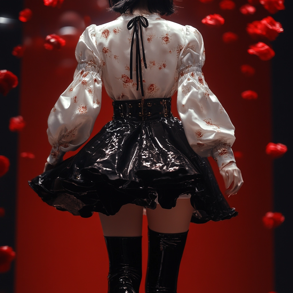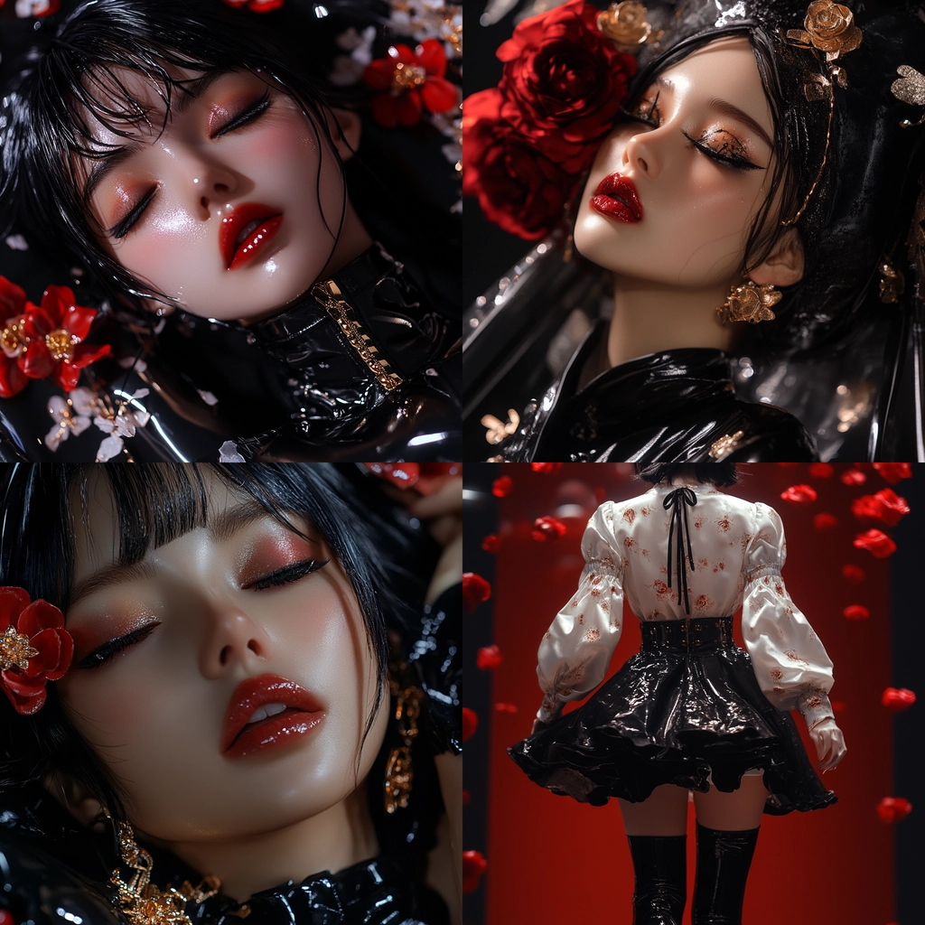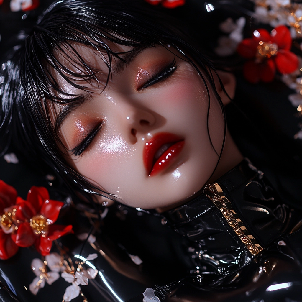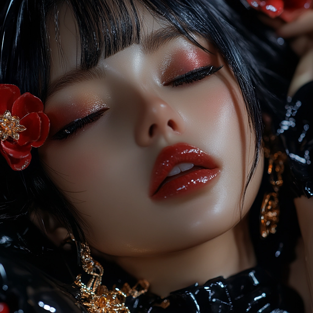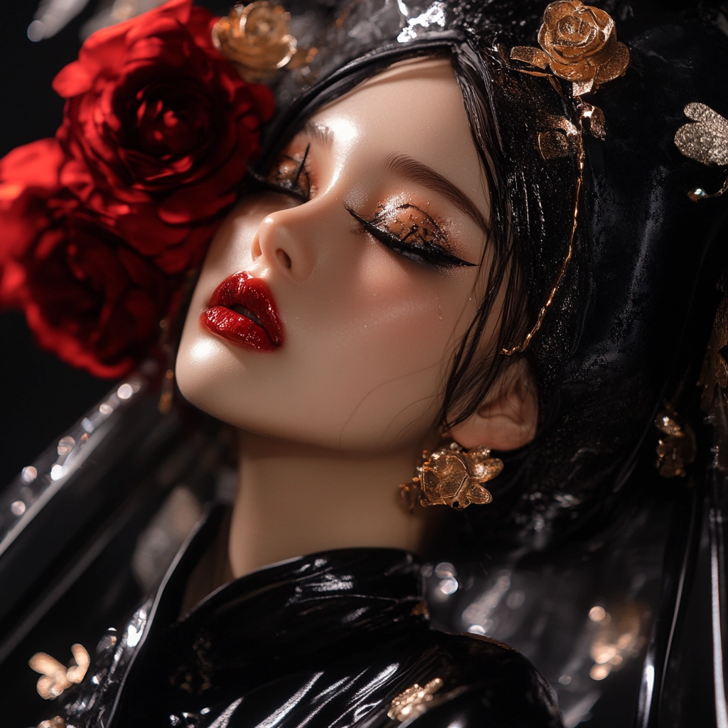 The use of reflective black creates deep highlights, while the vibrant red offers visual depth with a rich, layered sensation. Silky textures are enhanced by golden accents, adding a opulent touch to the arrangement's dimensional space.