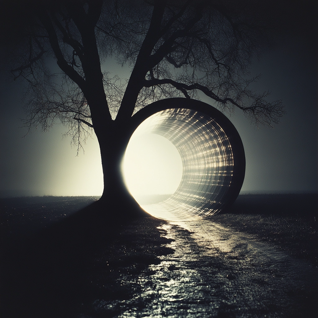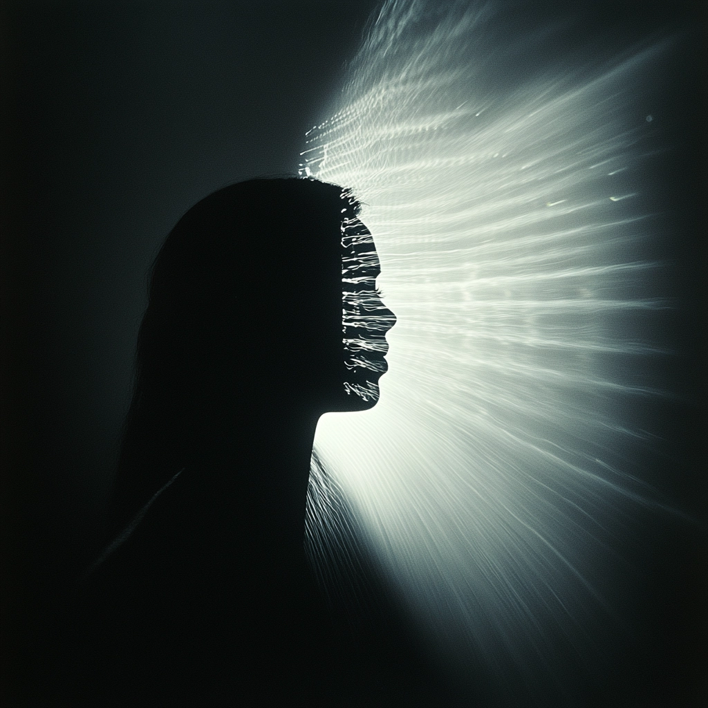 The composition contrasts intense light against deep shadow with stark linear patterns.