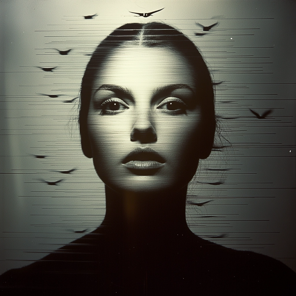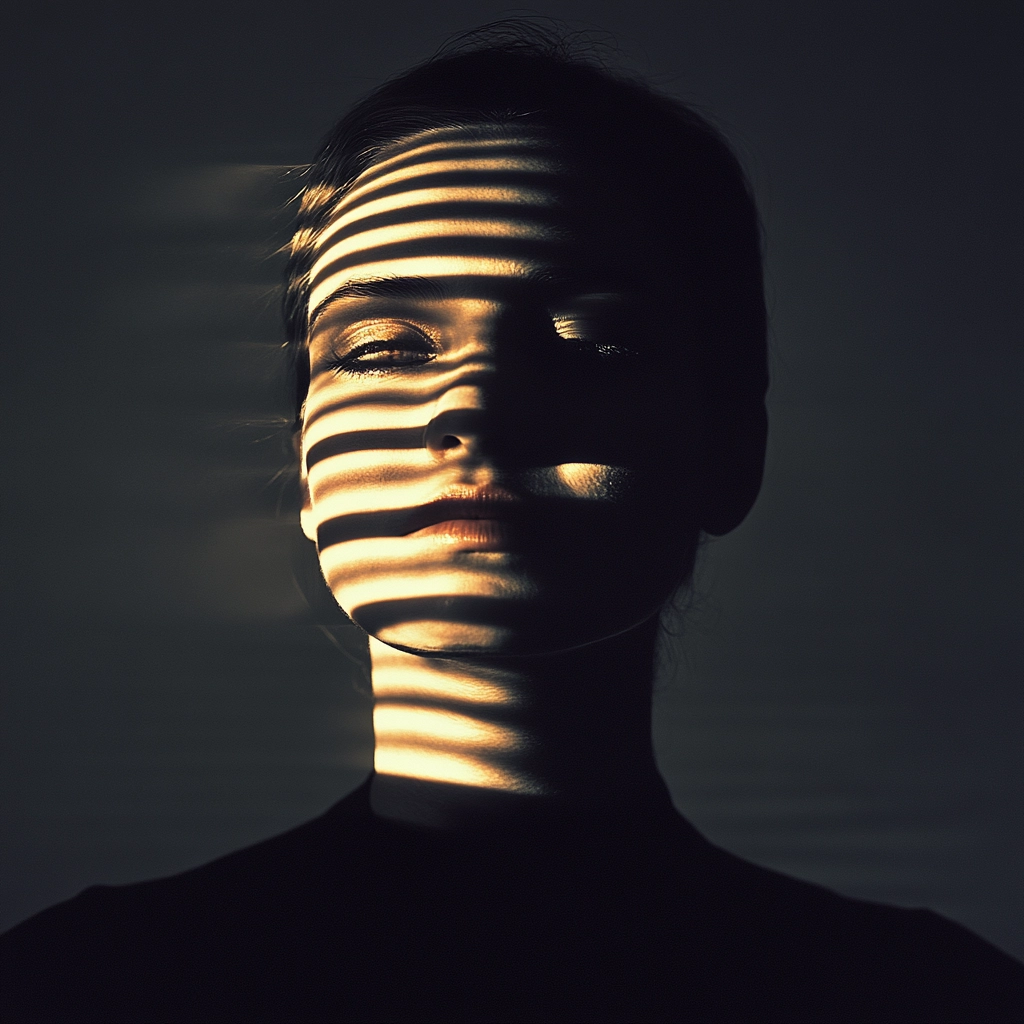 The lighting effects highlight the contrast between light and shadow, creating bold silhouettes. Sharp, directional light patterns introduce a spatial depth. The textures appear smooth, emphasizing the interplay of shadow and light for dramatic impact.