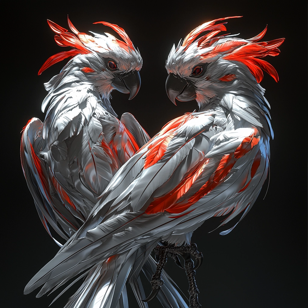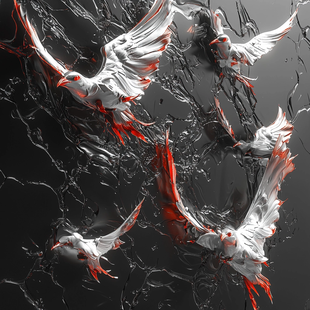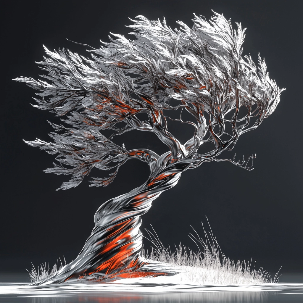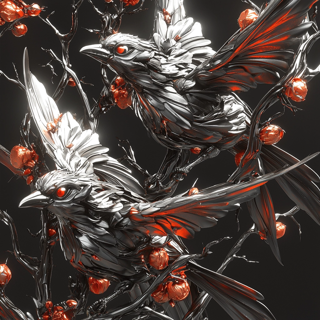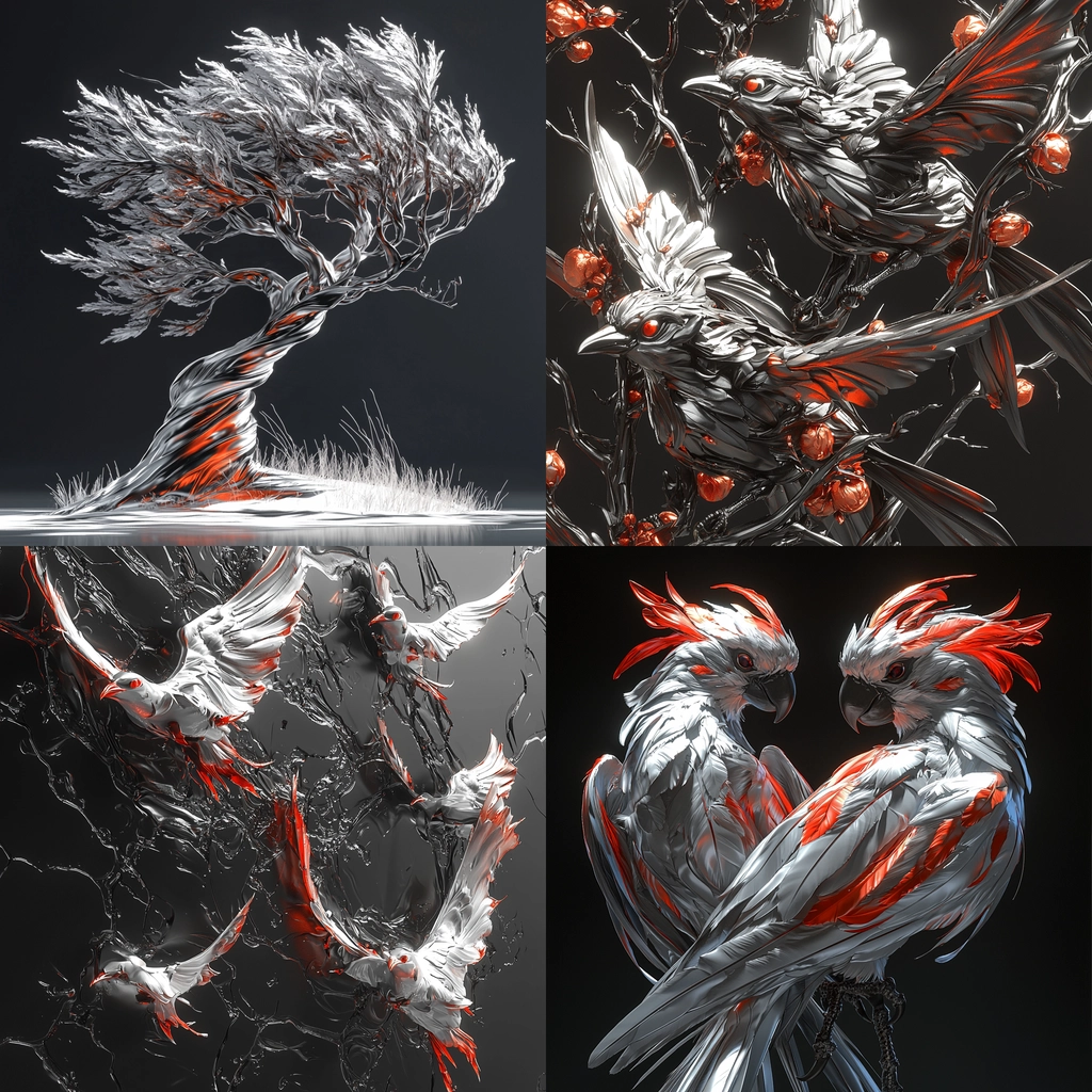 Lighting effects enhance the metallic sheen, creating reflective surfaces. Bold silver forms dominate spaces with red interruptions emphasizing details. Fluid textures suggest movement and dynamism. Silver surfaces convey depth with strategic lighting.