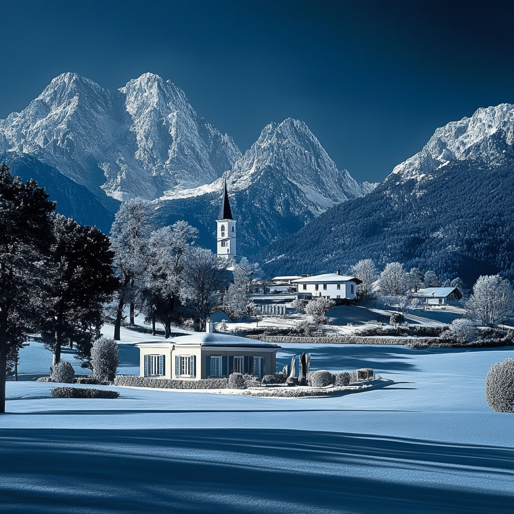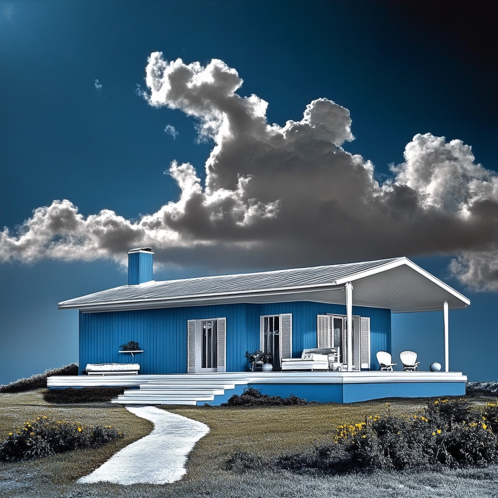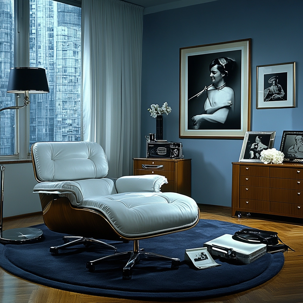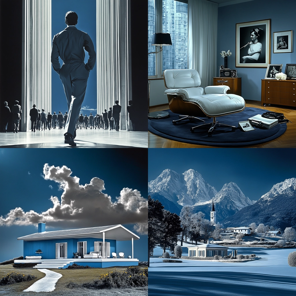 Strong lighting highlights shapes, creating contrast with shadowed areas. The color palette features cool tones like dark blue and gray, ensuring a sleek feel. Sharp textures accentuate the sense of depth and spatial structure.