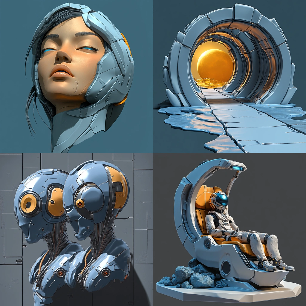 The lighting is precise and clean, highlighting the smooth and polished texture of the surfaces. Colors are vivid and well-defined, enhancing the sense of structure and advanced design. Spatial arrangements emphasize depth and innovative forms.