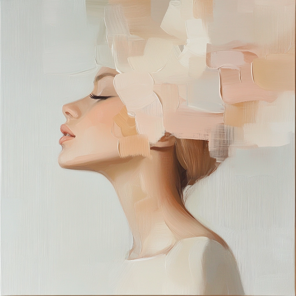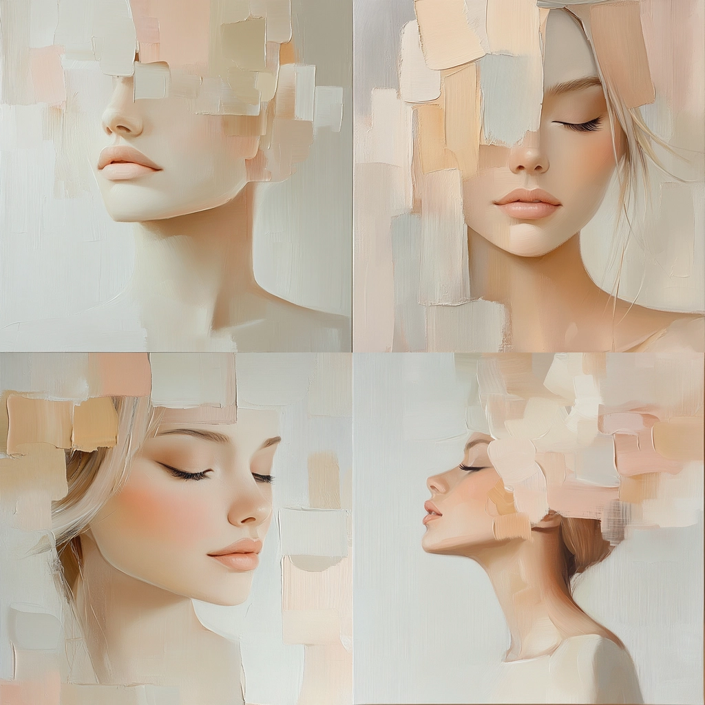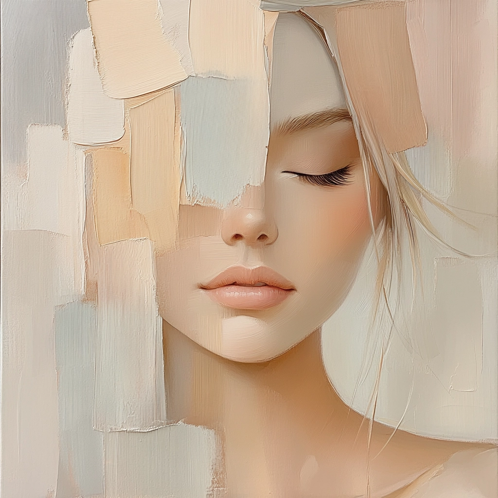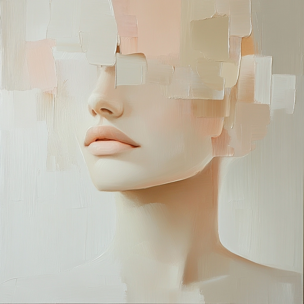 Muted pastel hues combine with fragmented shapes, creating a delicate and ethereal appearance.